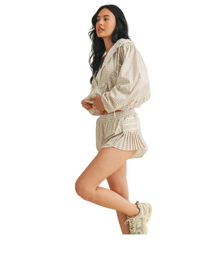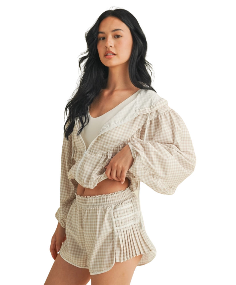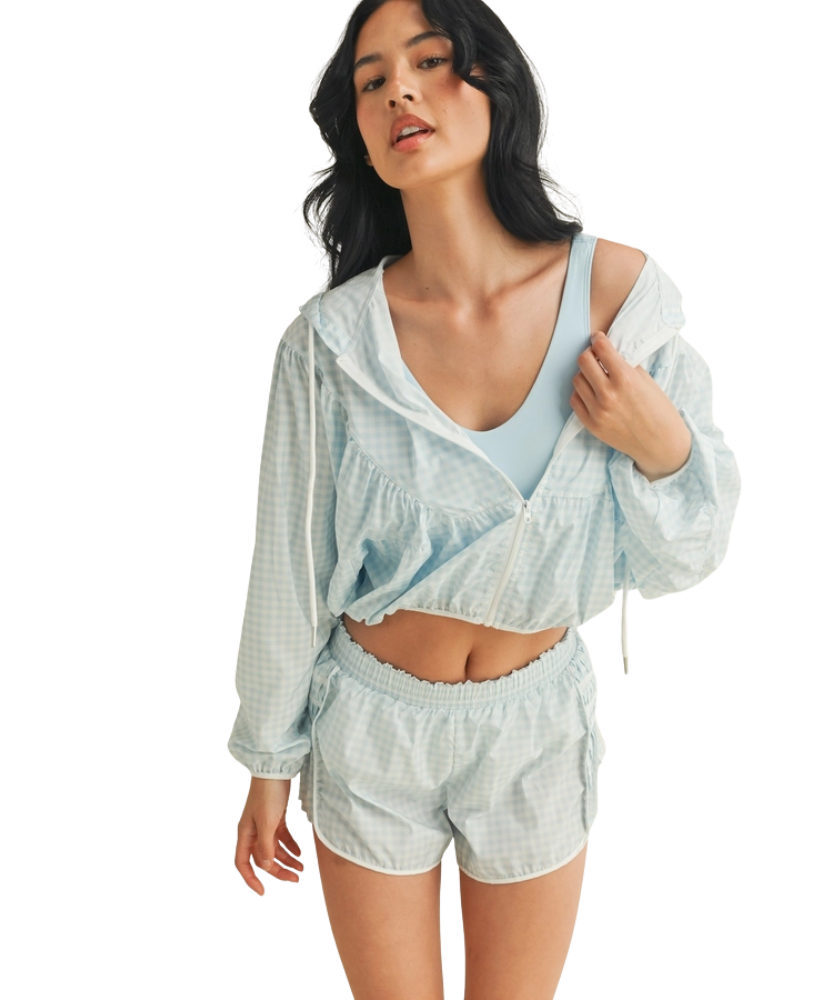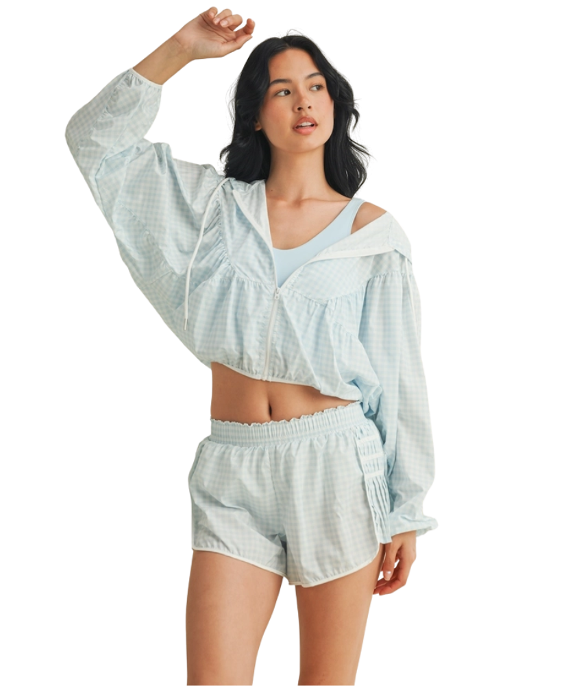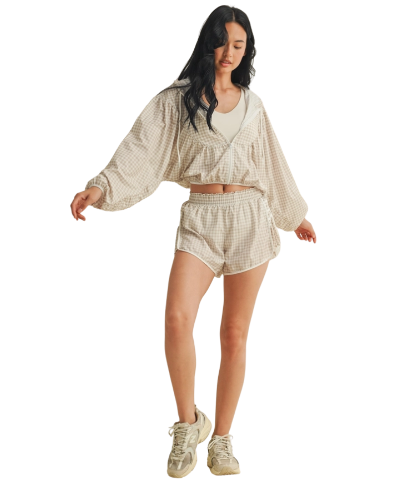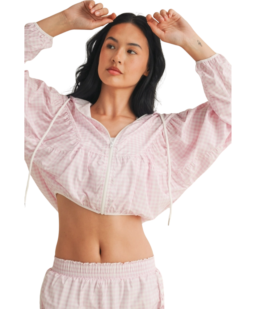 Ready when you are—the Gingham Go-Time Lightweight Jacket is your new favorite grab-and-go layer. Made with breezy, breathable fabric and a charming pink gingham print, this windbreaker keeps things cool and cute whether you're heading to the gym, running errands, or lounging in style. Designed with a full zip front, roomy sleeves, and an adjustable drawstring hood for that perfect fit. Even better? It pairs perfectly with our Gingham Go-Time Shorts for a matching moment.