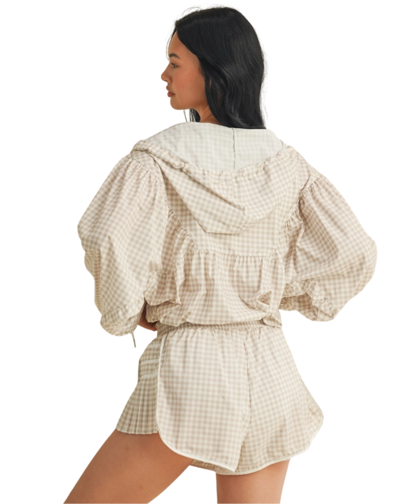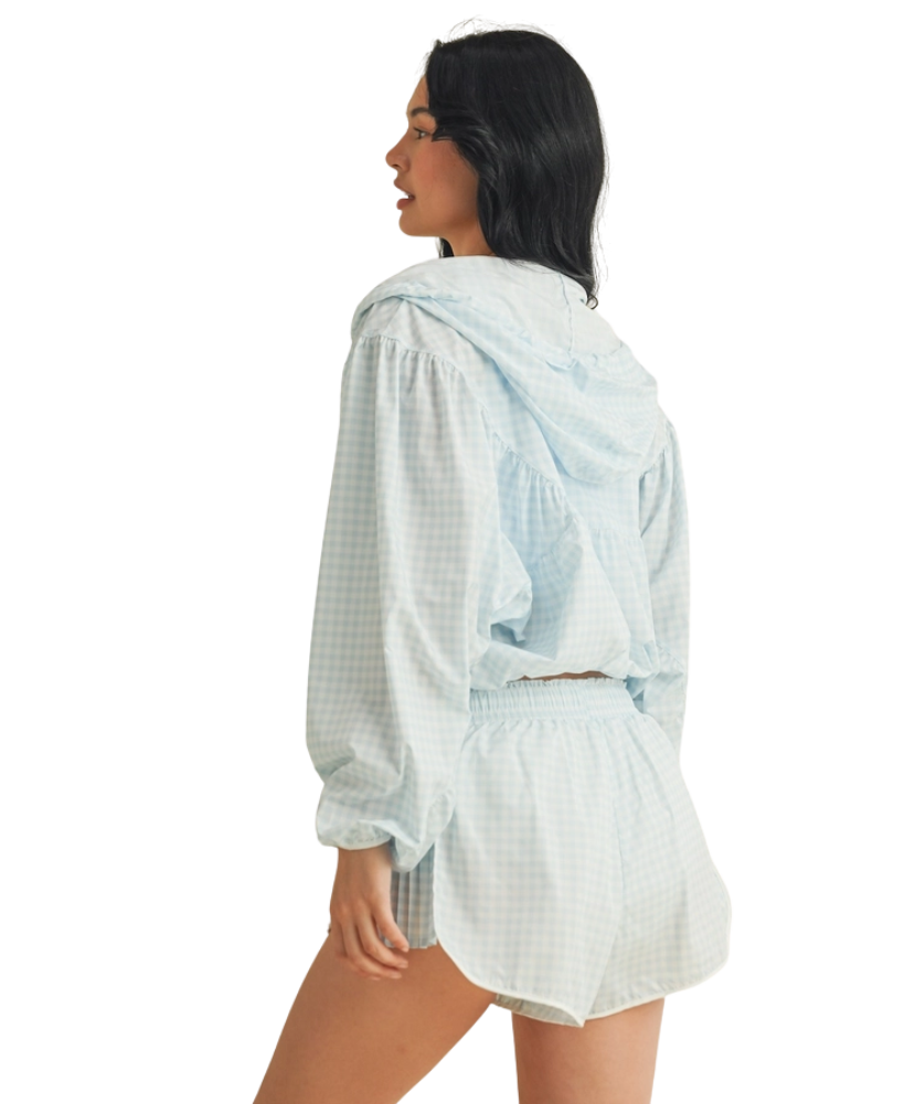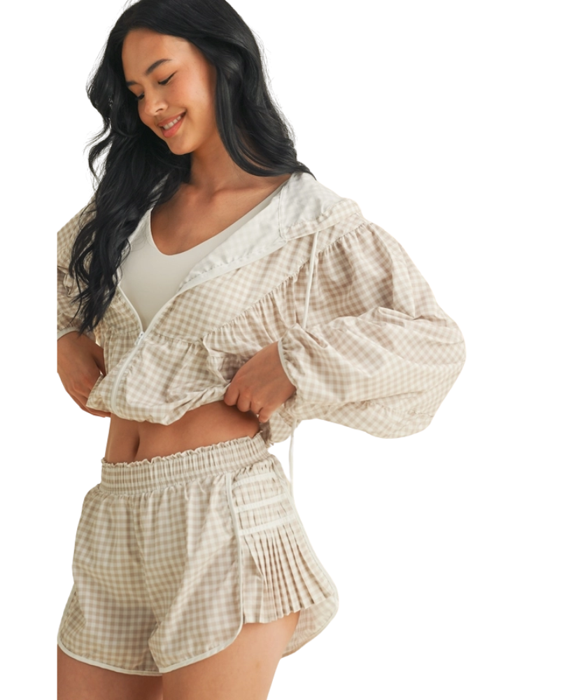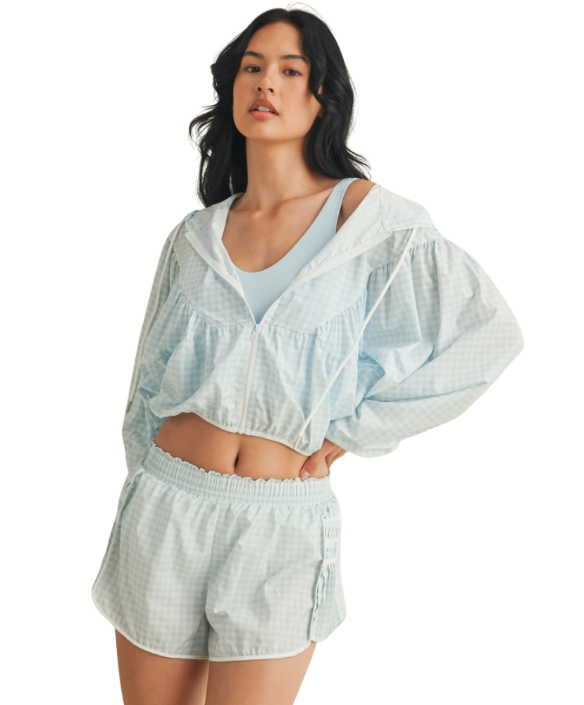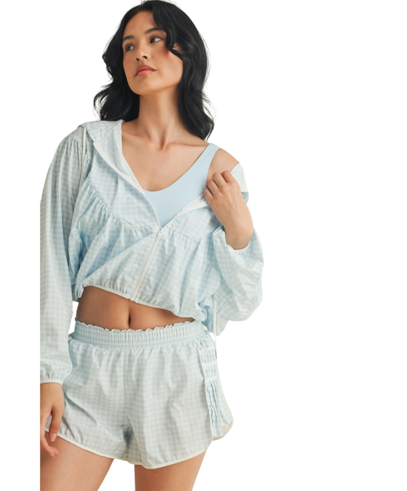 Ready when you are—the Gingham Go-Time Lightweight Jacket is your new favorite grab-and-go layer. Made with breezy, breathable fabric and a charming pink gingham print, this windbreaker keeps things cool and cute whether you're heading to the gym, running errands, or lounging in style. Designed with a full zip front, roomy sleeves, and an adjustable drawstring hood for that perfect fit. Even better? It pairs perfectly with our Gingham Go-Time Shorts for a matching moment.