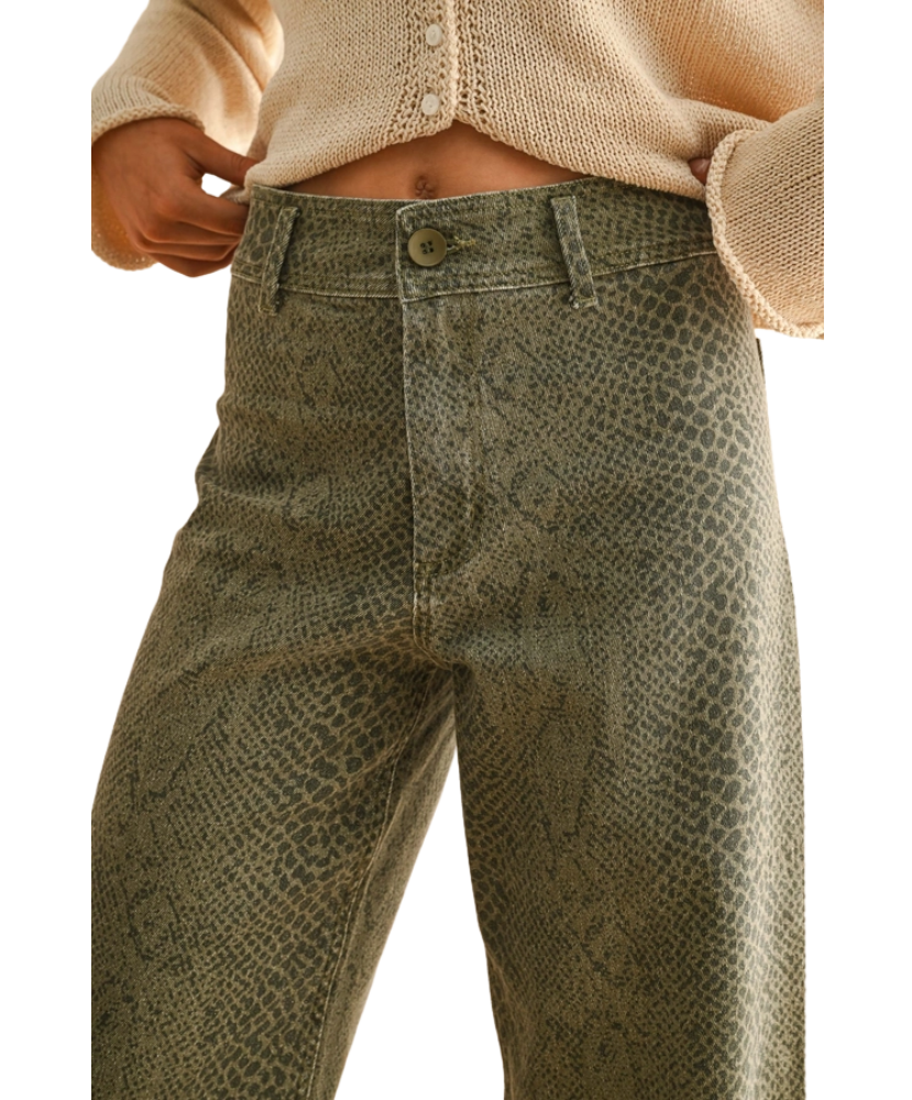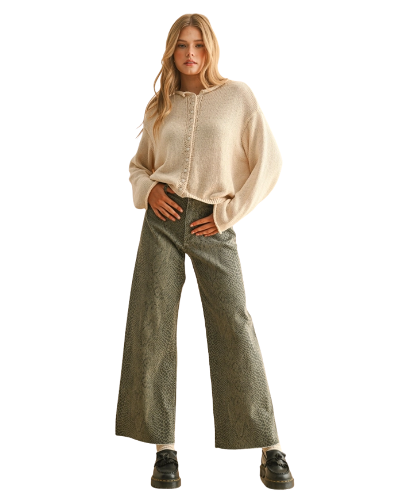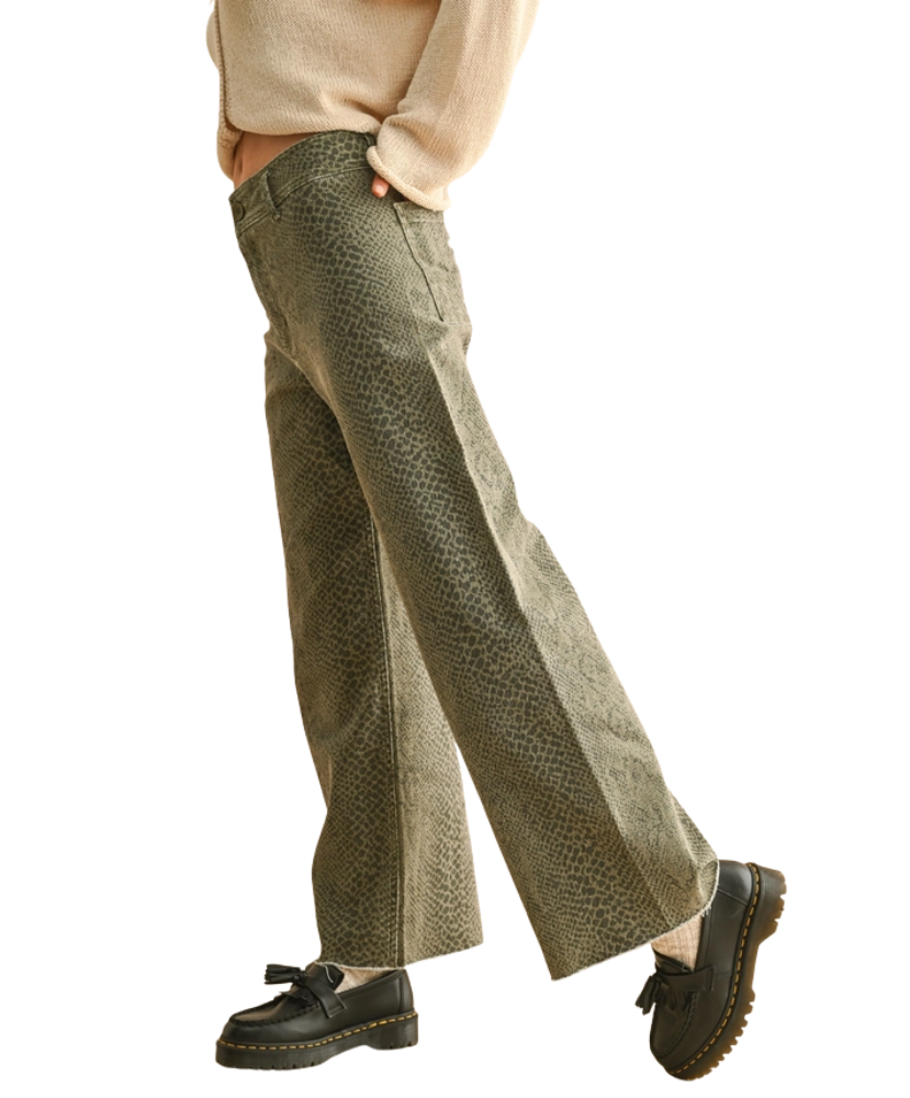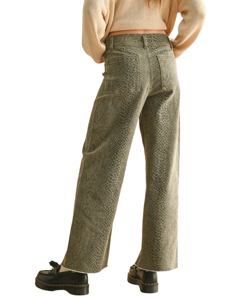 Meet your new statement-makers. The Sadie Snake Print Pants bring bold energy with a sleek, snakeskin-inspired design that’s anything but basic. Cut from a soft cotton-spandex blend, they’ve got just enough stretch to keep you comfy while you turn heads. The wide-leg fit is effortlessly cool, making them the ultimate mix of fierce and laid-back.
