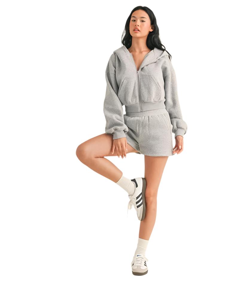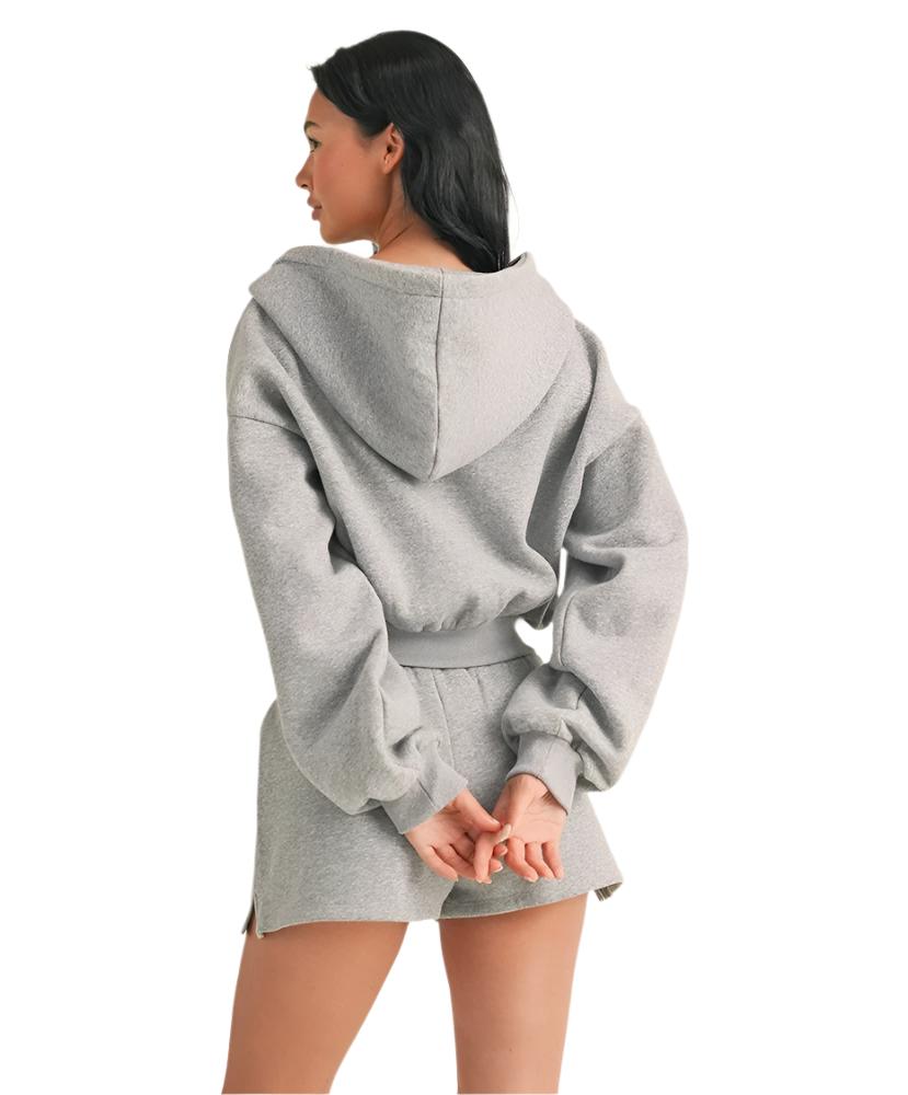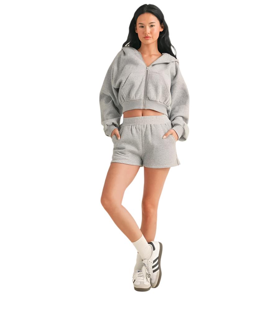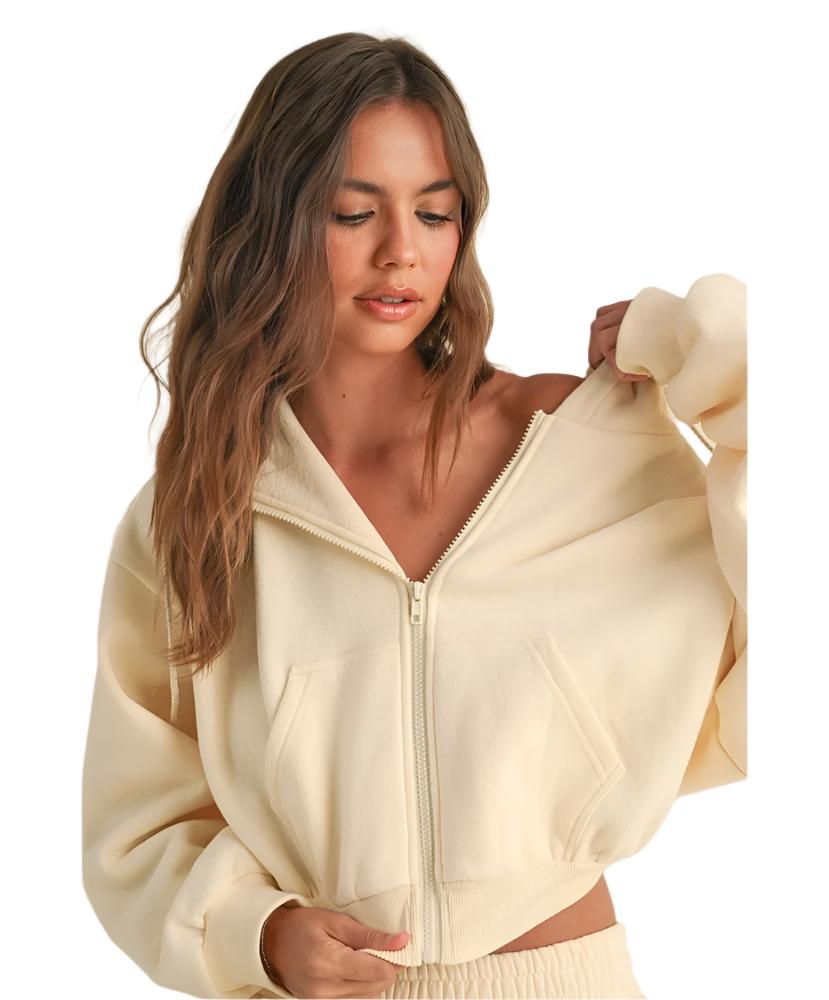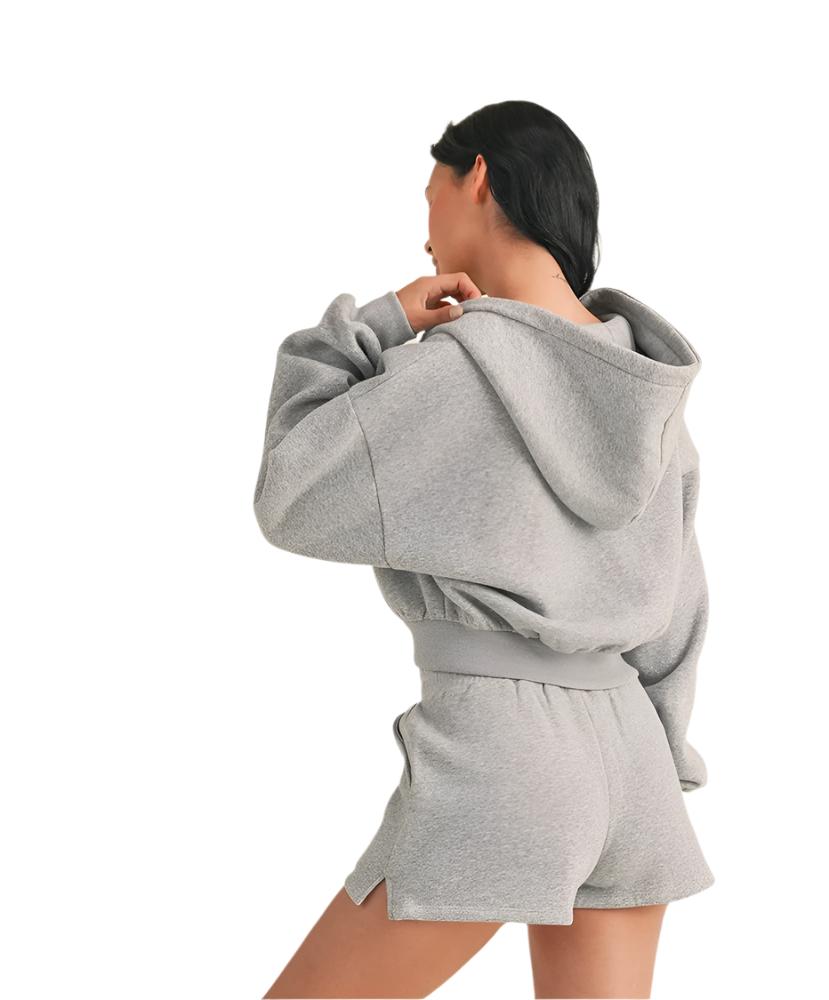 On-trend, oversized crop hoodie with a full zip closure. Side open pockets.