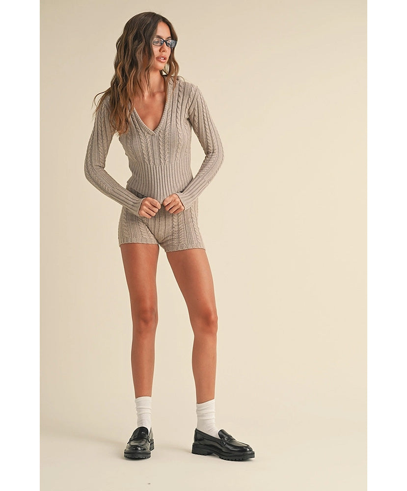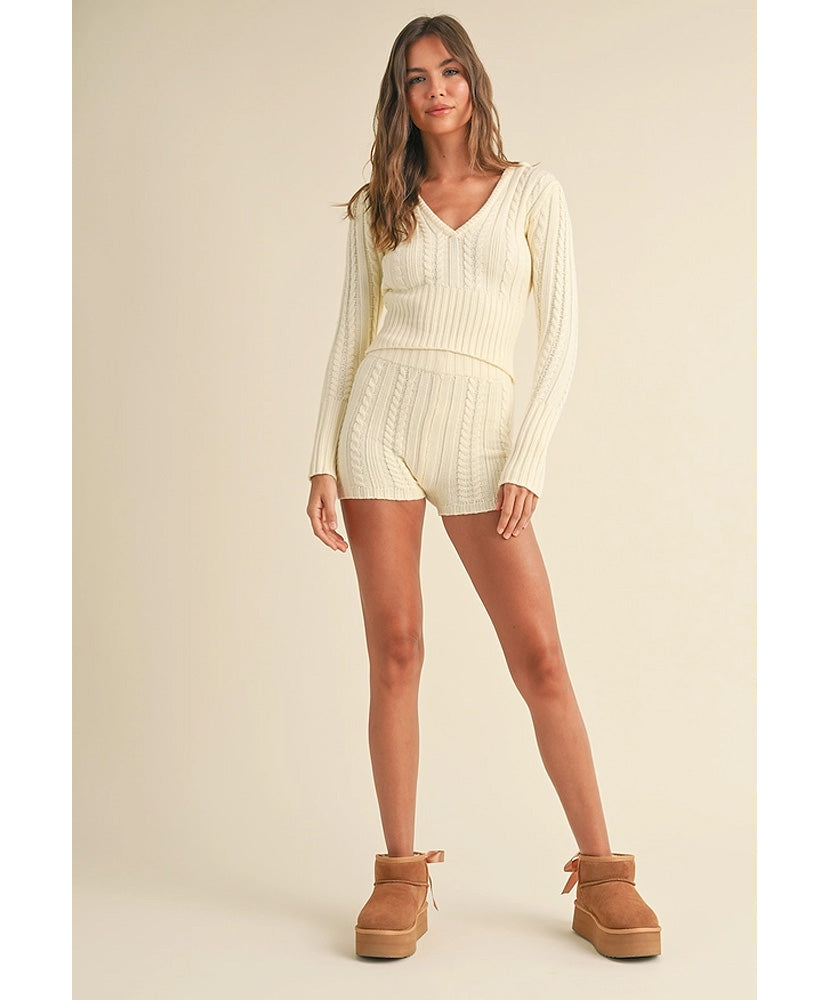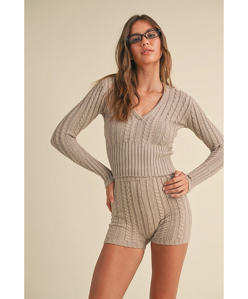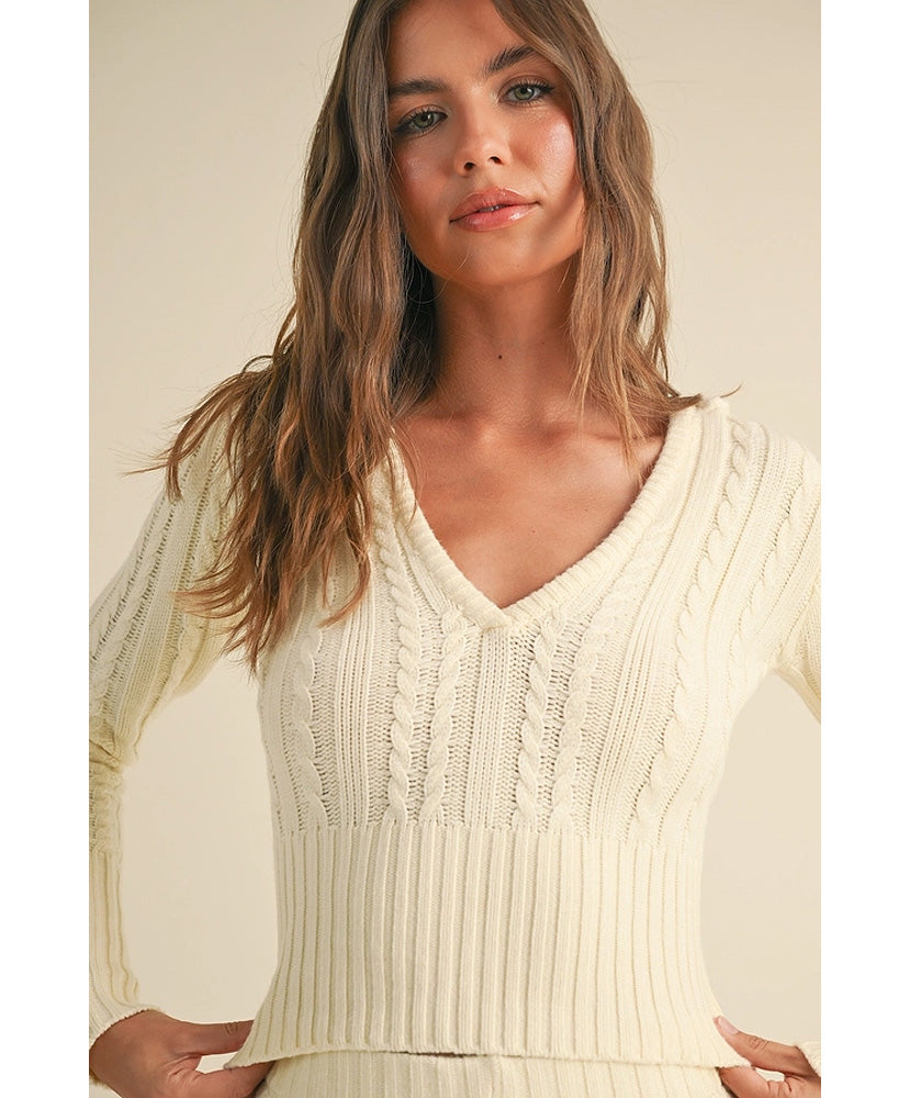 On-trend, cable knit sweater with a flattering v-neckline and cozy hood.