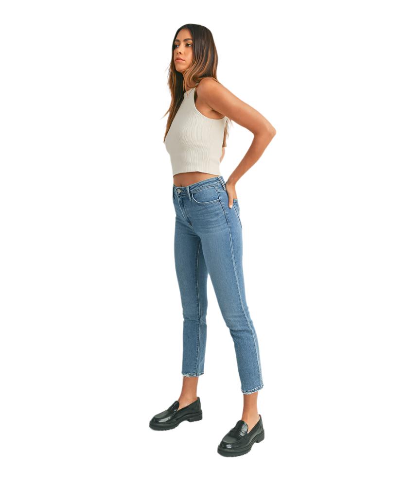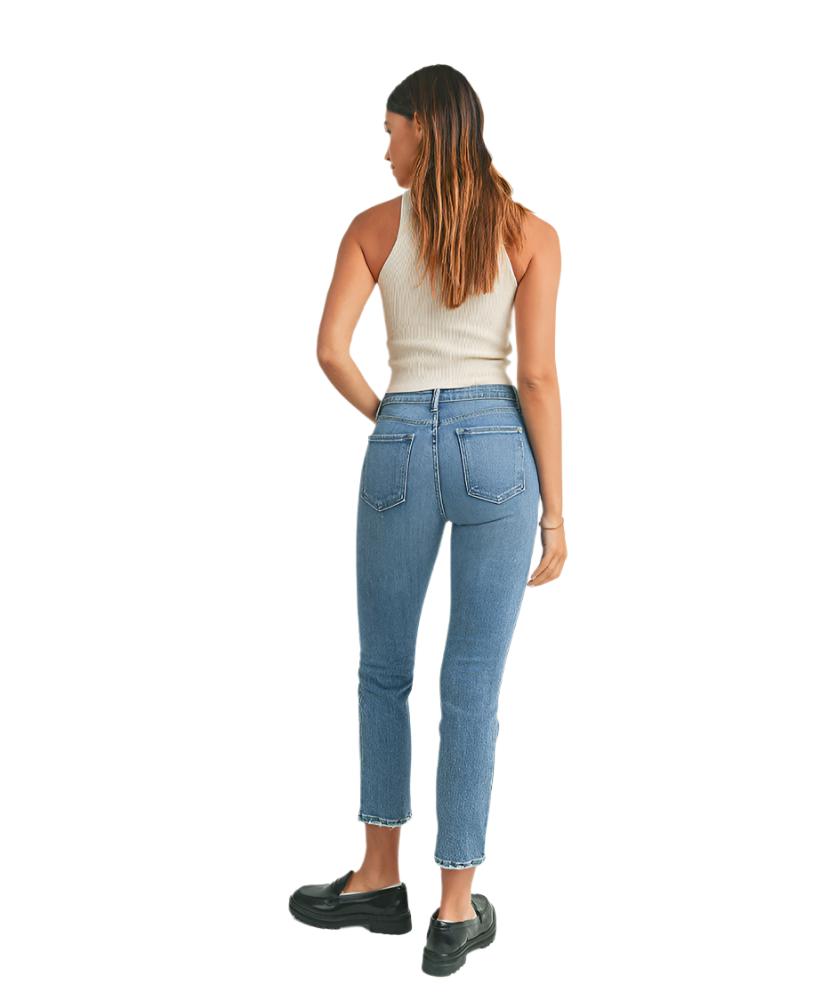 Take a break in this comfort skinny jean that is just a touch slimmer through the legs. A mid-rise waist and subtle distressing around the hems. Available in medium denim.