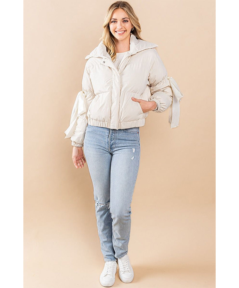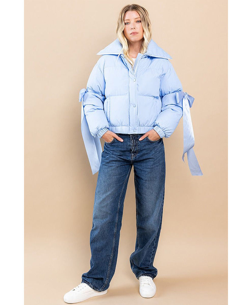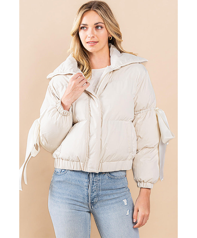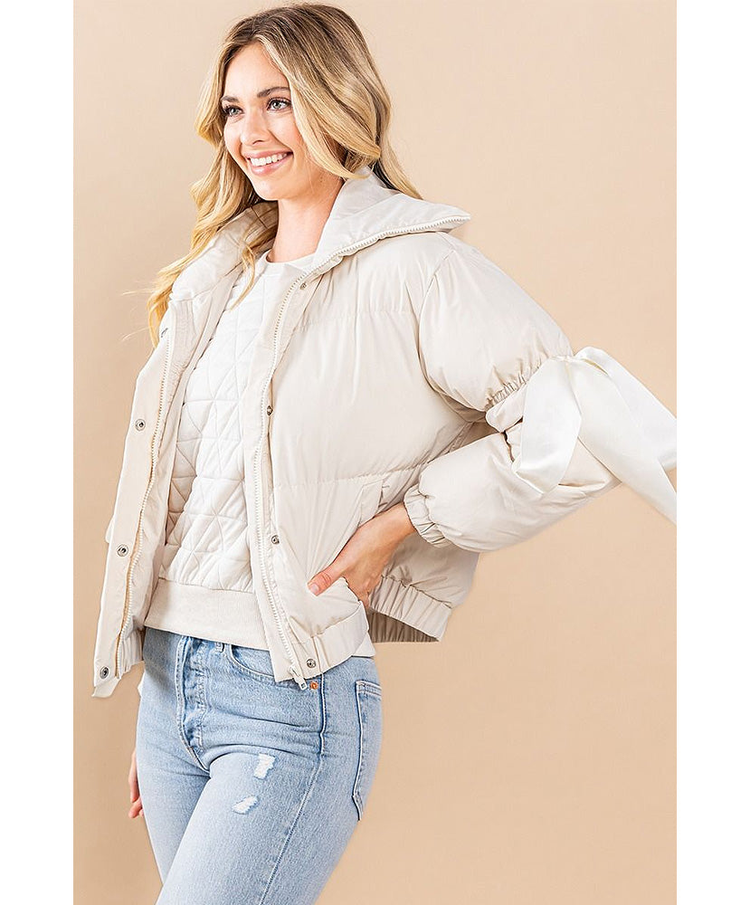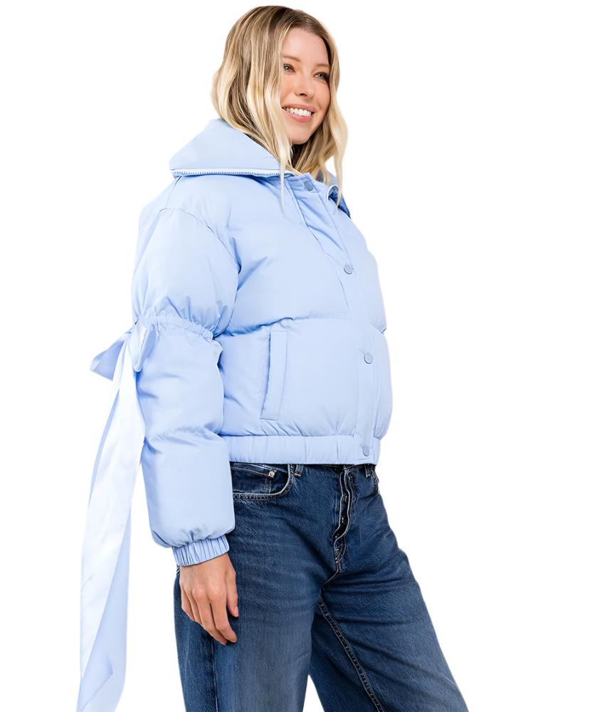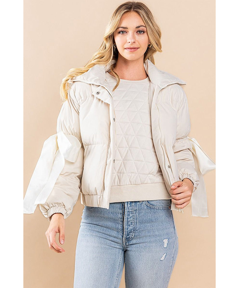 Collared, puffer jacket with bow knot elbow string. Zipper and button closure. Featuring side pockets.