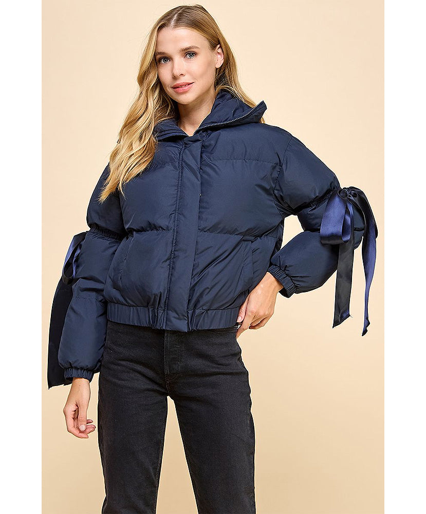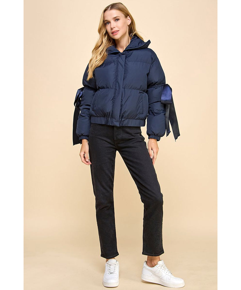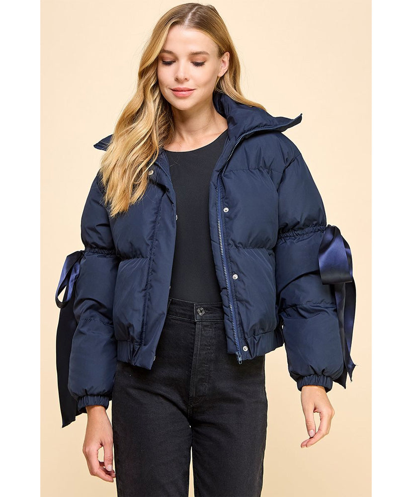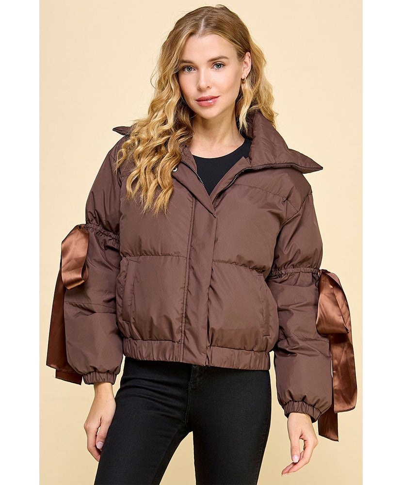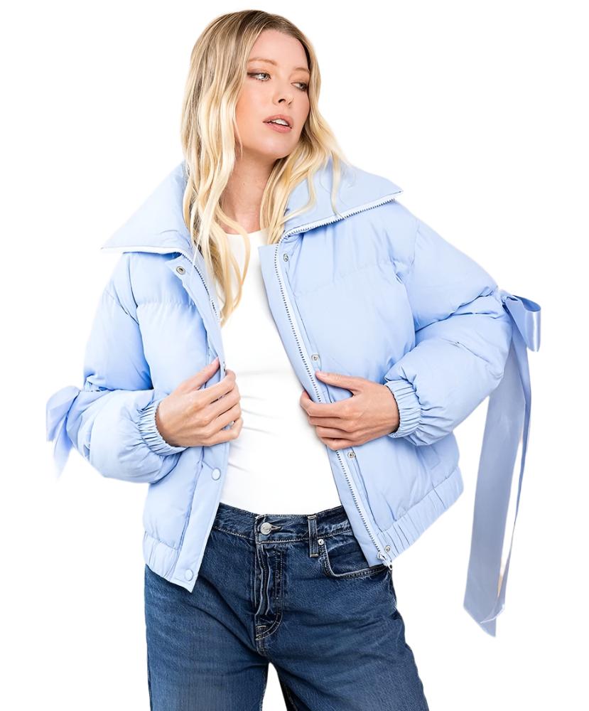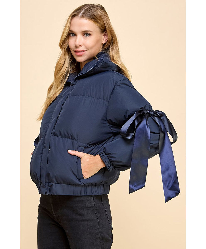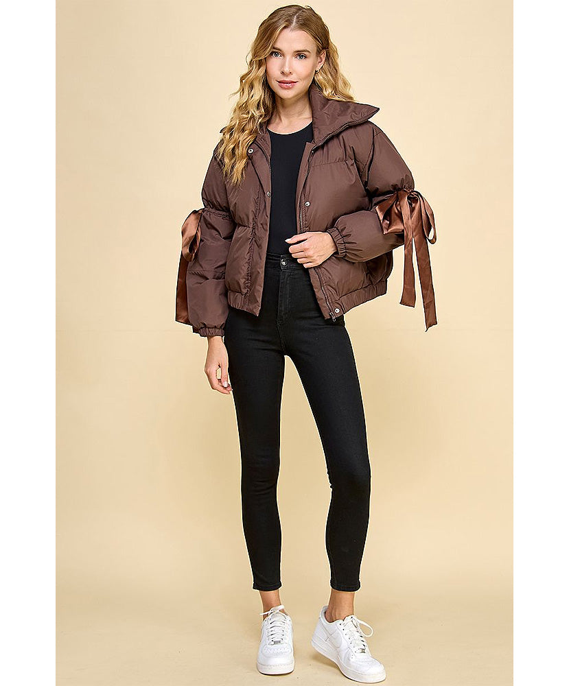 Collared, puffer jacket with bow knot elbow string. Zipper and button closure. Featuring side pockets.