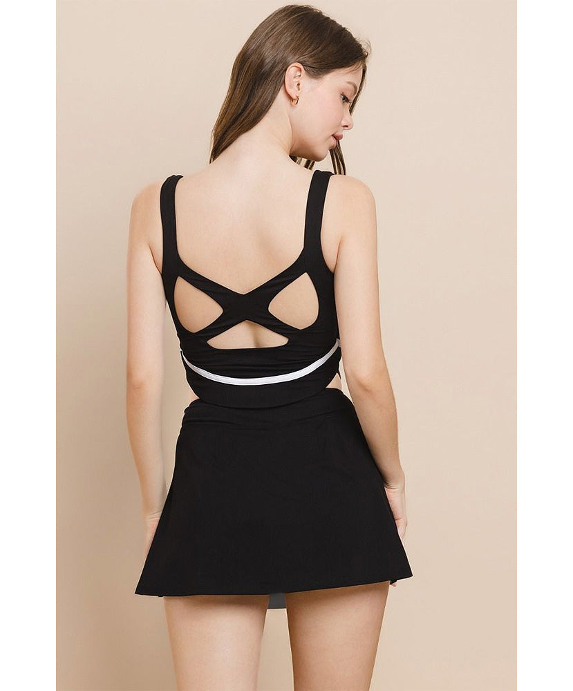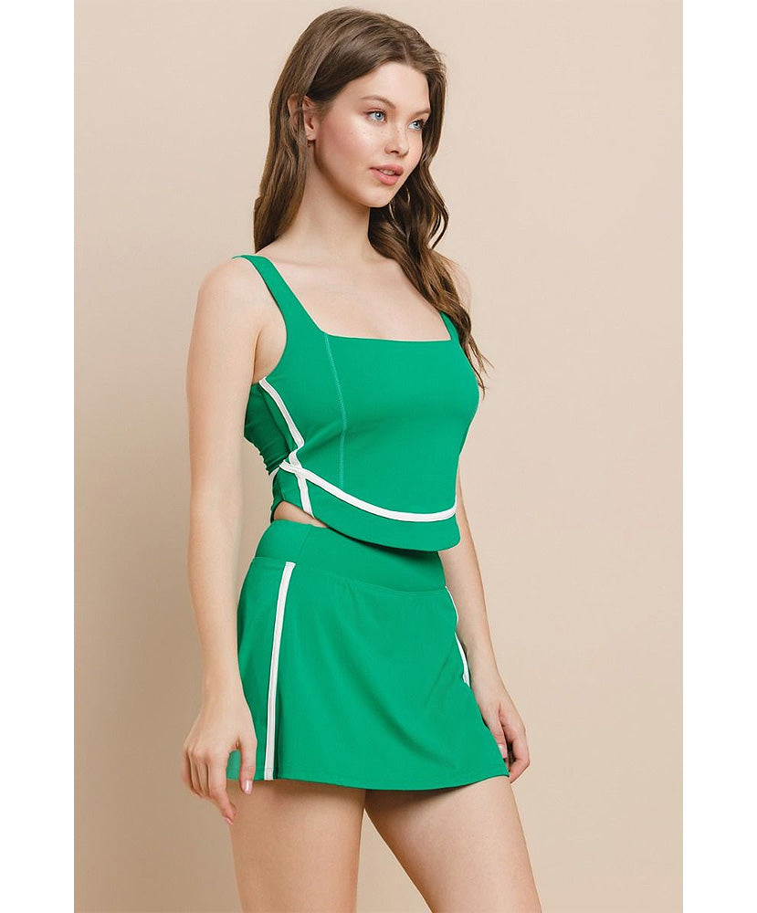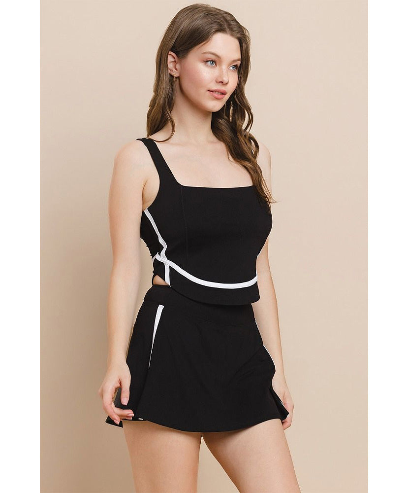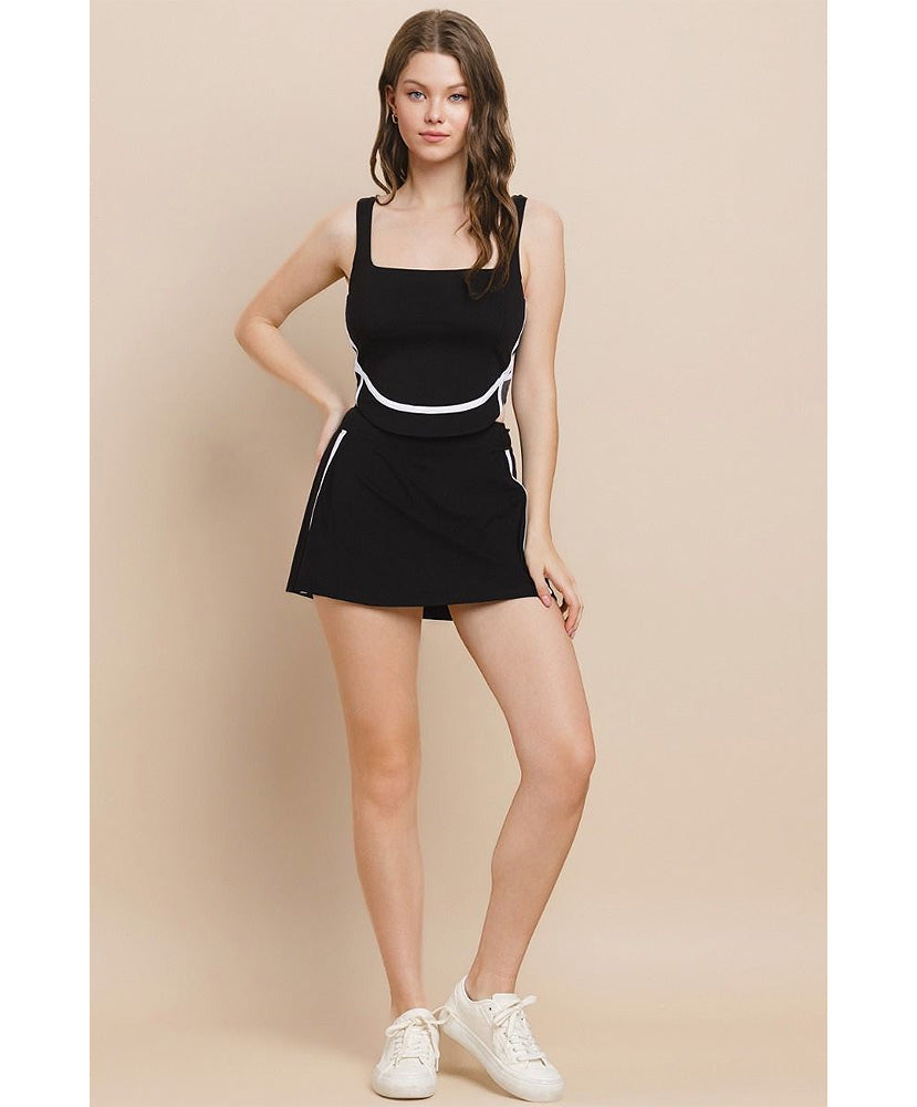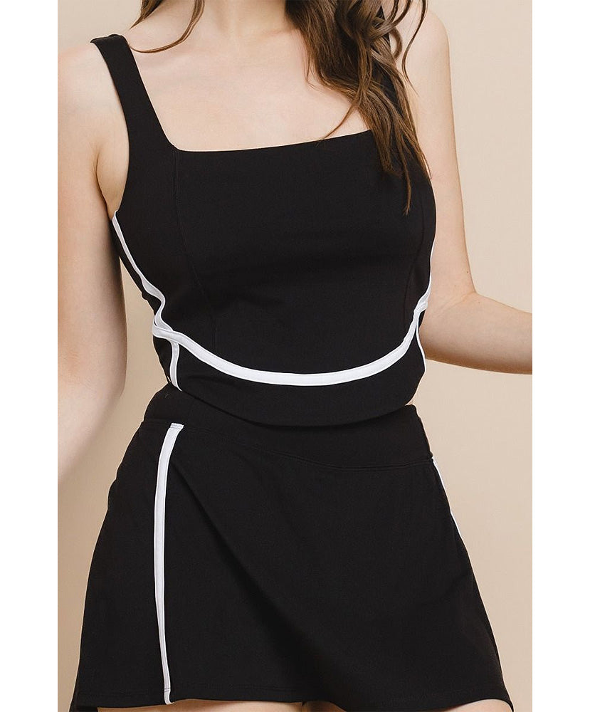 Square neck tank top with contrasting white trim accent, racer back and built in bra. Lined.