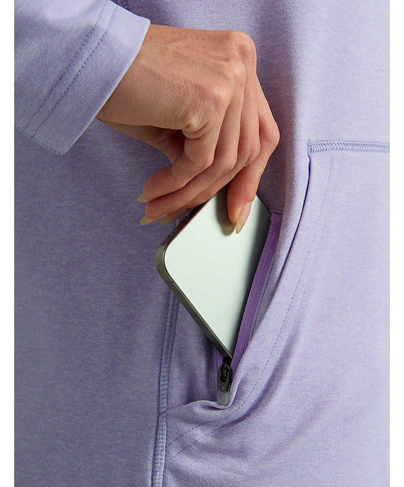 Crafted from stretchable and warm synthetic fabric, the Huk Womens Coldfront+ Hoodie promises ultimate comfort and protection. Its full coverage hood, kangaroo pocket, and sun protection turn your favorite cozy style into a true performance piece. You can rely on this hoodie to keep you warm and comfortable when chasing chilly adventures.