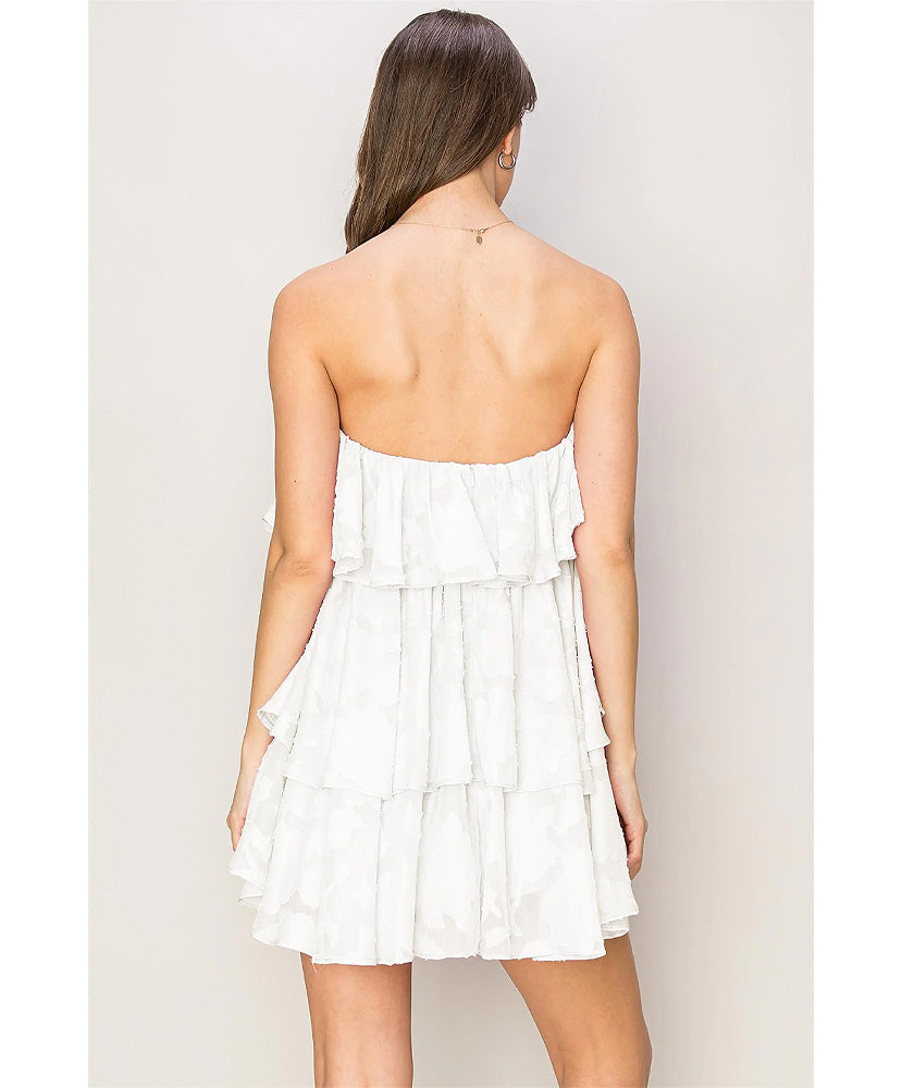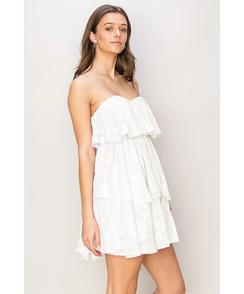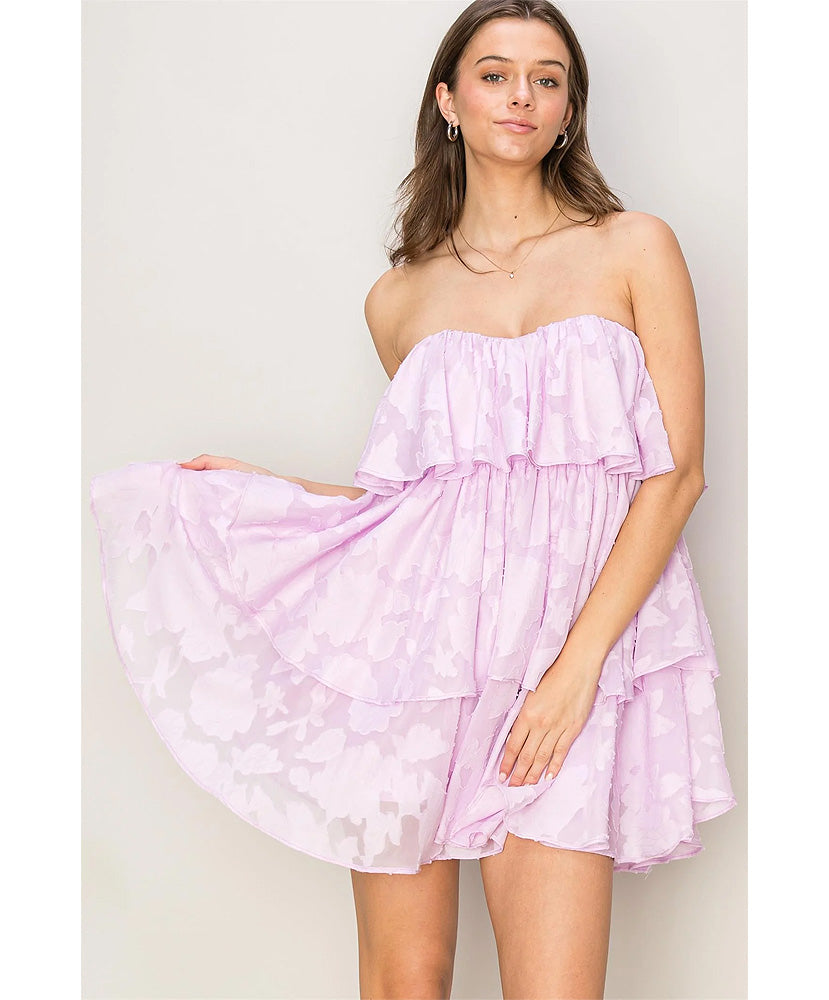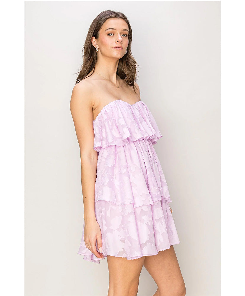 Watch them go head over heels for you wearing this mini dress. Featuring an organza fabric that's decorated with a floral jacquard pattern, it has ruffled layers for a twirl-worthy style. The strapless sweetheart neckline offers romantic flair.