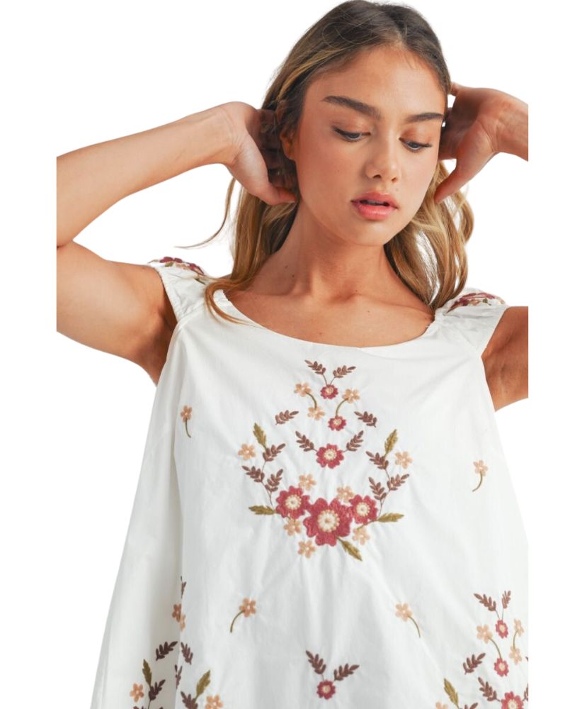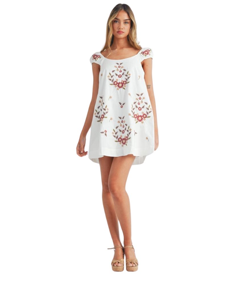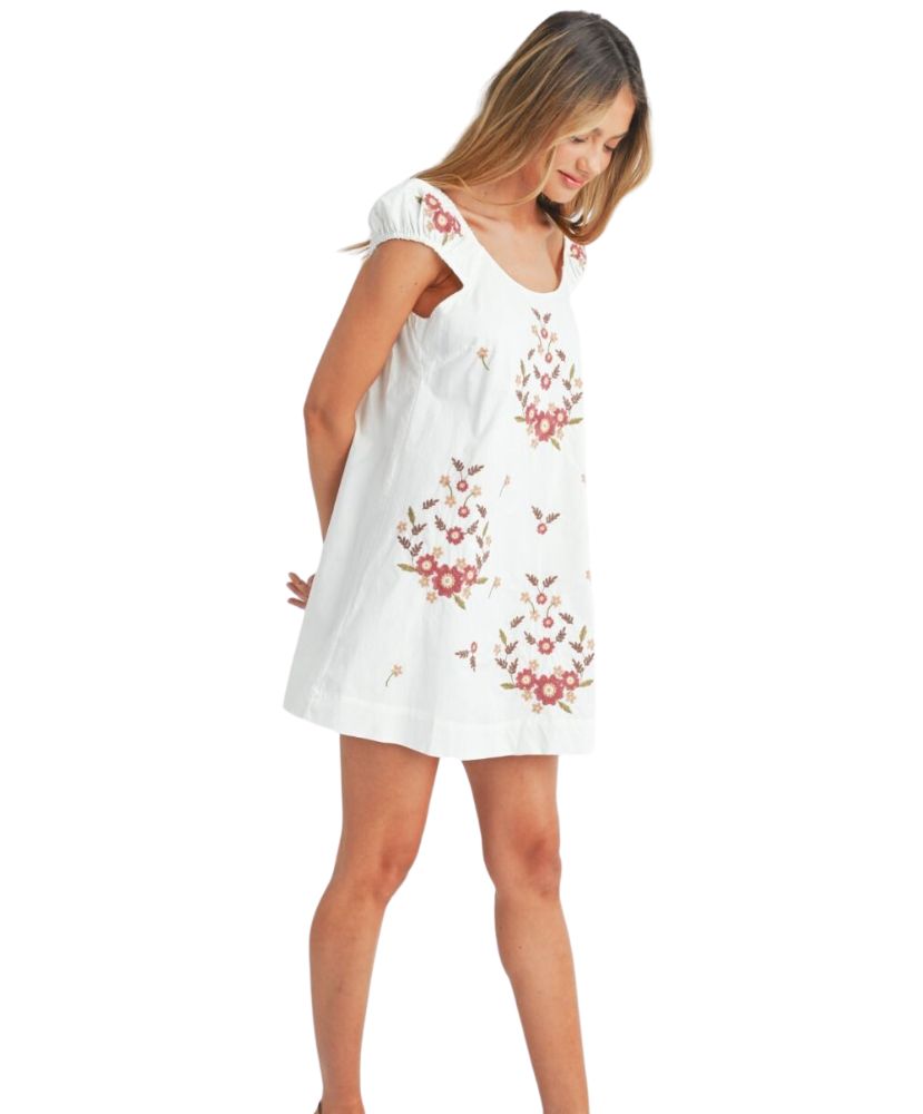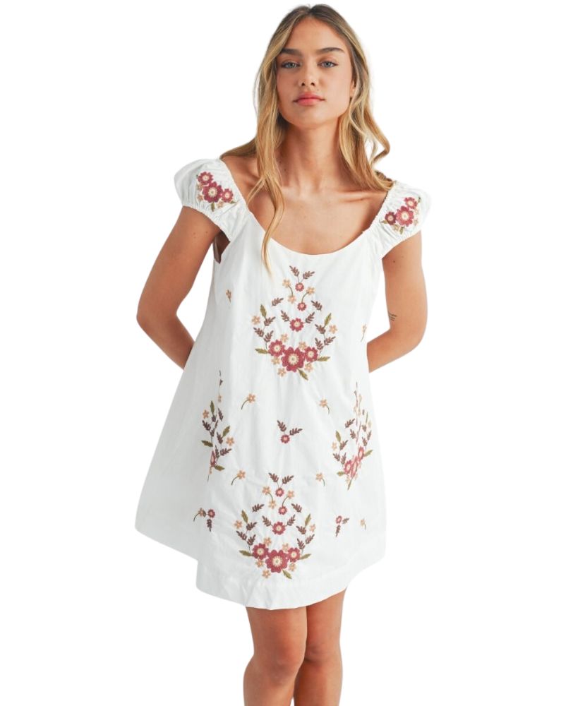 Solid poplin with floral embroidery cap ruched sleeve mini dress. Lining.