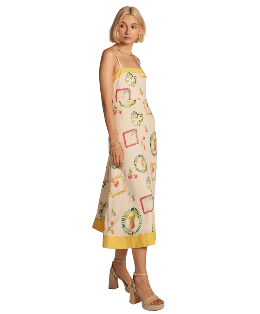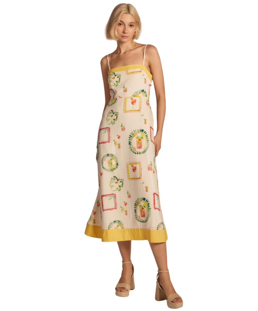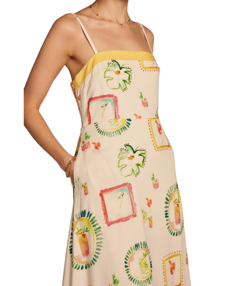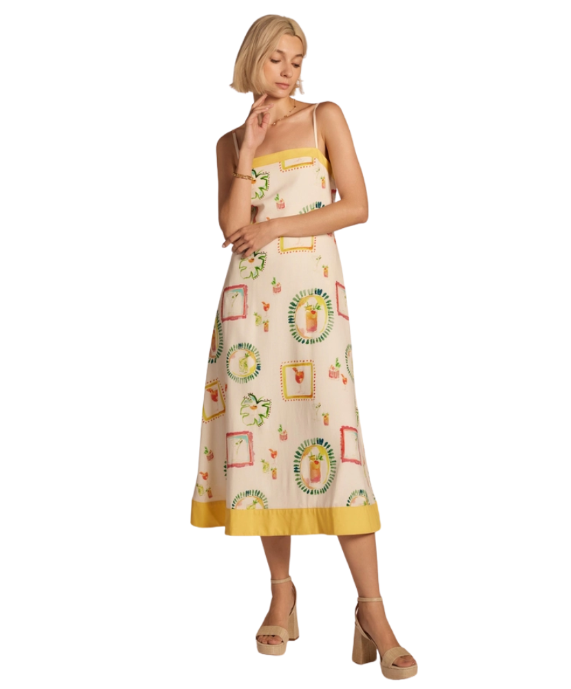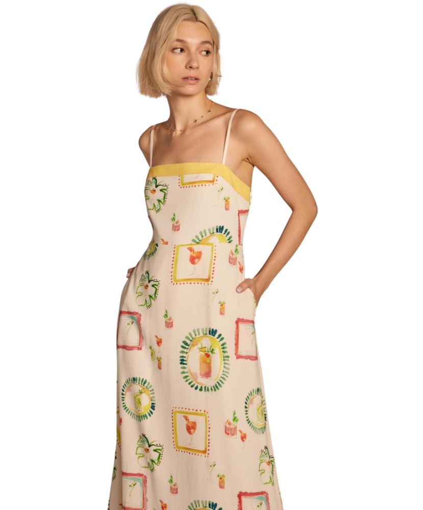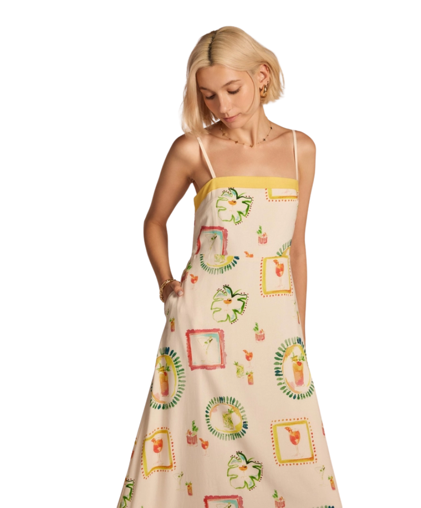 Cheers to your new favorite sundress! The Sippin' Pretty Happy Hour Dress serves up effortless style with a splash of fun. Made from stretch linen and decked out in an exclusive cocktail print, this midi is ready for everything from patio brunches to beachside happy hours. A contrast panel at the bustline and hem adds a pop of color, while adjustable straps, side pockets, and a smocked back keep things comfy and flattering. The square neckline and empire waist create a breezy, flirty silhouette perfect for sipping, twirling, and soaking up the sun.