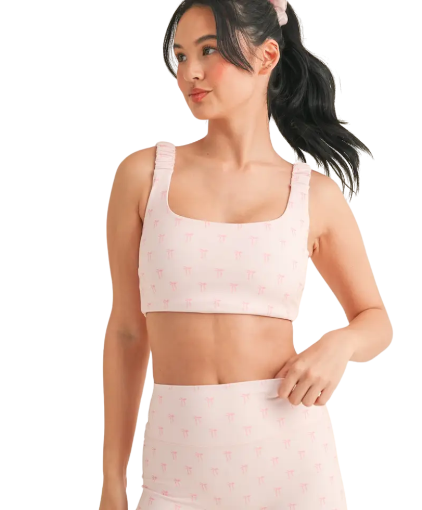 Pretty, playful, and perfectly supportive—the Pink Bow Ruched Bra Top brings flirty charm to your activewear drawer. Designed with scrunchy ruched straps and an open-back detail, it’s the kind of top that looks as good on a coffee run as it does at yoga.