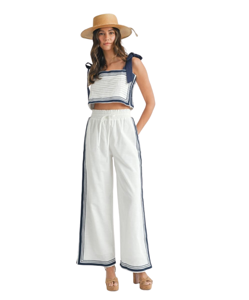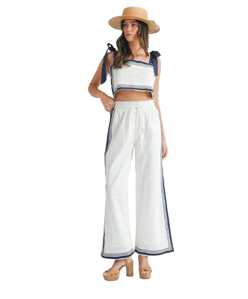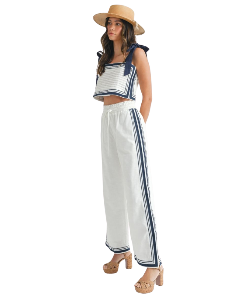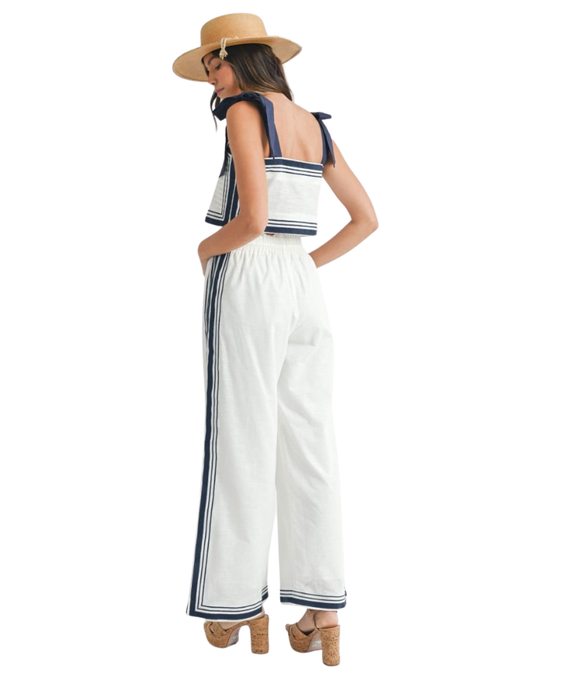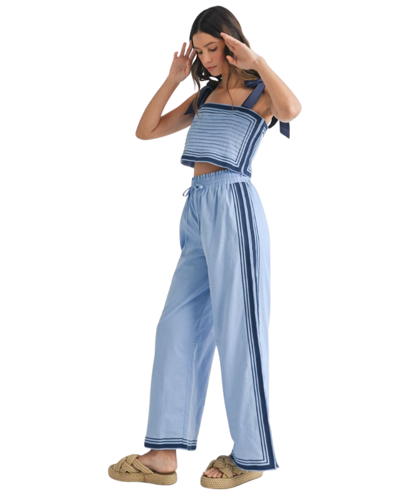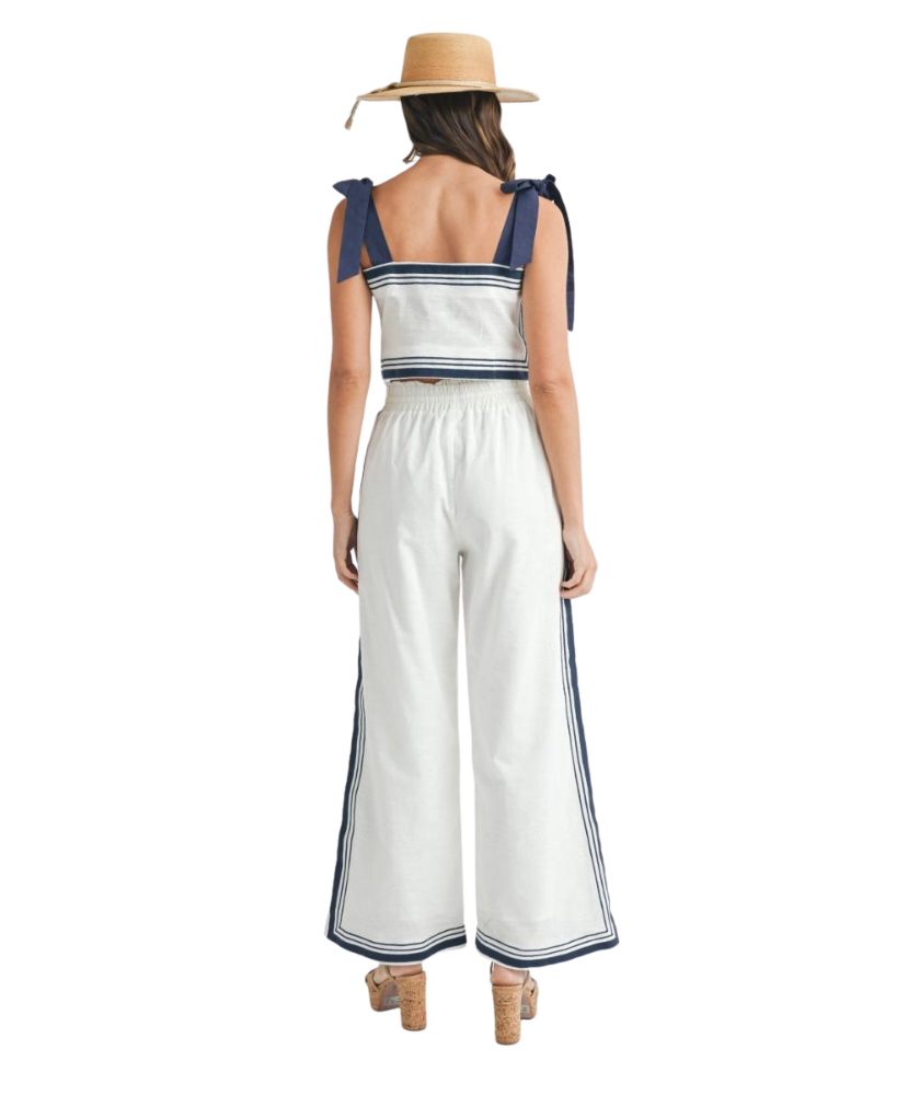 Anchors aweigh on effortless style. This sail-inspired two-piece set is breezy, flattering, and made for seaside strolls or brunch deck dates. The textured crop top features charming self-tie shoulder straps and contrast chevron embroidery, while the relaxed-fit pants complete the look with coastal flair.