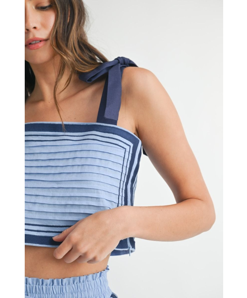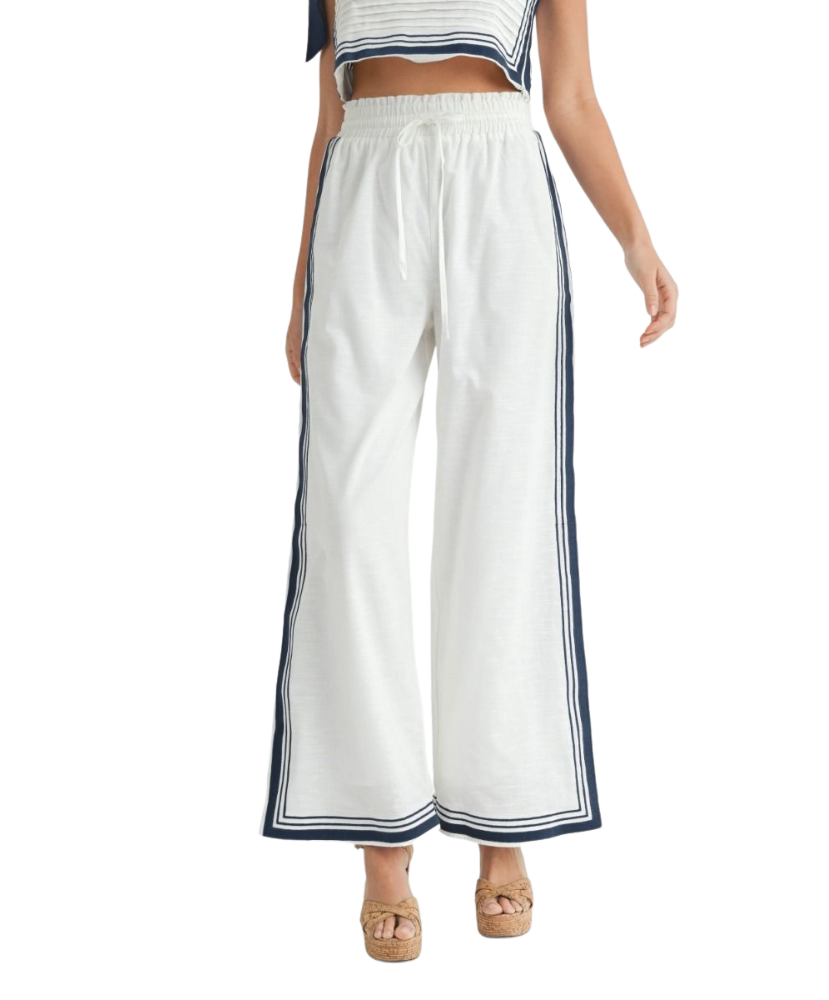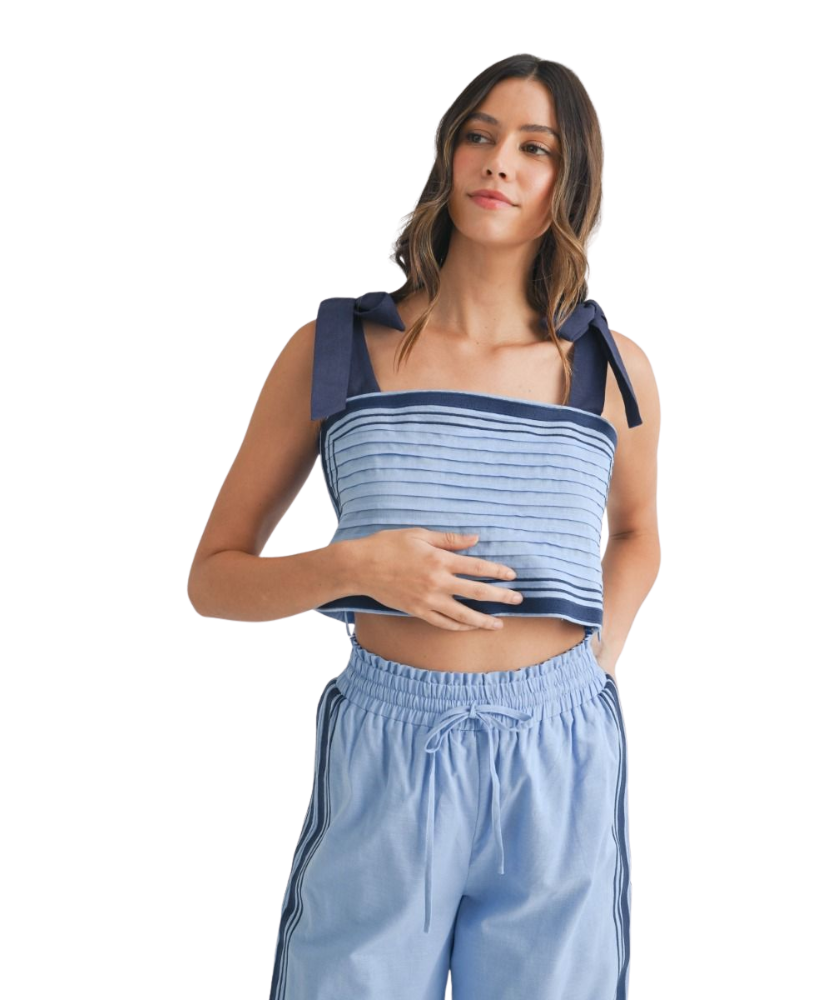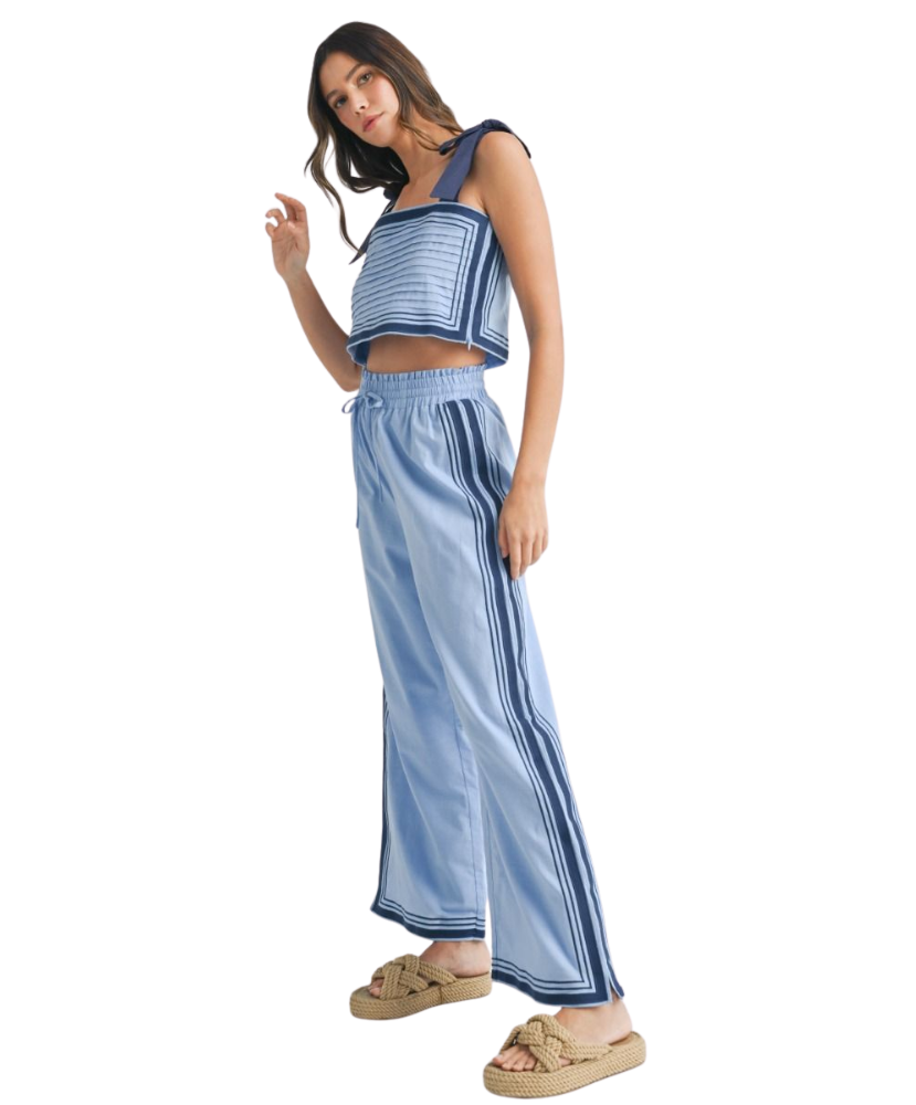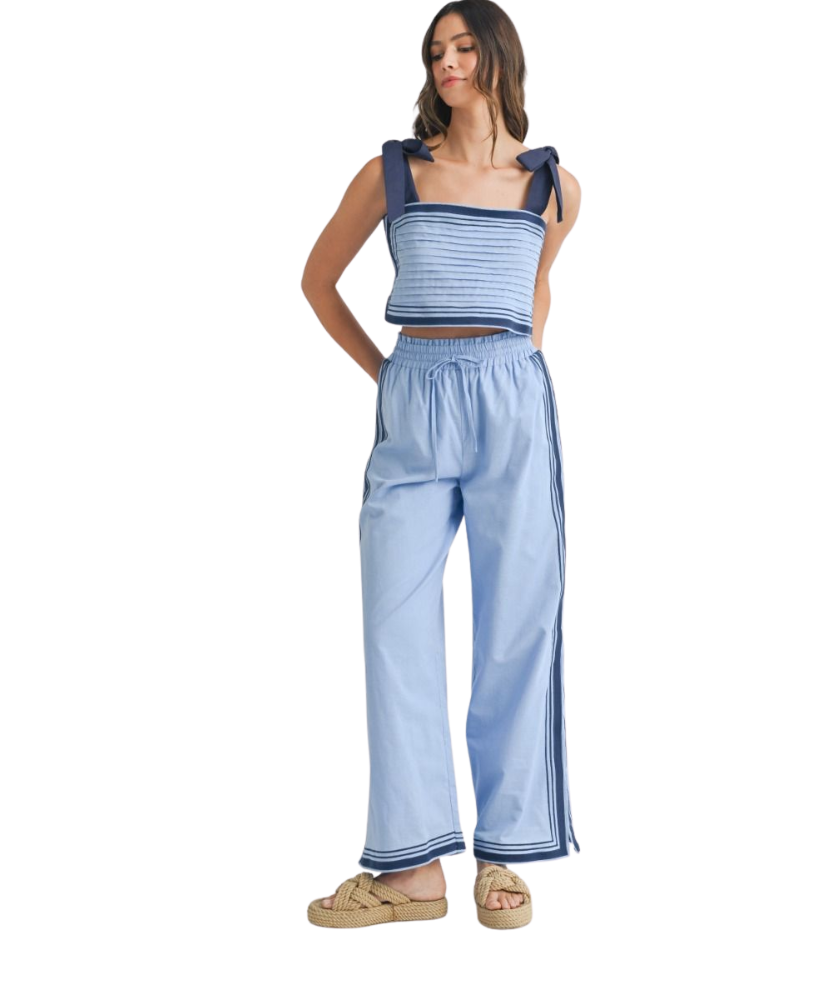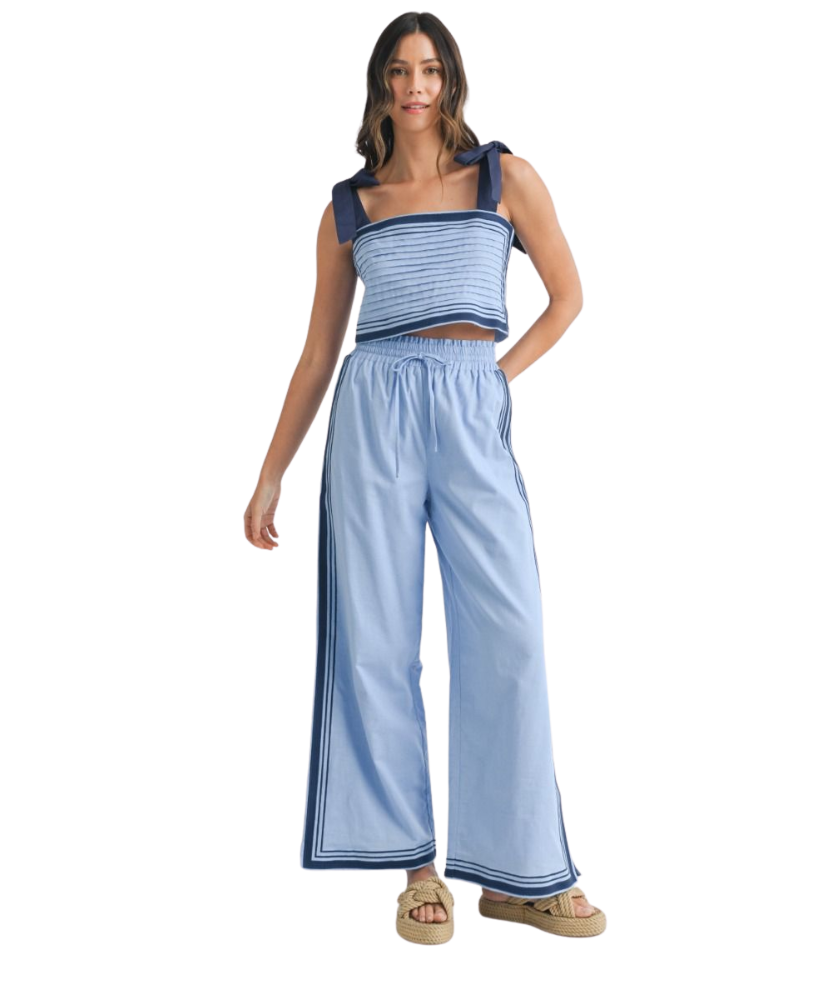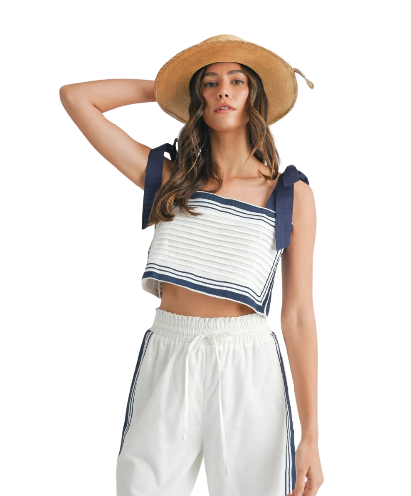 Anchors aweigh on effortless style. This sail-inspired two-piece set is breezy, flattering, and made for seaside strolls or brunch deck dates. The textured crop top features charming self-tie shoulder straps and contrast chevron embroidery, while the relaxed-fit pants complete the look with coastal flair.