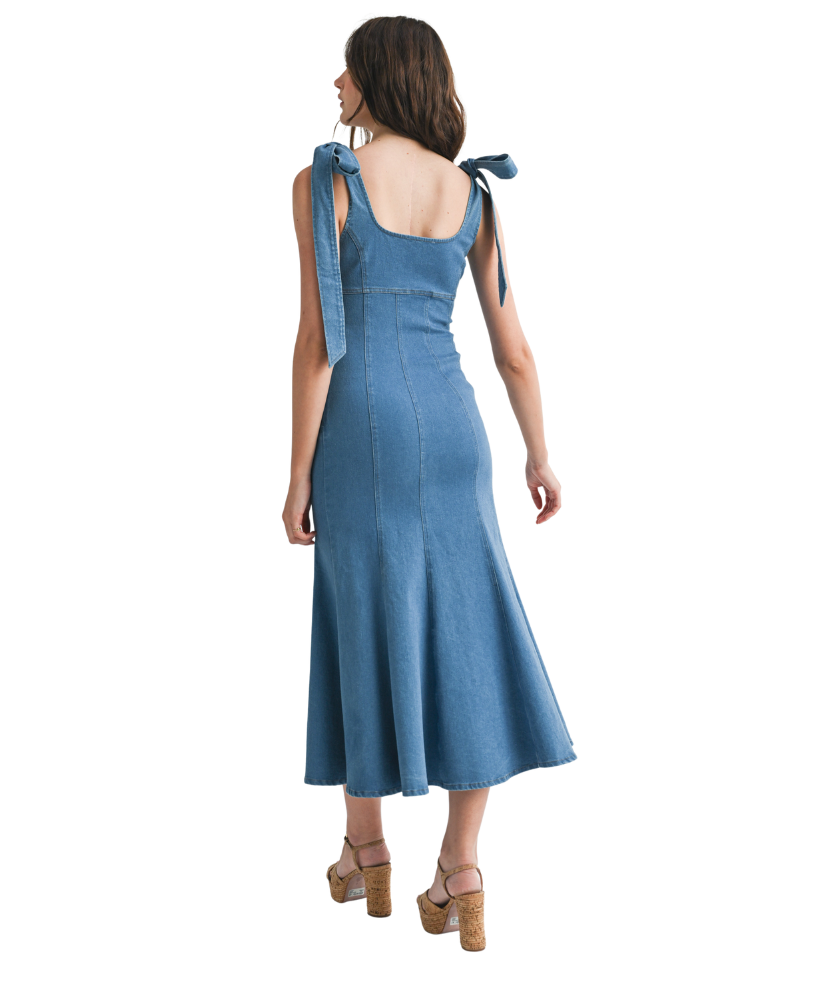 Make way for your new denim obsession—the Molly Denim Midi Dress is equal parts sweet and striking. Designed with a flattering fit-and-flare silhouette and playful bow-tied shoulder straps, this dress brings a modern twist to a vintage classic. The soft, stretchy denim hugs in all the right places and flows out into a flirty midi-length hem.