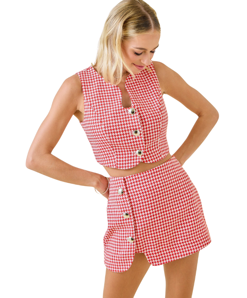 Game day just got a major style upgrade. The Haley Vest serves sideline sass with its bold houndstooth print and pearl button details that scream "fashion MVP." Whether you’re tailgating, cheering from the stands, or celebrating a big win, this sleeveless cut keeps things cool while the structured fit keeps you polished. Pair it with the matching skirt for a power play look that’s as iconic as your team spirit.