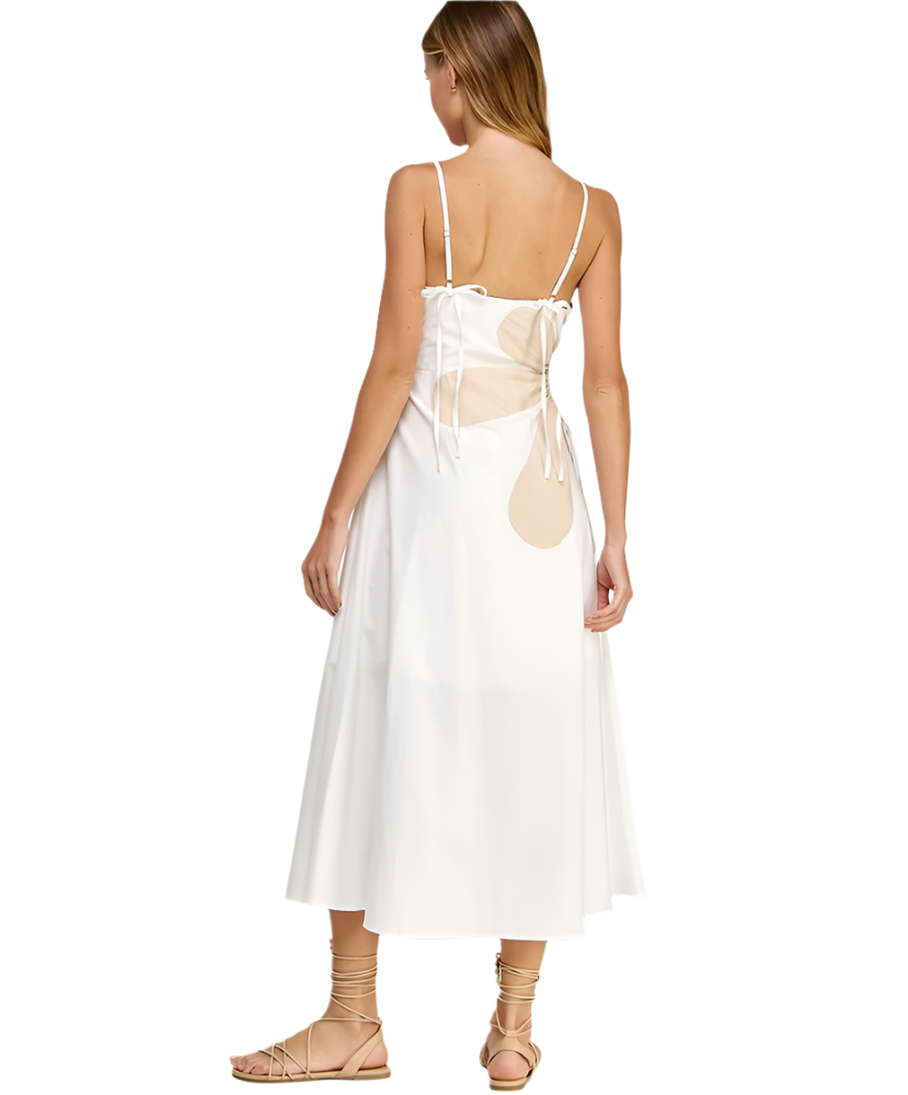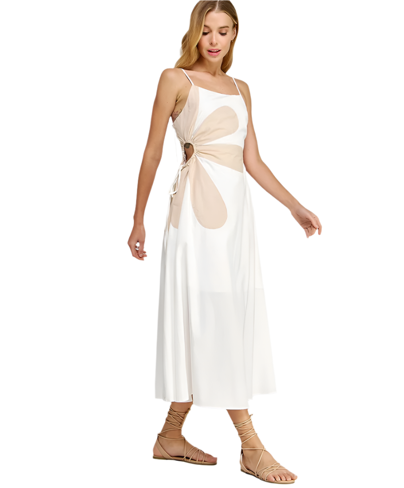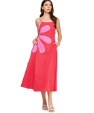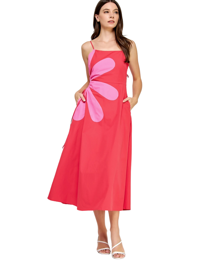 This long sleeveless dress in cotton poplin fabric features a side cutout flower detail with an adjustable tie, a square neckline, adjustable straps, side pockets, a feminine patchwork flower detail, and a lining.
