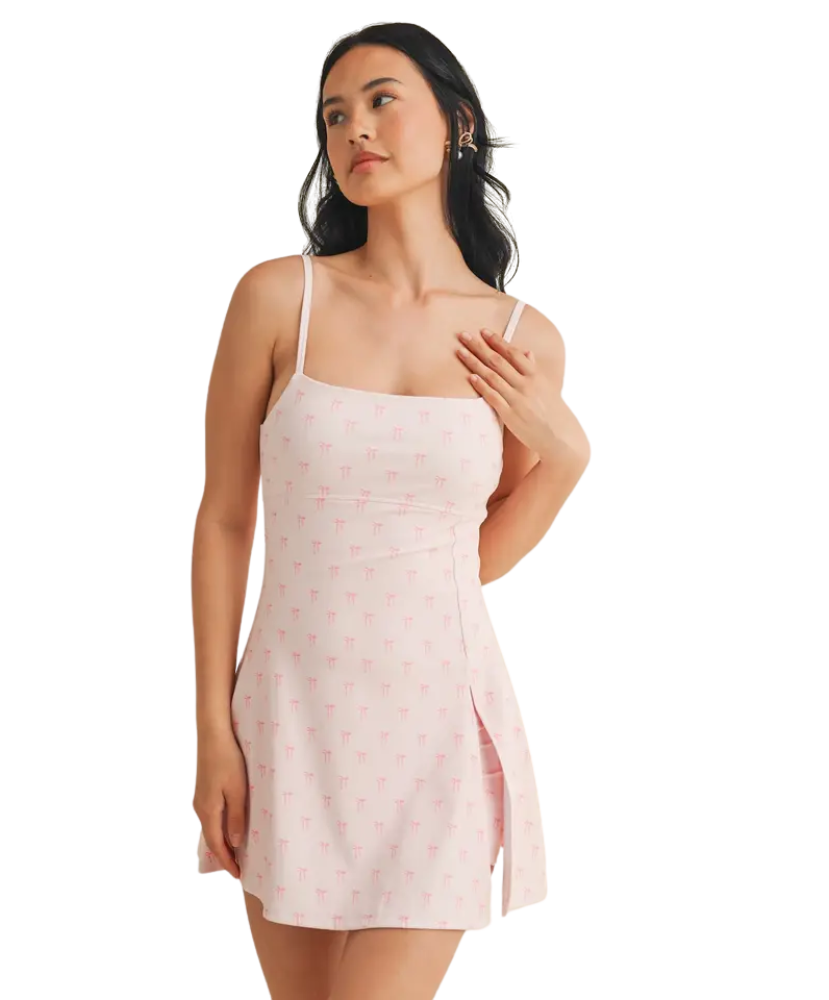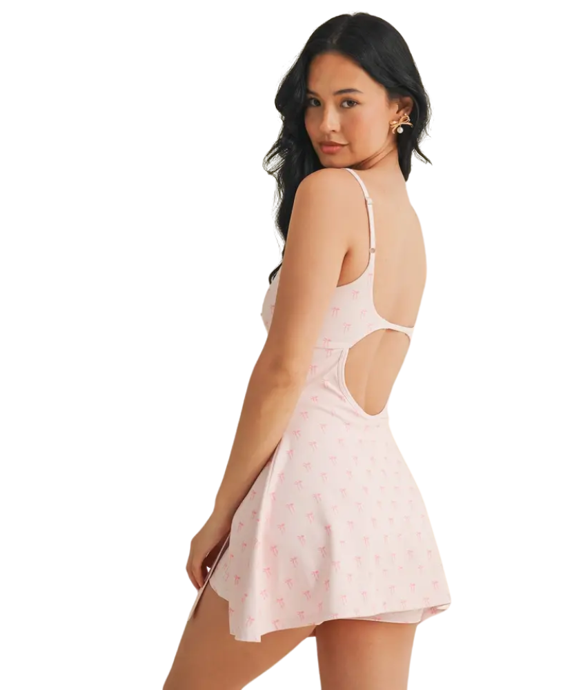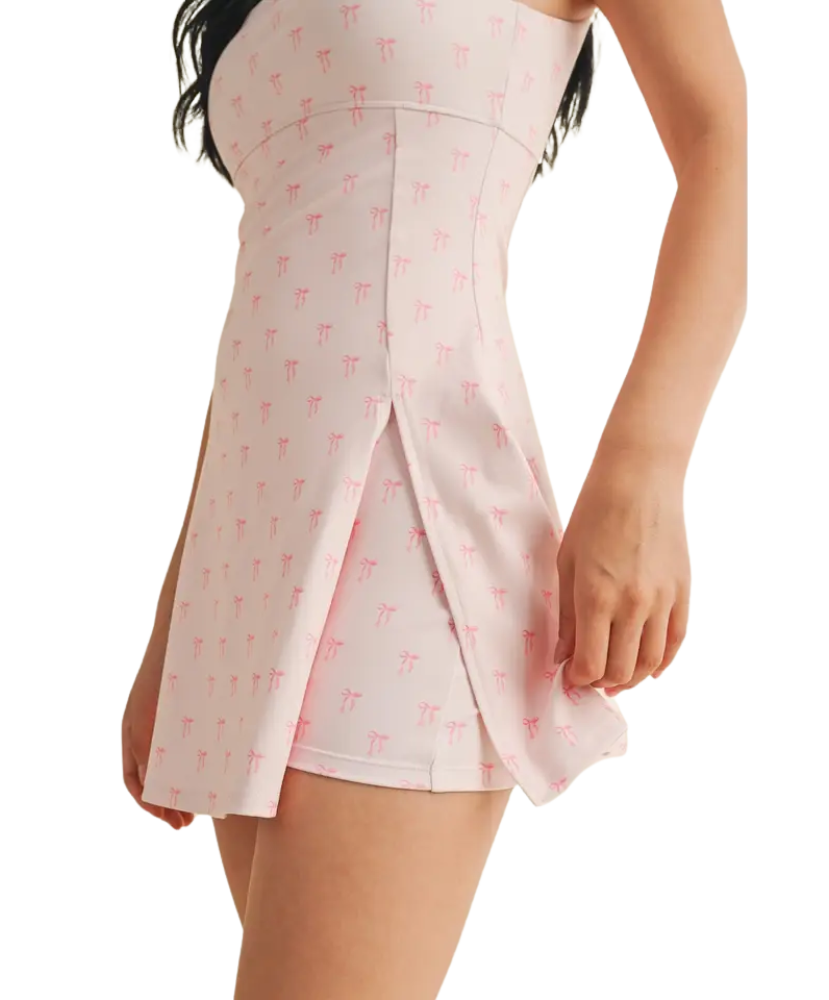 The flirty fit you didn’t know you needed. The Pink Bows A-Line Mini Dress combines a dreamy balletcore aesthetic with performance fabric that moves with you. Complete with a subtle side slit, peekaboo built-in shorts, and a low cut-out back, this one's made for twirling, dancing, or just looking effortlessly put together.