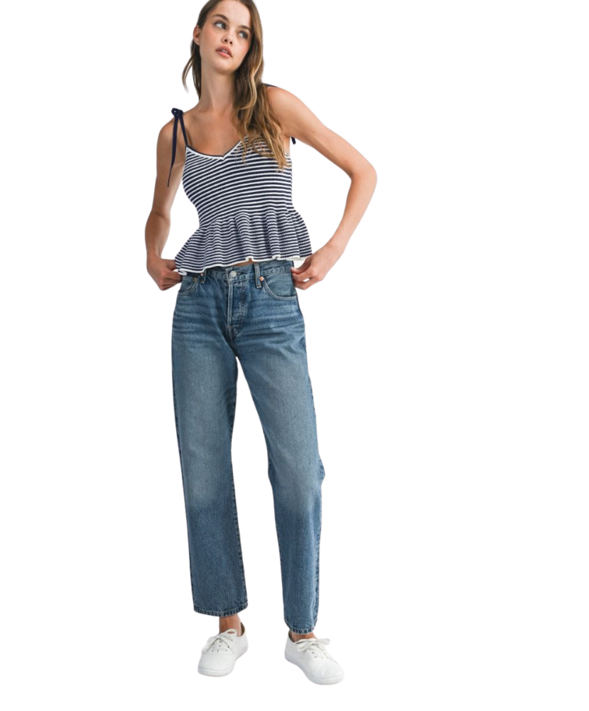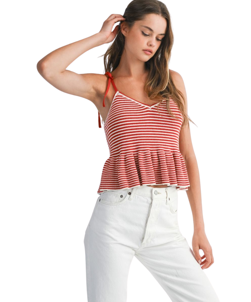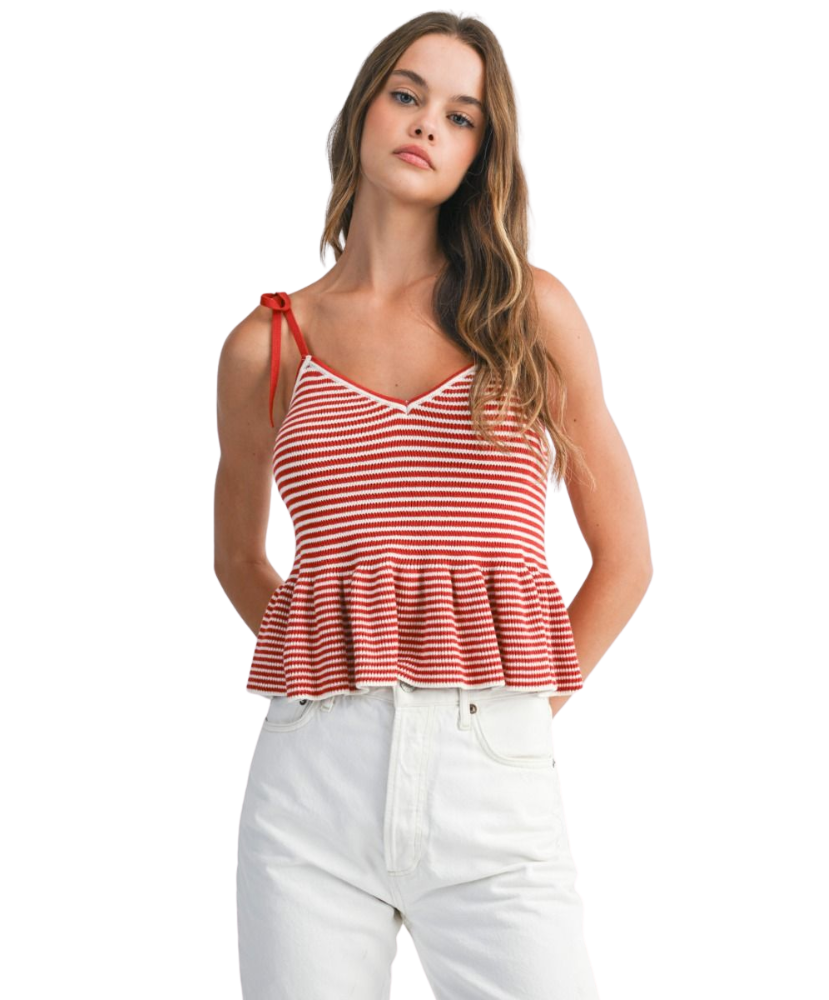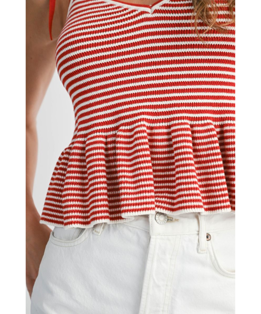Classic stripes meet playful charm in the Harper Top. Designed with a flattering V-neckline, soft sweater knit, and a flouncy peplum hem, this top is tied together with adjustable shoulder straps for a custom fit. Whether you're brunch-bound or beach-walking, Harper adds a fresh pop of nautical flair to your look.