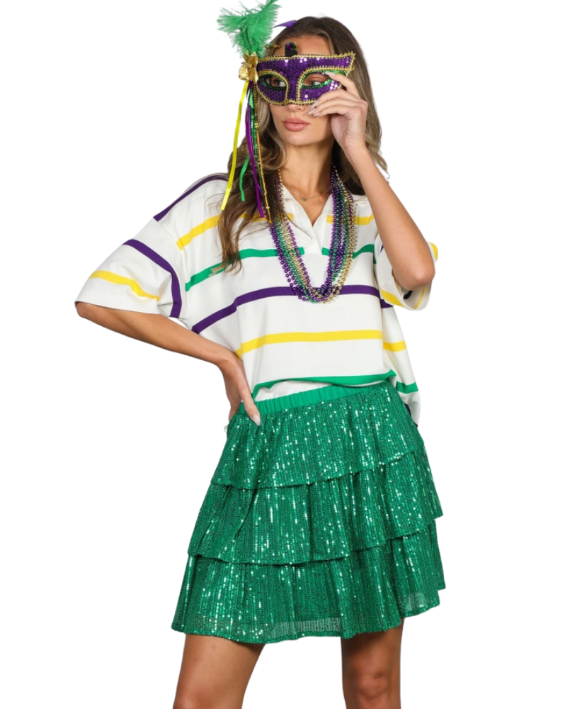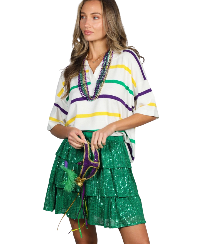 The Multi Stripe Short Sleeve Mardi Gras Shirt is your go-to for laid-back celebration style. Featuring classic purple, gold, and green stripes in a lightweight, high-quality knit, this top brings Mardi Gras spirit in a way that’s easy, elevated, and endlessly wearable. The collared neckline with a flattering V-shape adds a touch of polish, while the relaxed fit and drop shoulders keep it comfortable and cool.