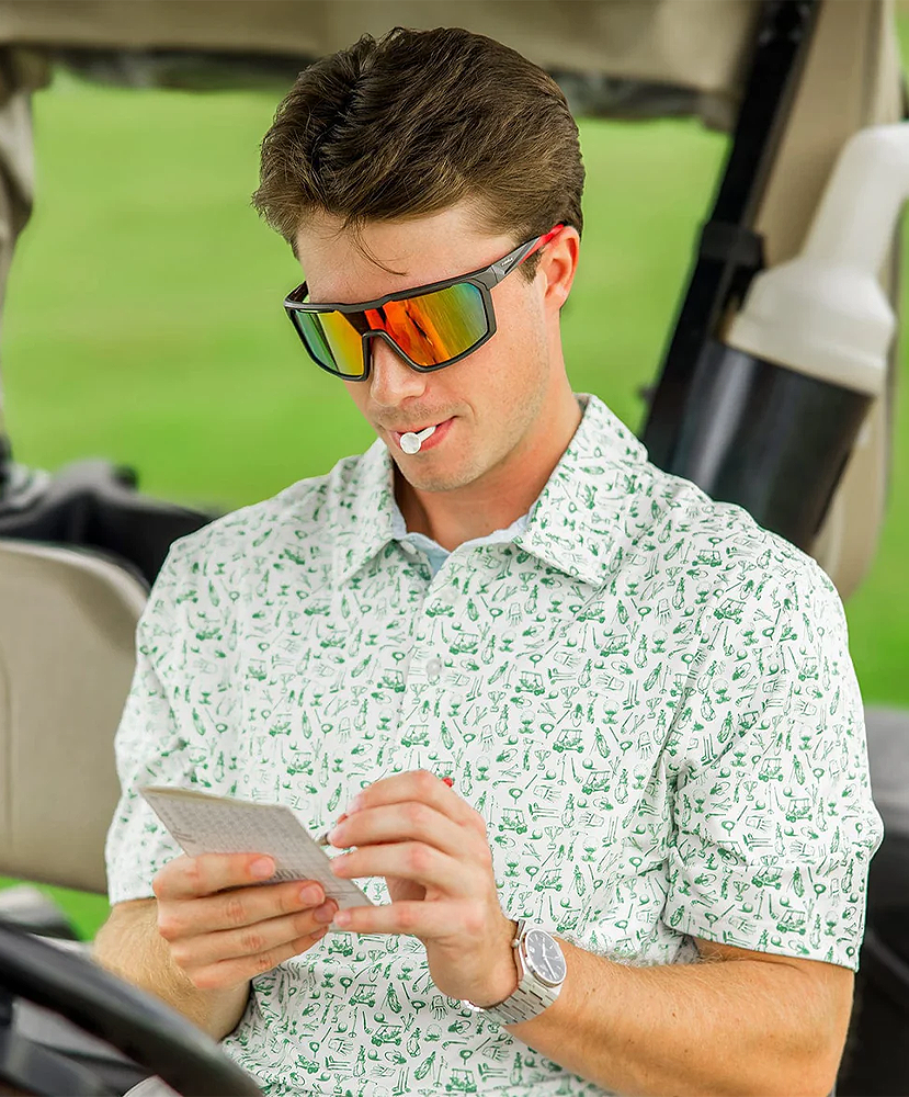 This polo is loaded with golf-inspired icons—because let’s be honest, if you’re not actually on the course, you’re probably talking about when you will be.