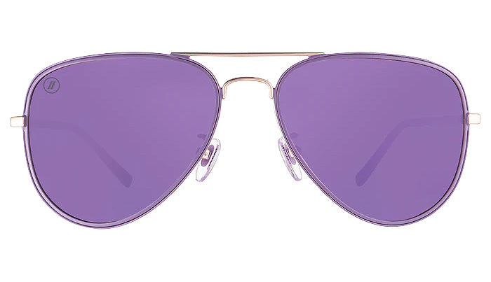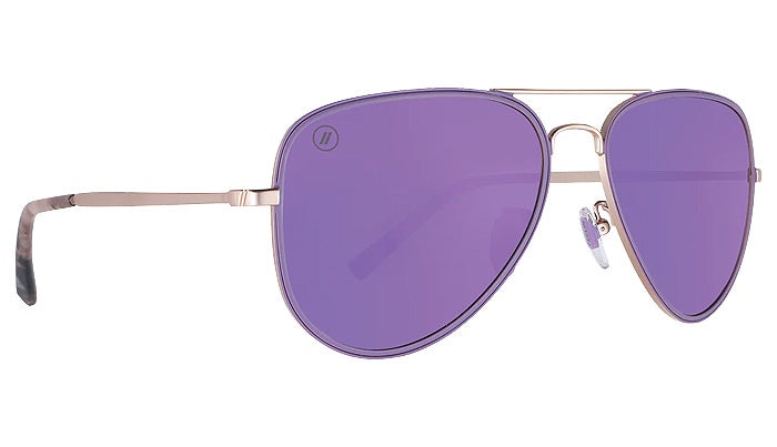 Classic teardrop style meets contemporary colorway with 'Lilac Lacy.' These aviator sunglasses wow with a polarized lavendar lens and rose-gold tone at the temples, then drop jaws with a contrasting tortoise pattern at the ear tips.
