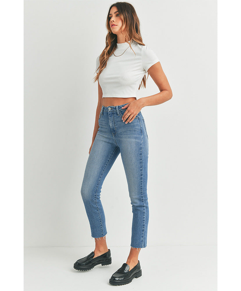 A straight jean that's as versatile as it is comfortable. A medium rinse and medium-rise waist flatter a straight leg with an optic white option, that hits just above your ankle for an on-trend sillouhette.