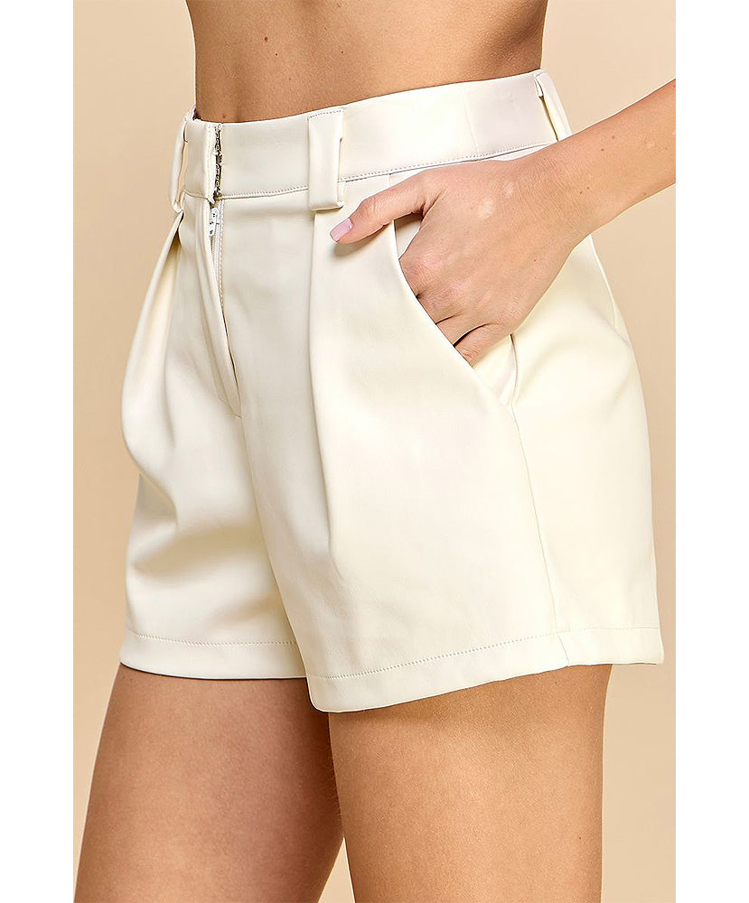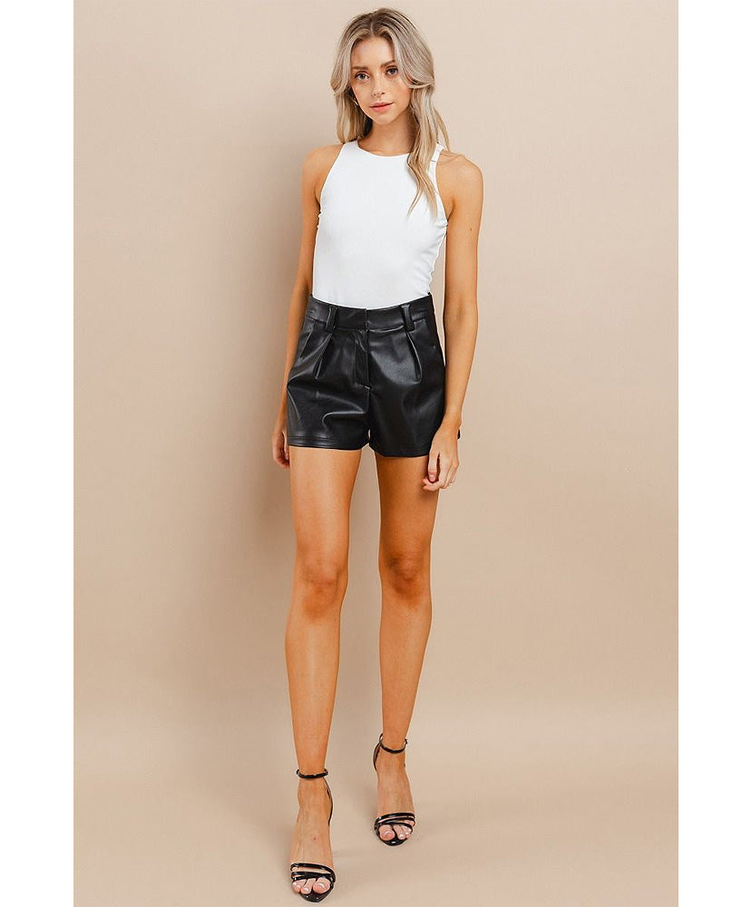 A pair of faux leather shorts featuring a belt loops, slanted front pockets and pleated detail.