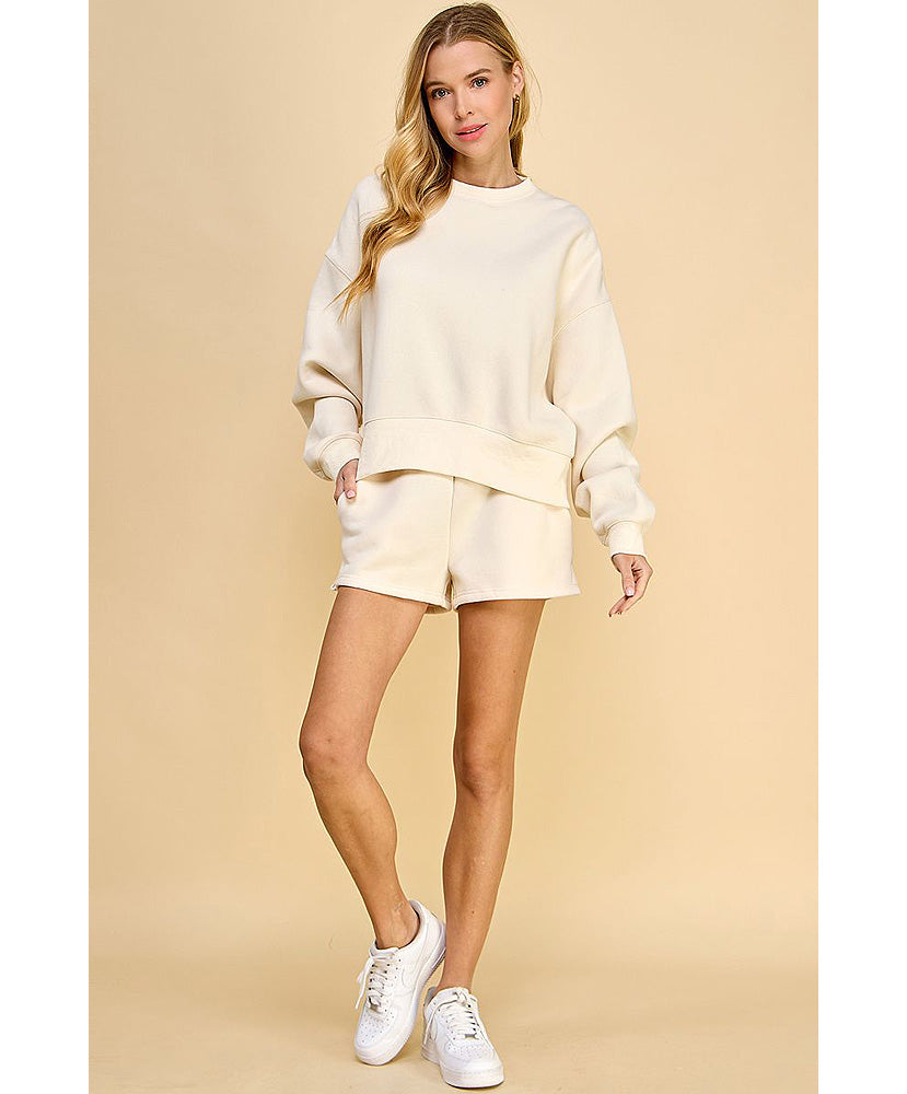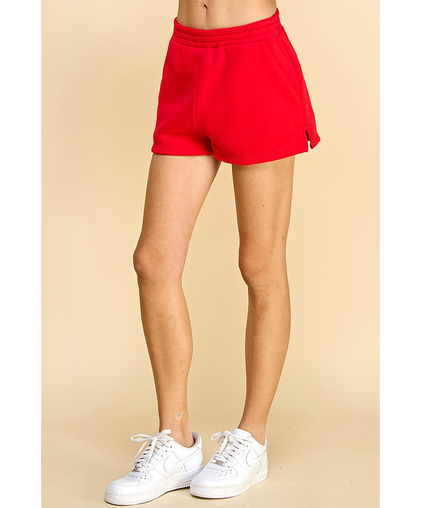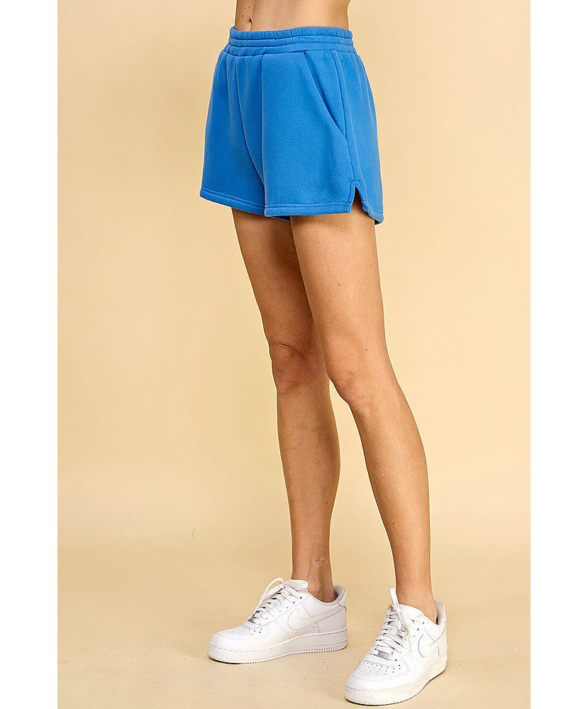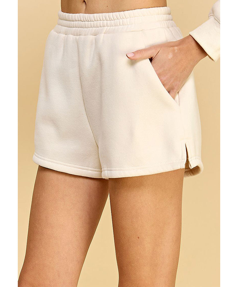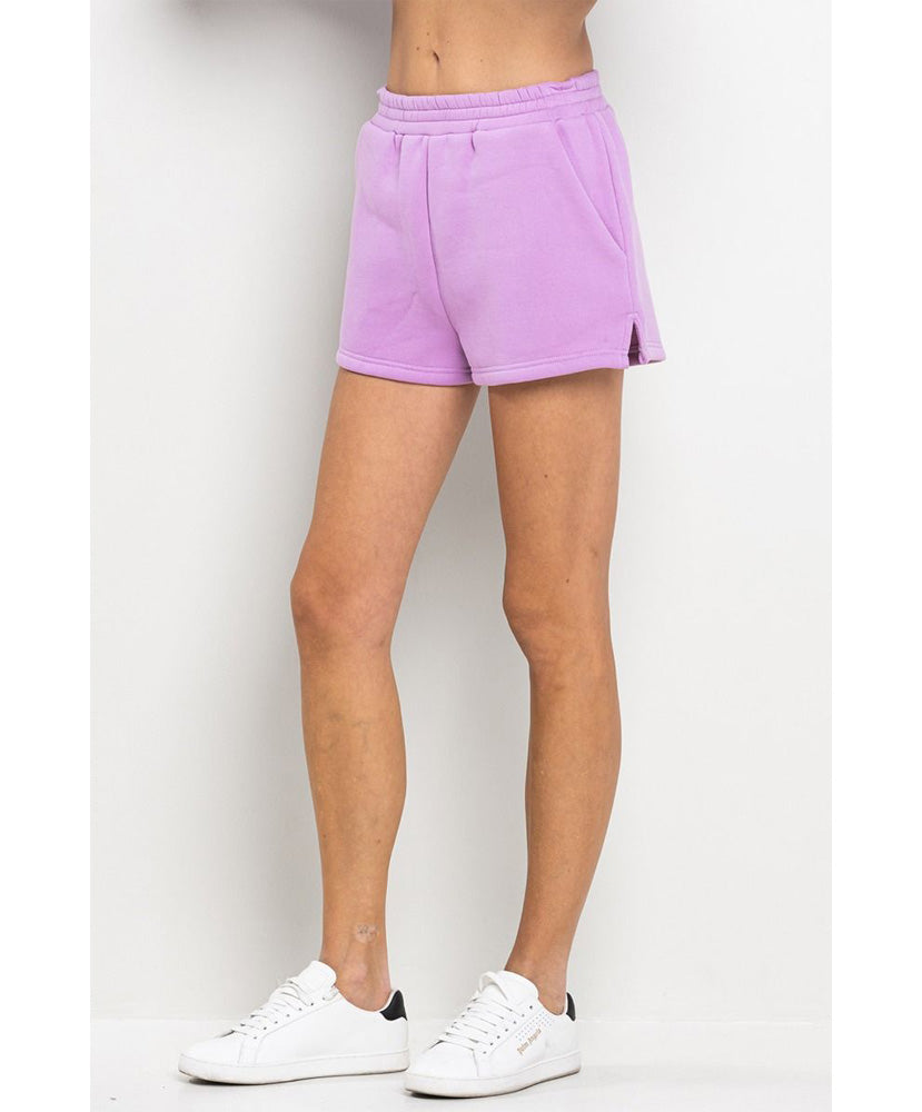 High waisted, sweat shorts with an elastic waistband. Featuring side pockets and tiny slits on each sides.
