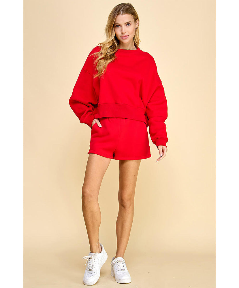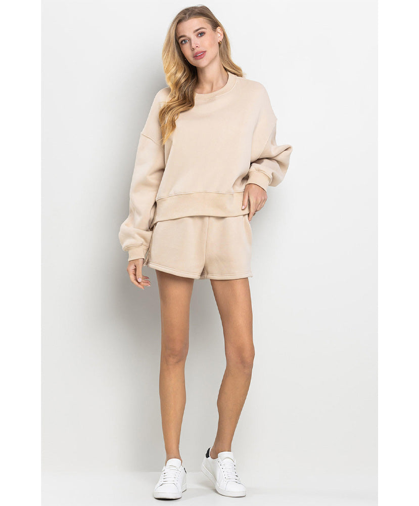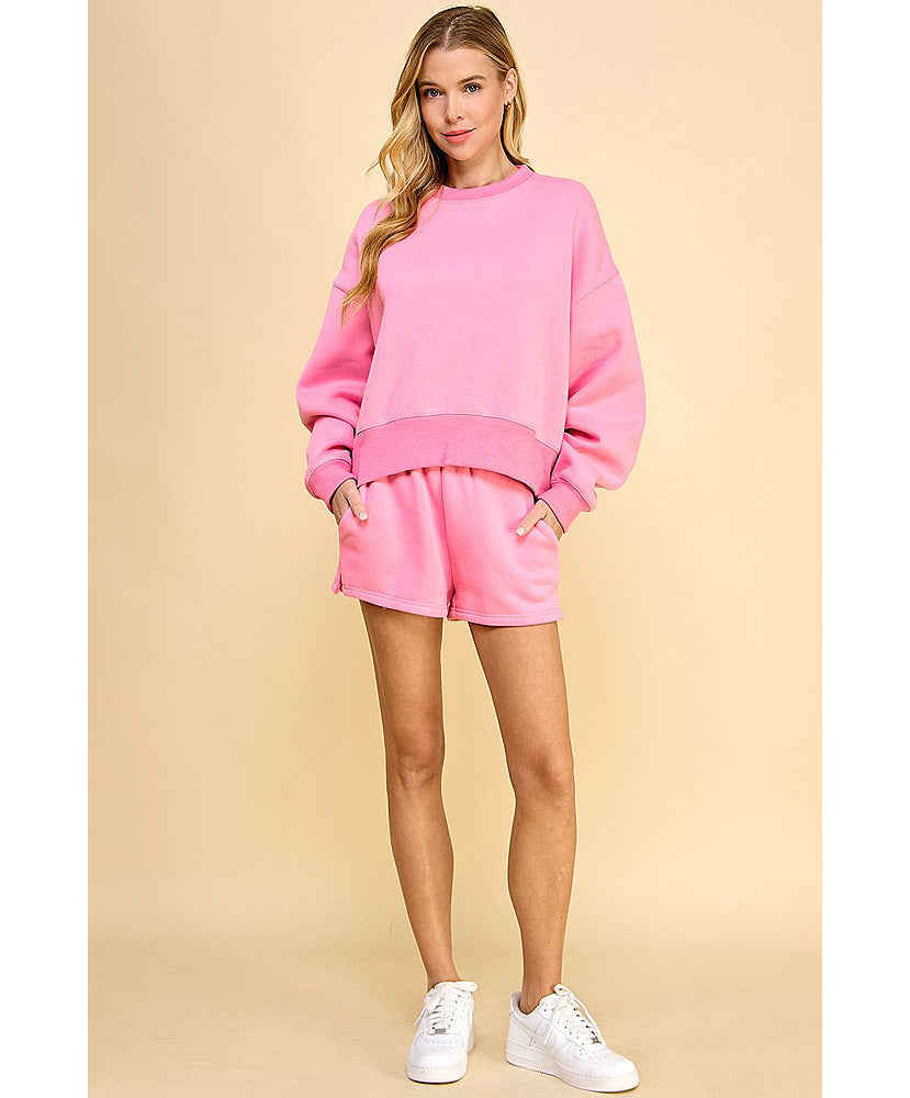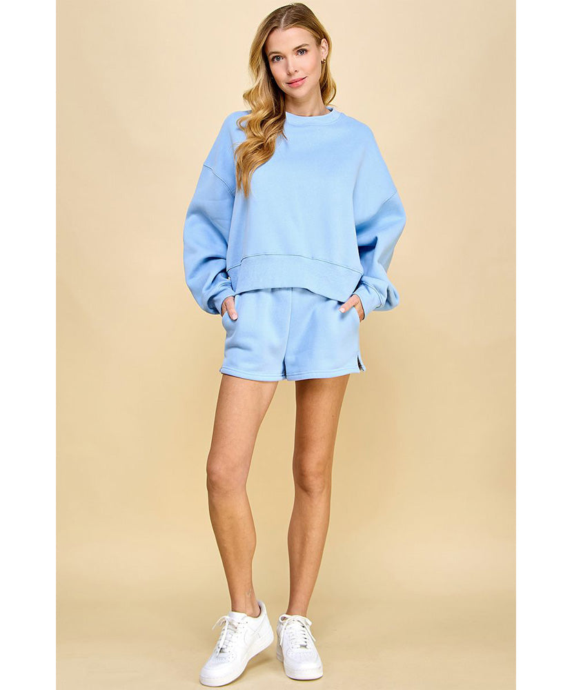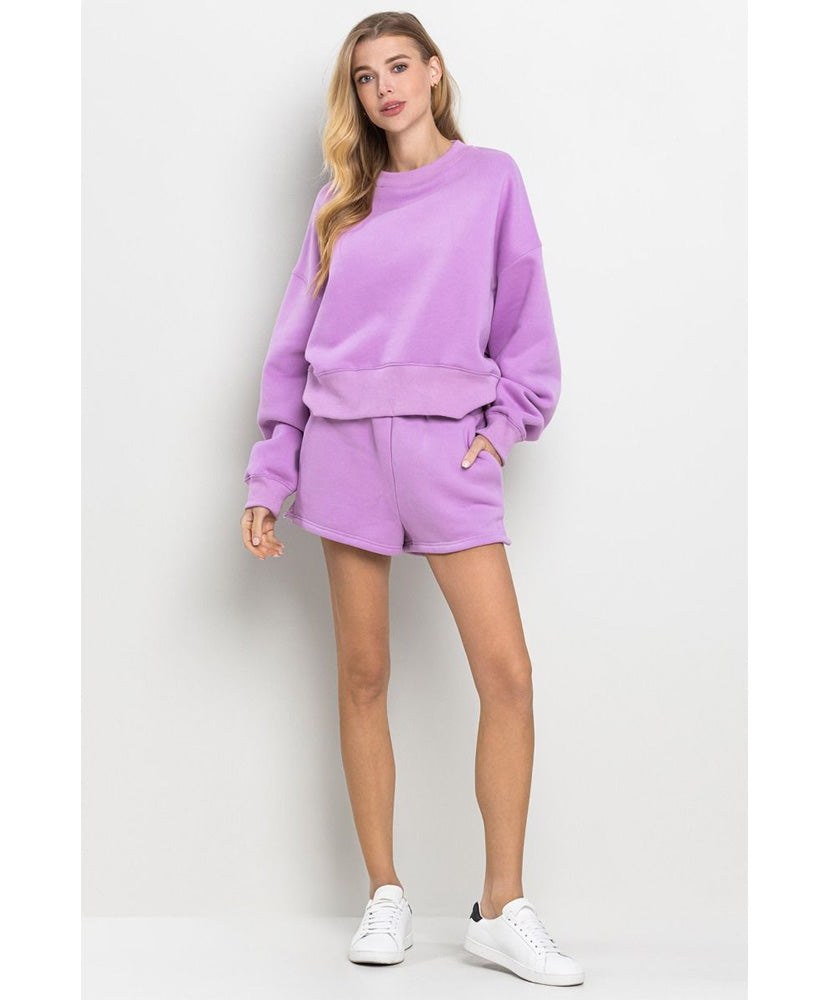 High waisted, sweat shorts with an elastic waistband. Featuring side pockets and tiny slits on each sides.