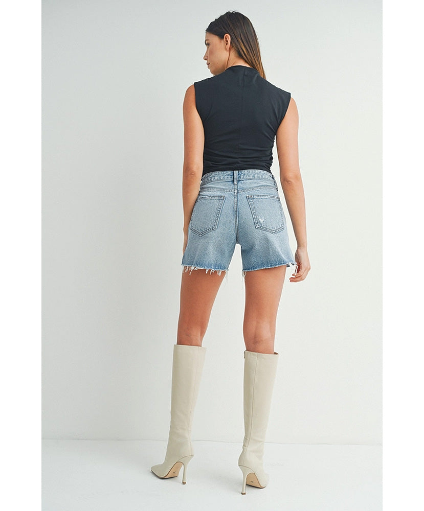 Your live-in, wear-with-anything short for endless summer. This high-rise pair features side slits and a raw hem for a laid-back, lazy-days feel. Available in medium denim.