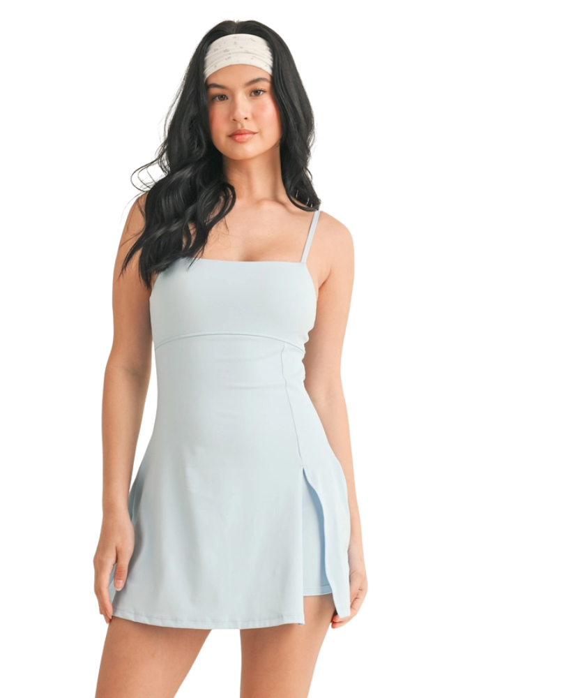 Fall head over heels (or just gracefully leap) for this flirty-meets-functional mini dress. Designed with an A-line silhouette and a cheeky side slit that reveals built-in shorts, she’s the perfect match for every court, class, and coffee date. The square neckline and open back keep it breezy, while adjustable straps give you that just-right fit.