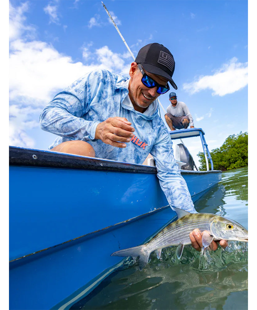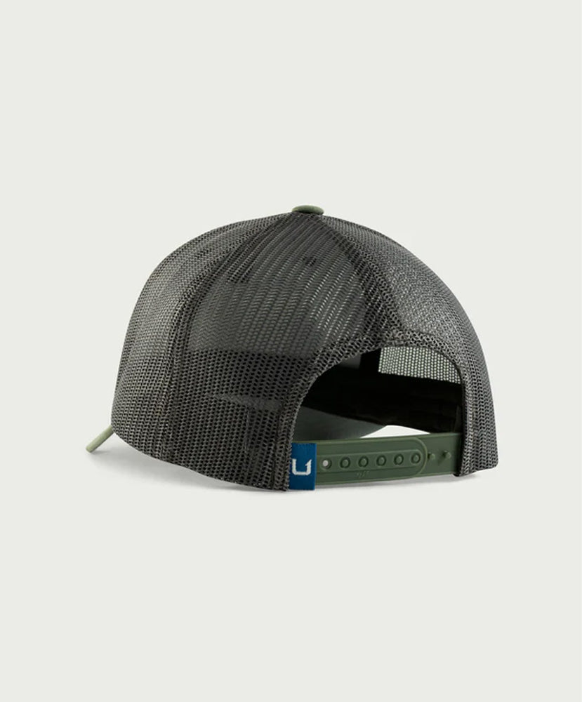 This mid-profile trucker features a 3D embroidery Huk logo on fabric patch and the exclusive Refraction camo. It features a dark gray under visor to fight glare and a comfortable moisture-wicking sweatband.
