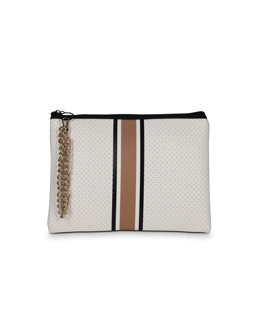 White coated/tan white black stripe. Striped wristlet and chain wristlet.