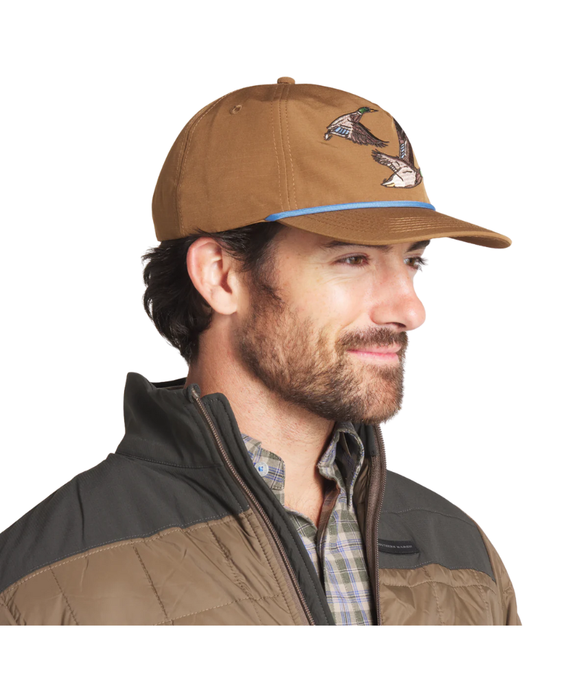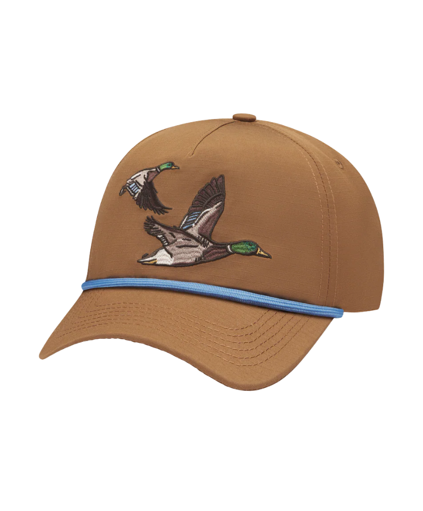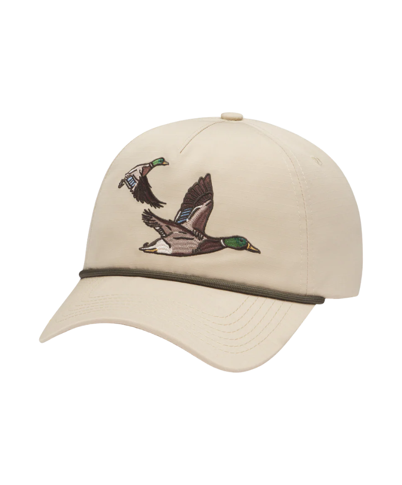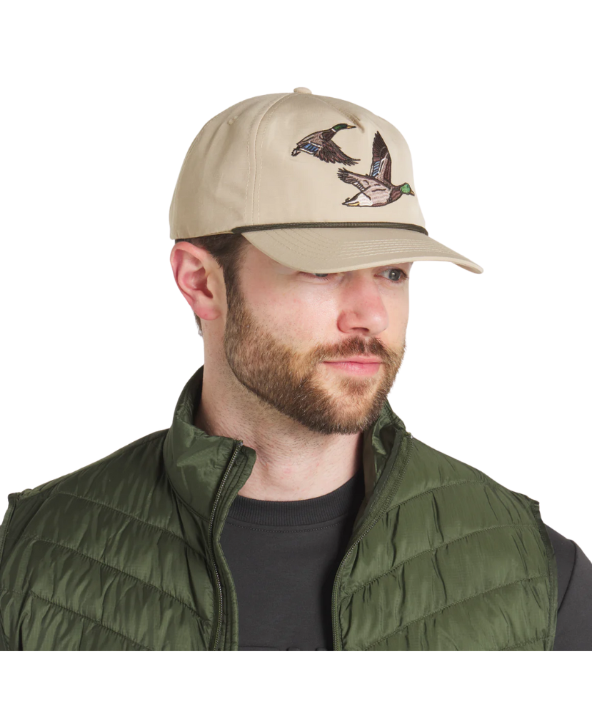 Take flight in style with the Ensenada Rope Hat - Wildlife - Ducks. Featuring a pair of embroidered flying mallards against a rugged ripstop polyester build, this 5-panel snapback is ready for any outdoor pursuit. Lightweight, durable, and finished with a contrast rope detail across the brim, it’s a perfect blend of function and field-inspired style. Whether you’re in the blind or around town, this hat is your go-to for comfort and adventure.