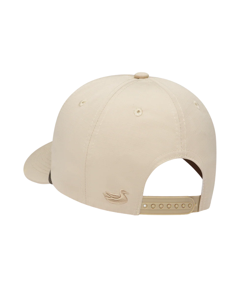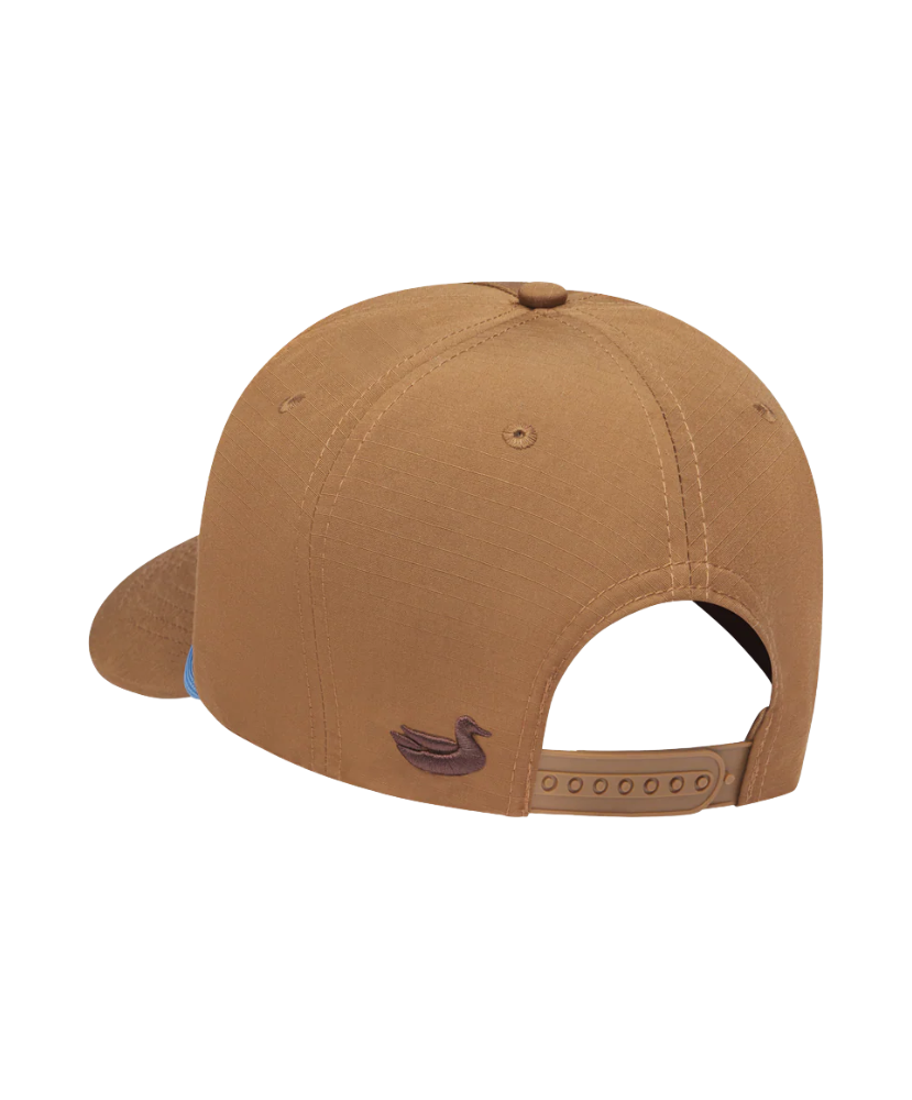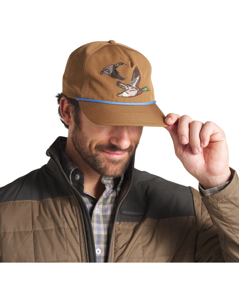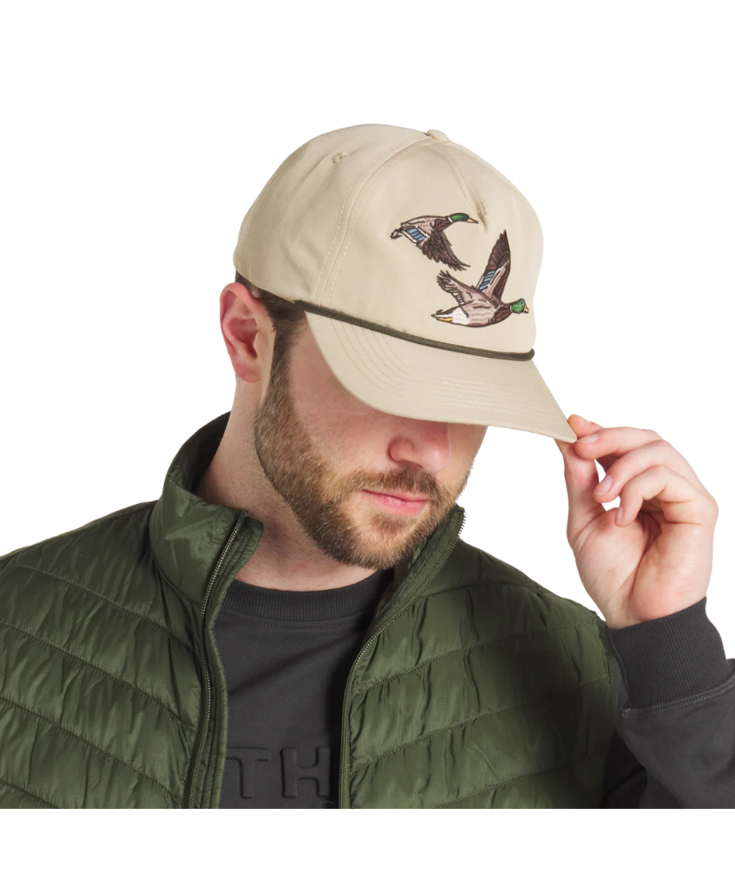 Take flight in style with the Ensenada Rope Hat - Wildlife - Ducks. Featuring a pair of embroidered flying mallards against a rugged ripstop polyester build, this 5-panel snapback is ready for any outdoor pursuit. Lightweight, durable, and finished with a contrast rope detail across the brim, it’s a perfect blend of function and field-inspired style. Whether you’re in the blind or around town, this hat is your go-to for comfort and adventure.