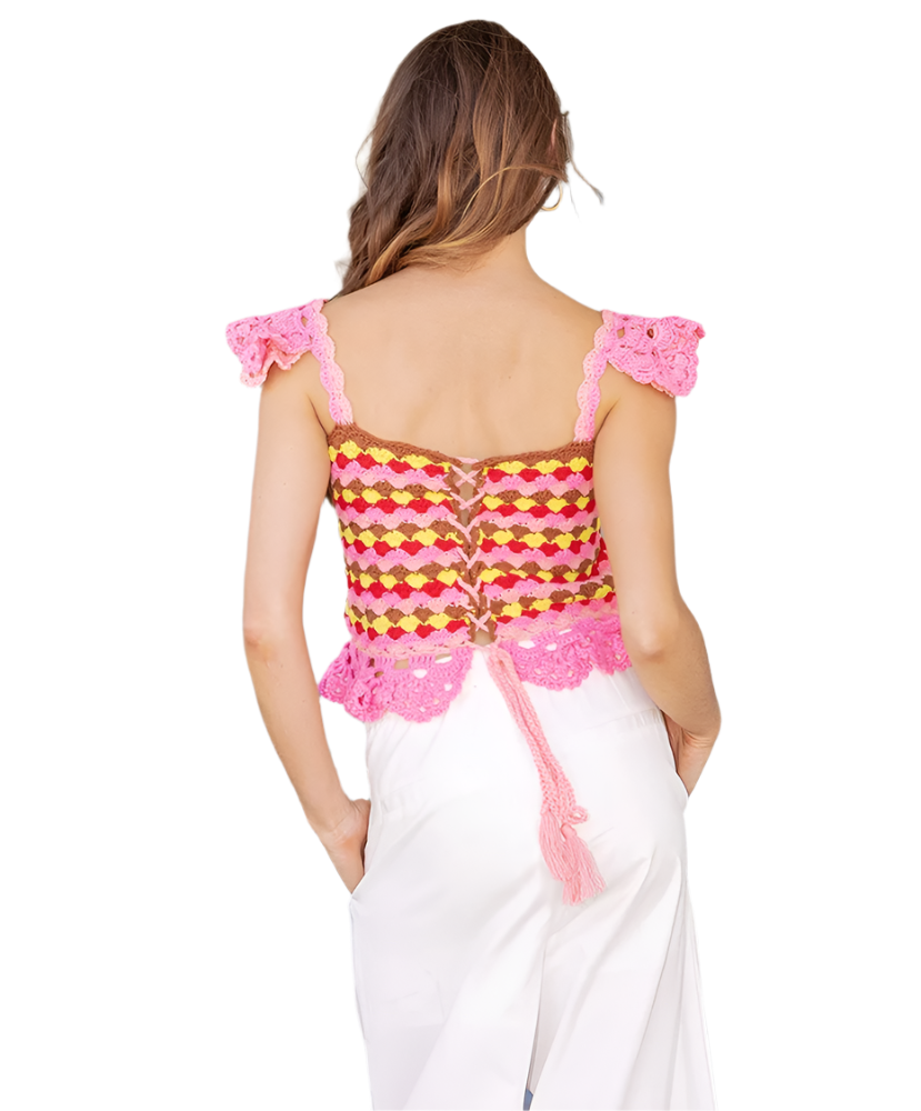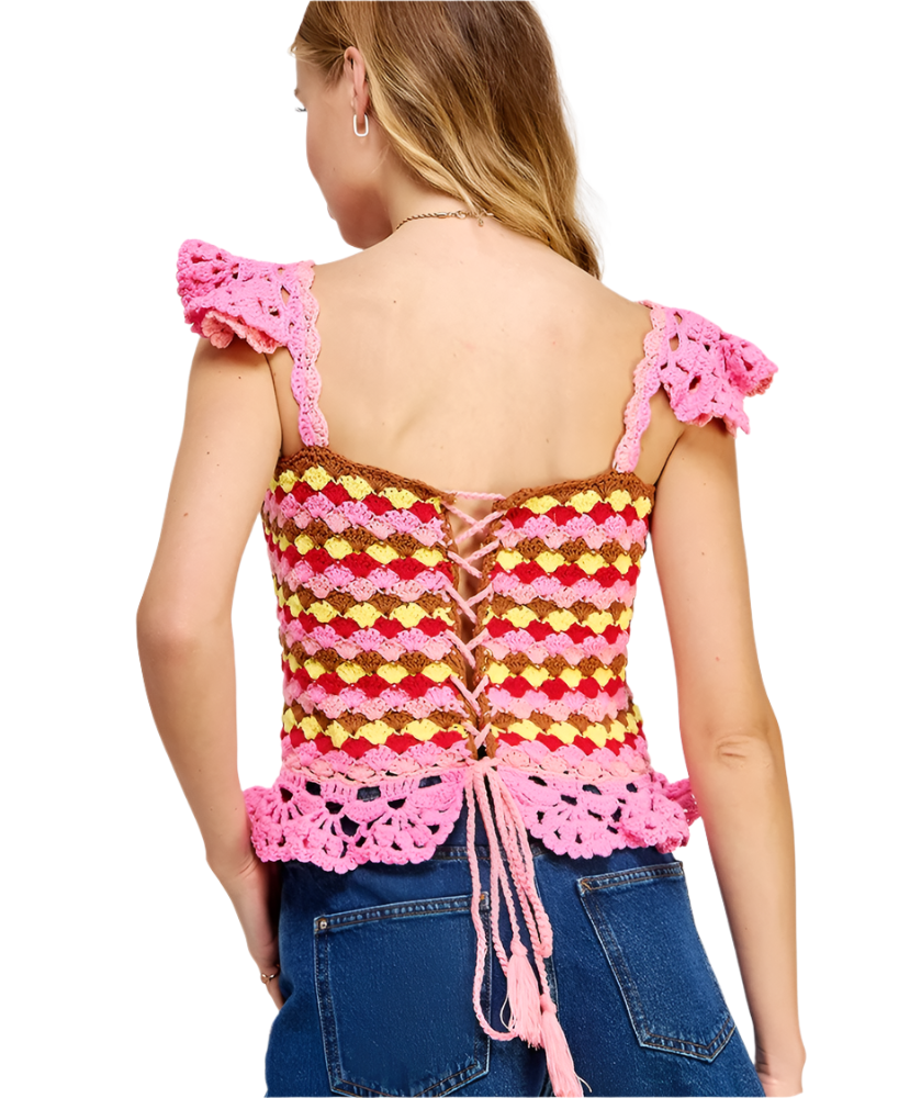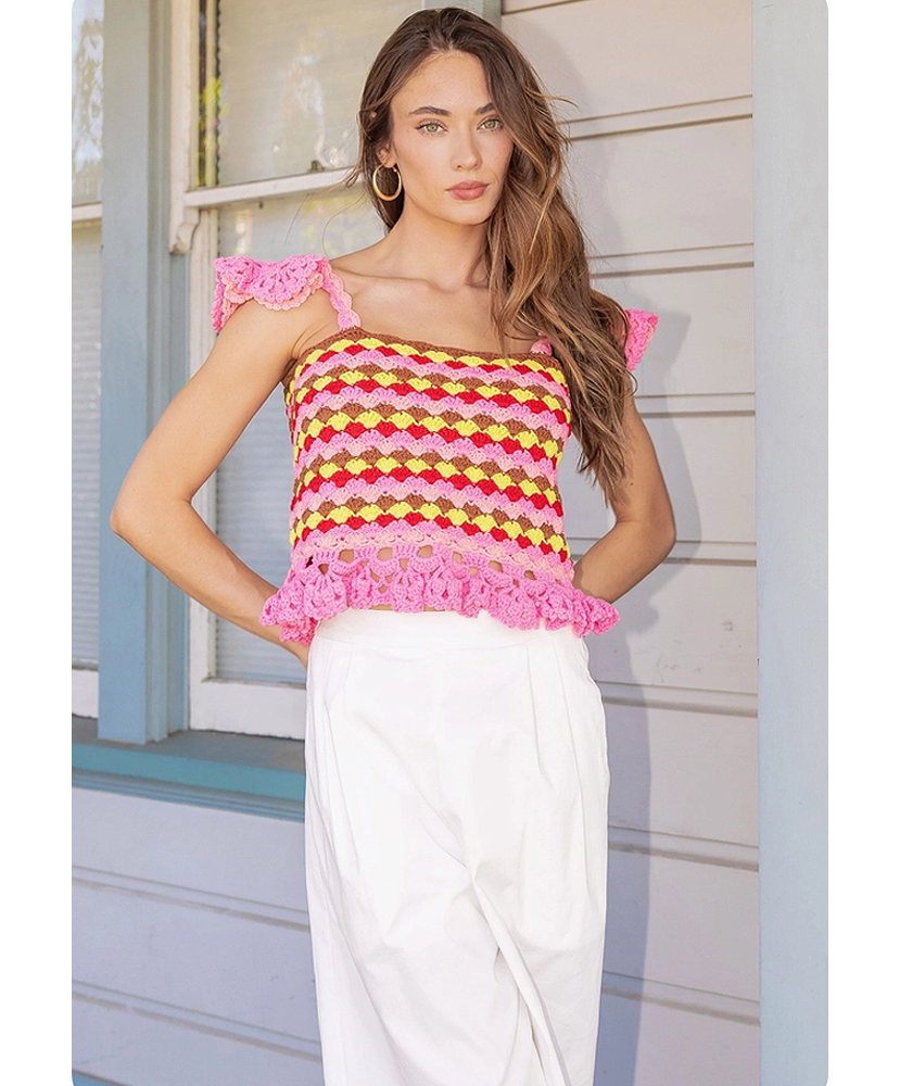 Knit crochet top with ruffle detail. This tank top features adjustable crisscross detail at the back, shoulder straps with ruffle detail, and a ruffled peplum hem.
