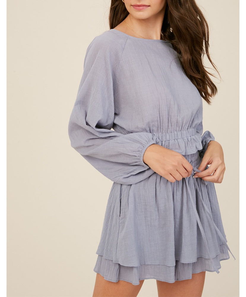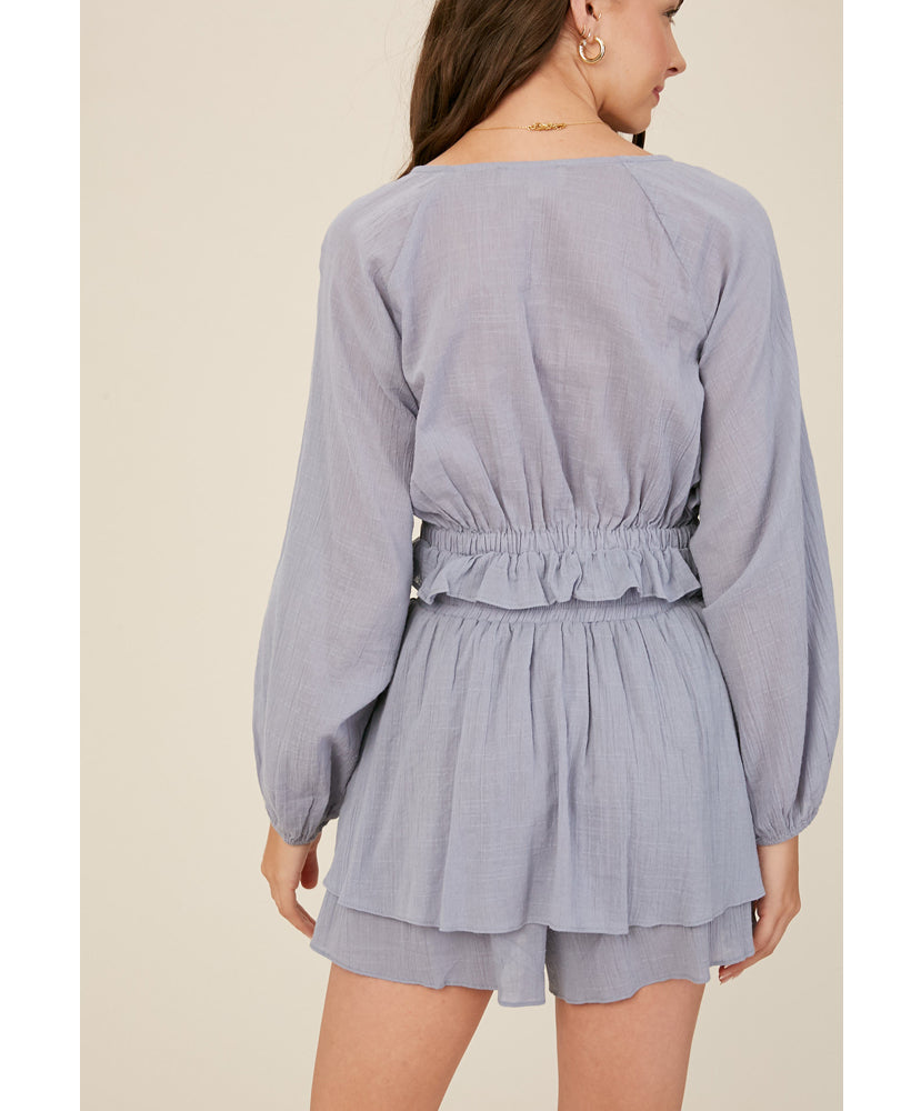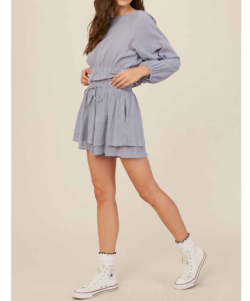 Ruffle hem crop top and layered wide short set. Shorts have pockets. Lined. Linen textured cotton woven fabric.