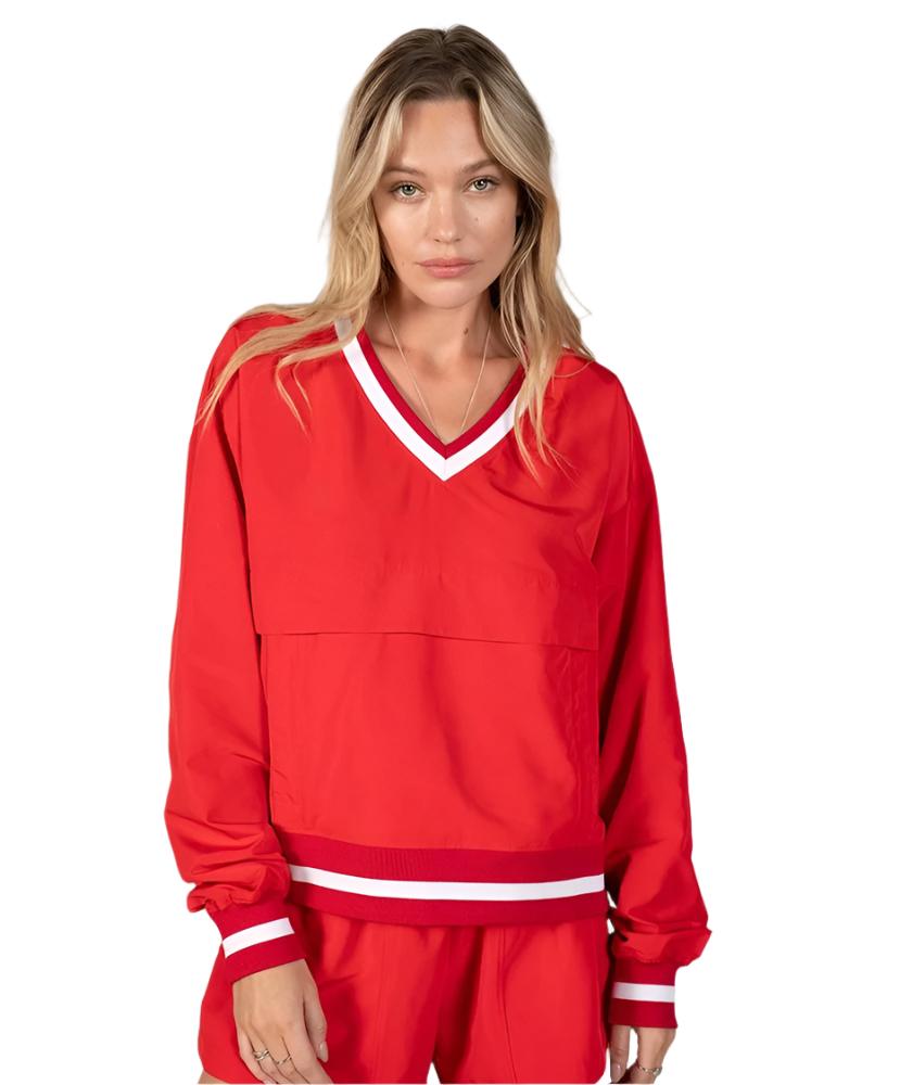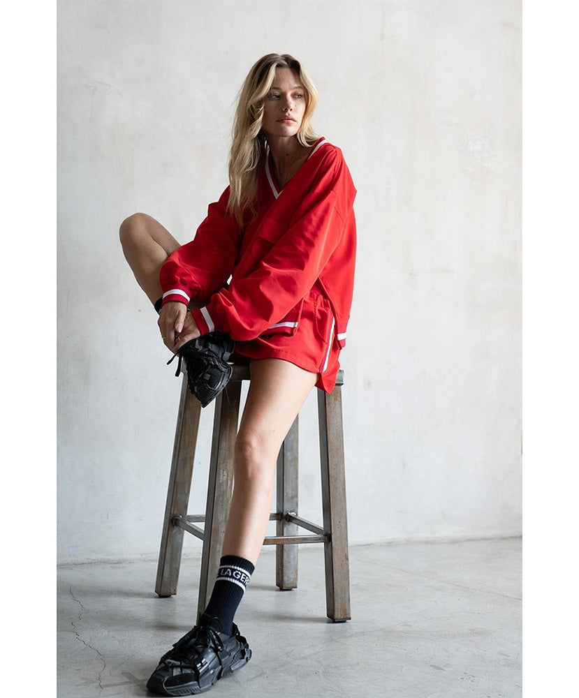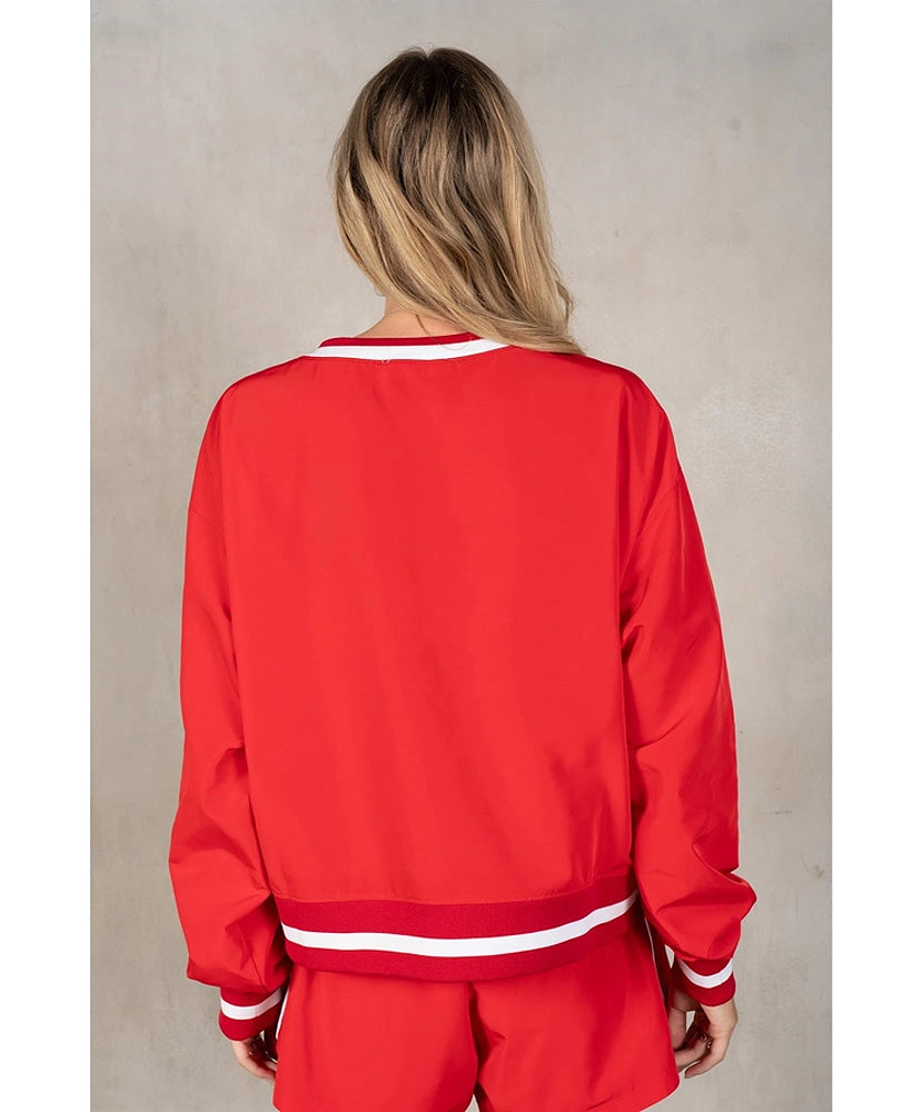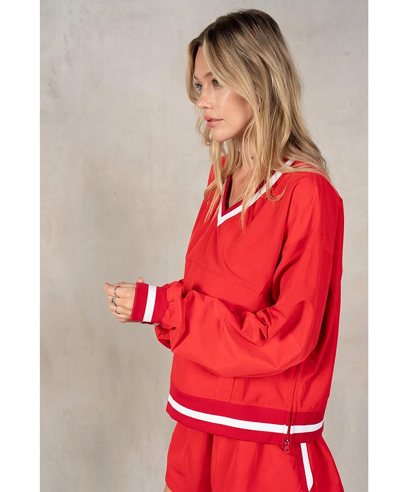 This windbreaker top features a V-neck, long sleeves, and contrast rib tape for extra detail. It also includes convenient zipped pockets.