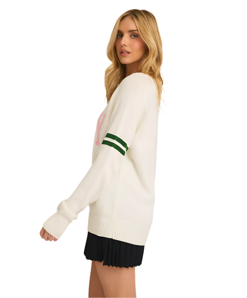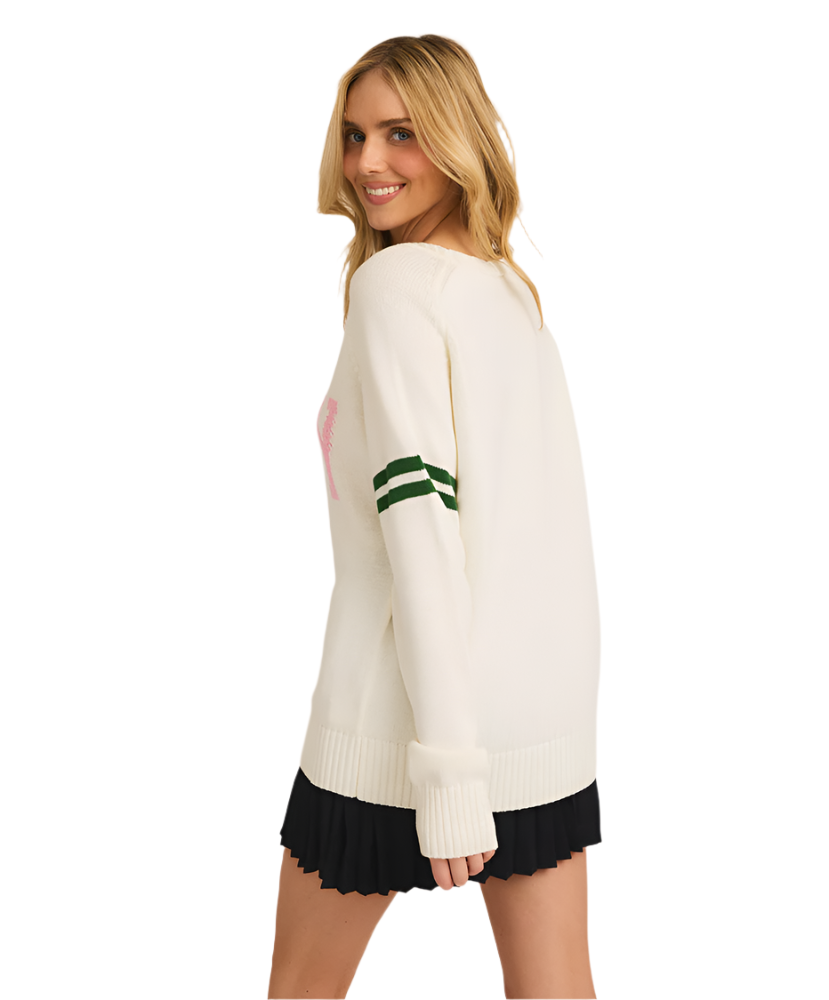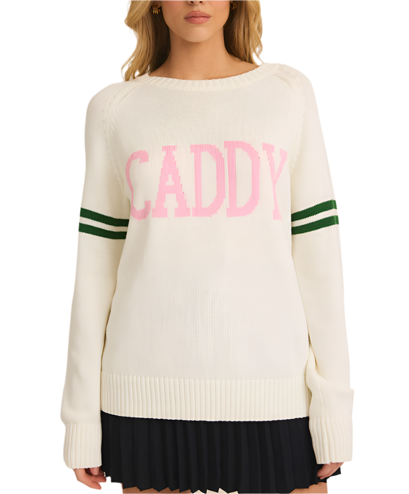 The Golf Caddie Sweater boasts elegant white long sleeves and a lightweight design, perfect for a sophisticated day on the course. Adorned with a subtle pink and green golf caddie design, this sweater adds a touch of luxury to your golf wardrobe. Elevate your style on and off the green.