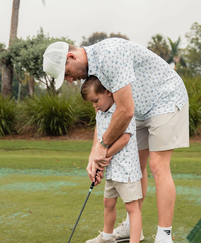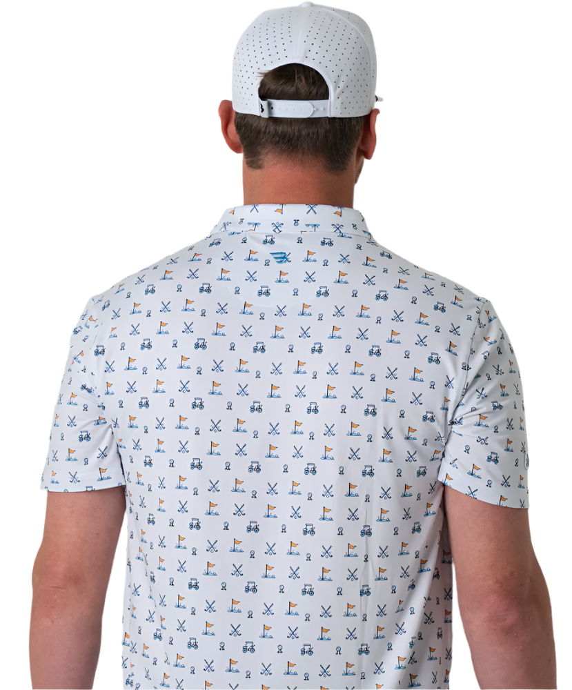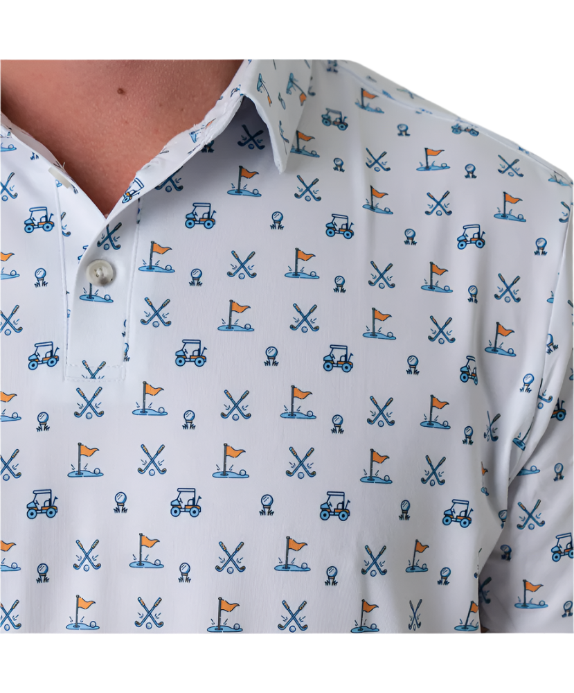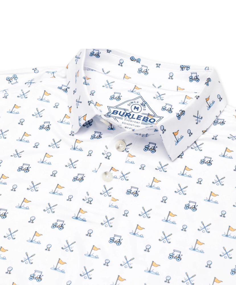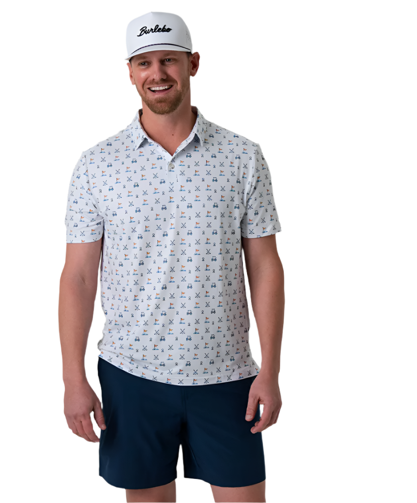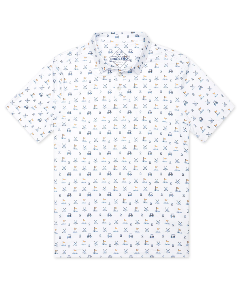 Stay cool and comfortable with The Hole In One Polo performance polo in golf cart and clubs print. Burlebo moisture wicking polos are breathable and quick-drying.