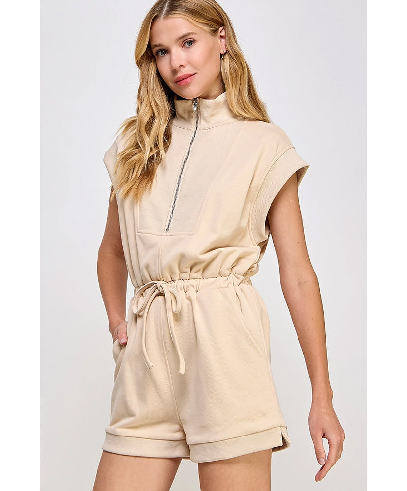 Pullover style rib knit contrast romper in stretch knit fabric. This sleeveless playsuit features contrast ribbed knit detail at the yoke/chest/cap sleeve/hem, shorts with side pockets, zipper closure at front, cinched elasticated waist with drawstring tie, and a mock neck.