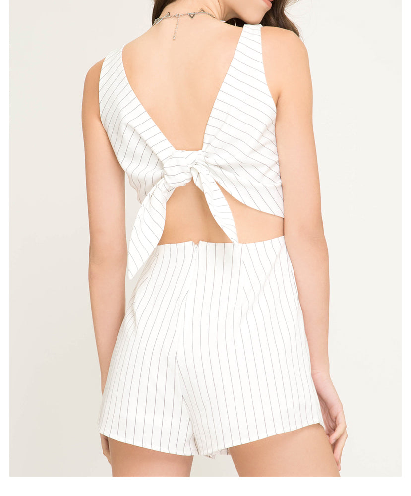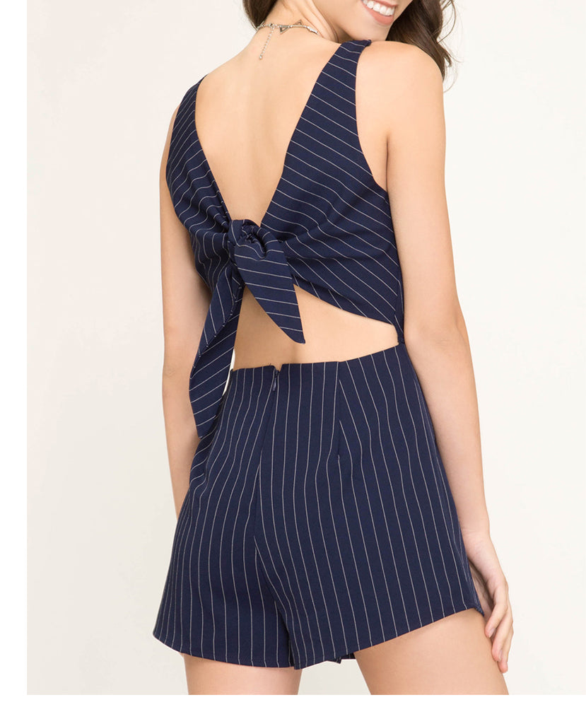 She + Sky - SL7434 - Sleeveless Woven Striped Romper w/ Back Tie Detail