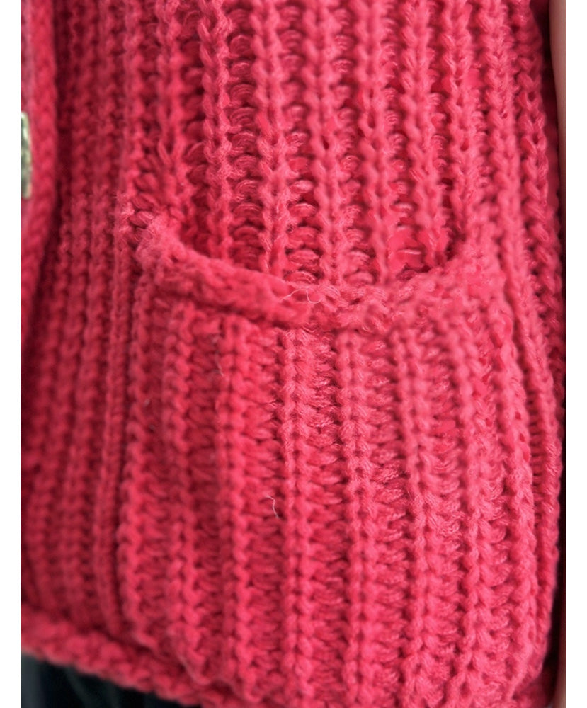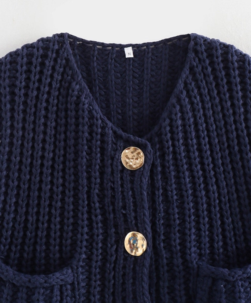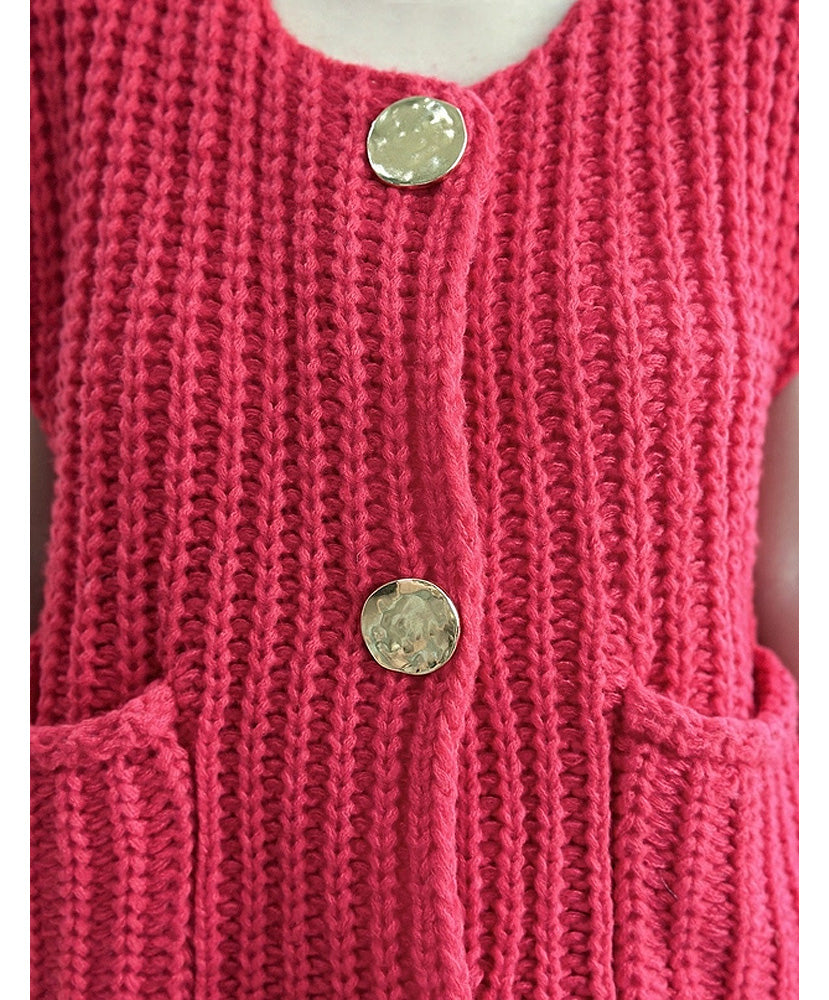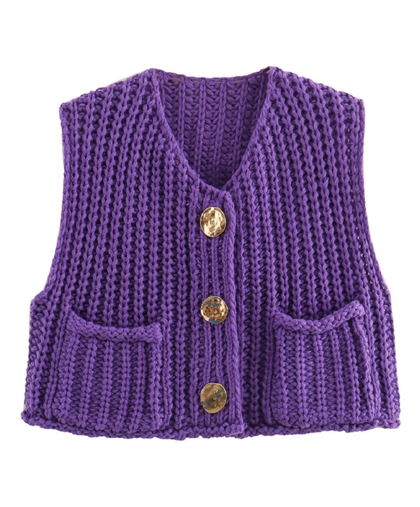 This knit sweater vest features a modern and trendy boxy cropped fit, complete with convenient front pockets and a hammered gold statement button closure. Stay stylish and cozy with this versatile addition to your wardrobe.