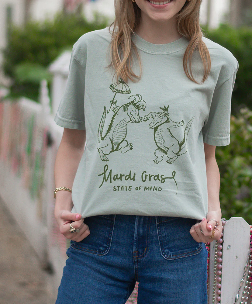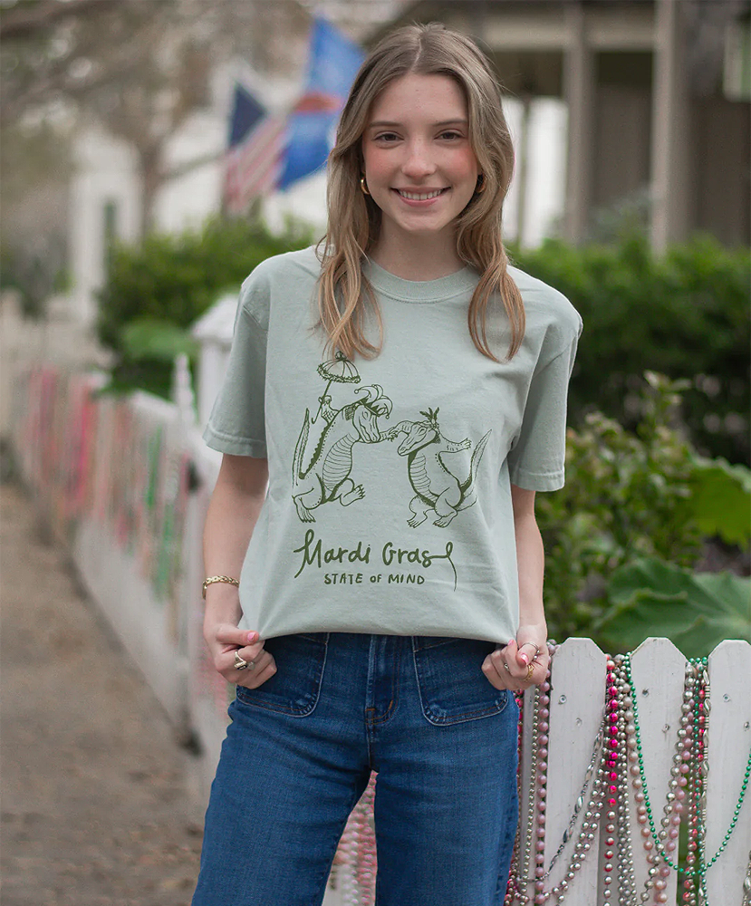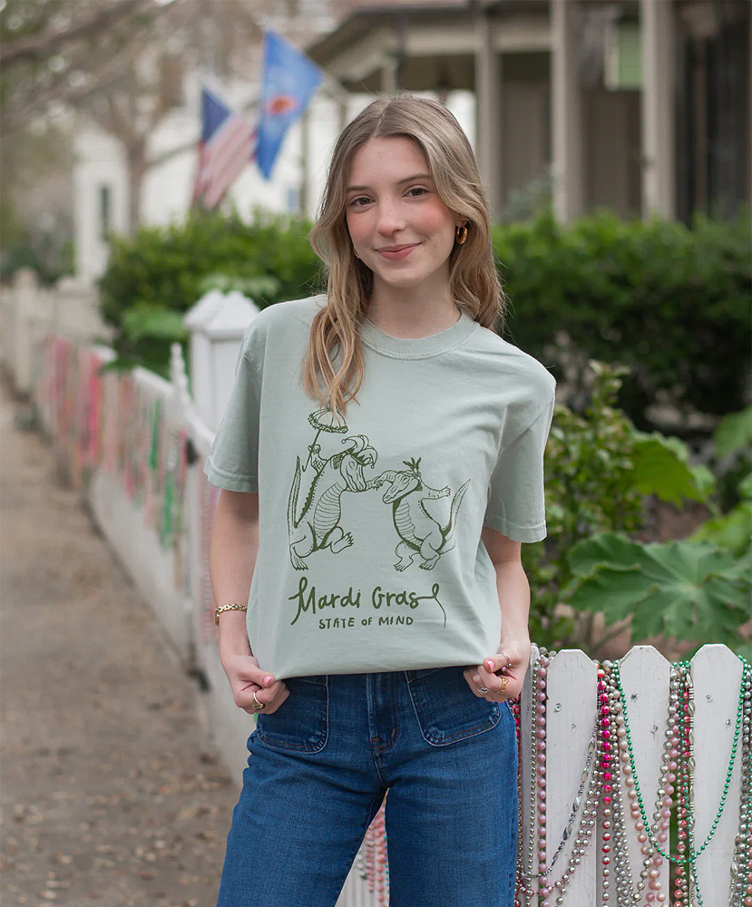 Celebrate Mardi Gras with a touch of Louisiana charm! The Gator State of Mind t-shirt features a hand-illustrated design of two gators enjoying the festivities. This comfortable and stylish tee is perfect for parades, parties, or everyday wear.