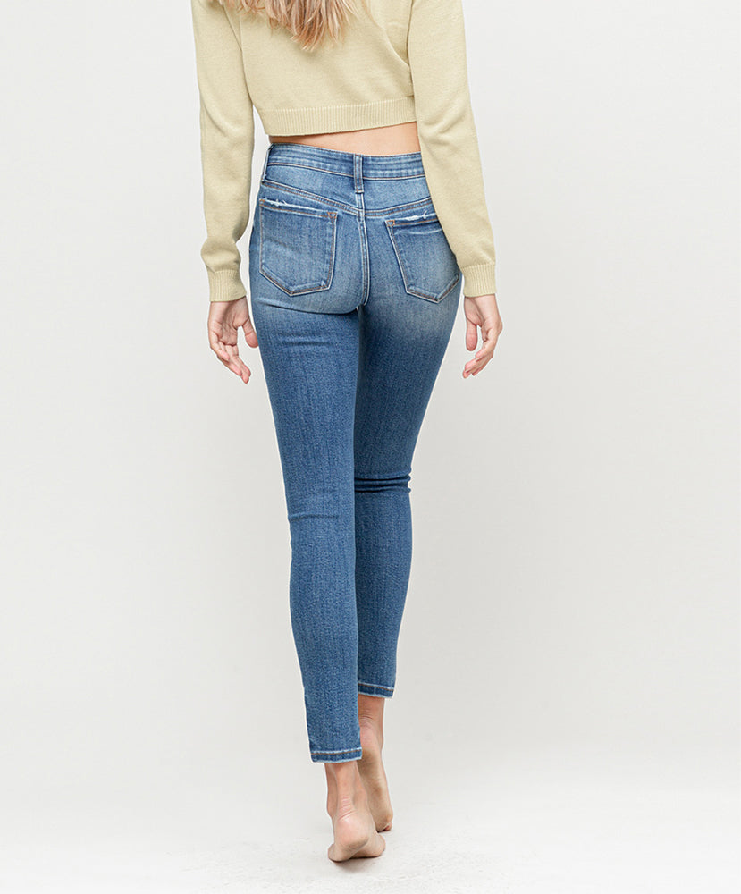 Mid-rise skinny jeans with one knee distressed. 65% Cotton / 31% Polyester / 2% Rayon