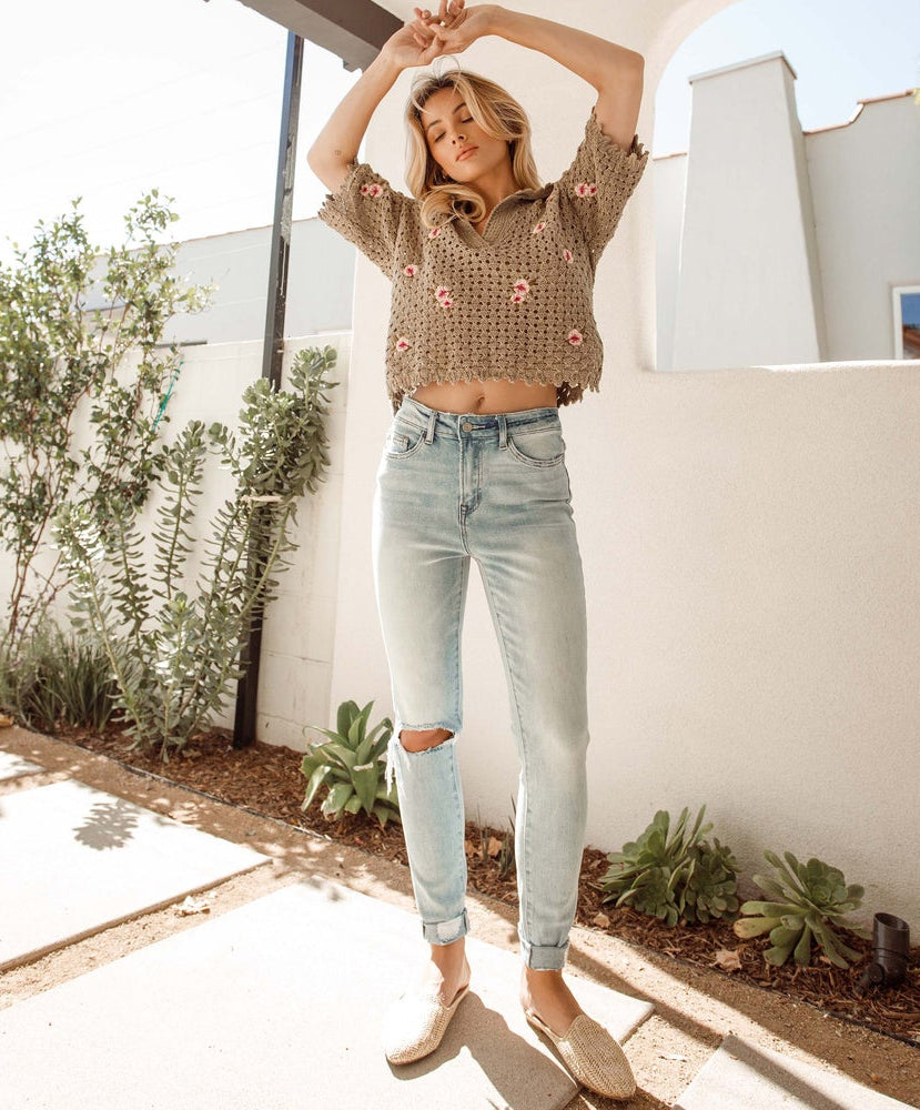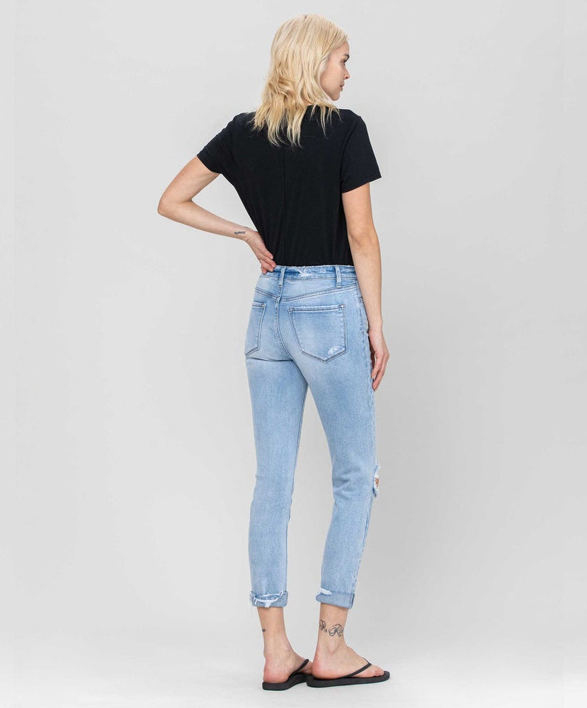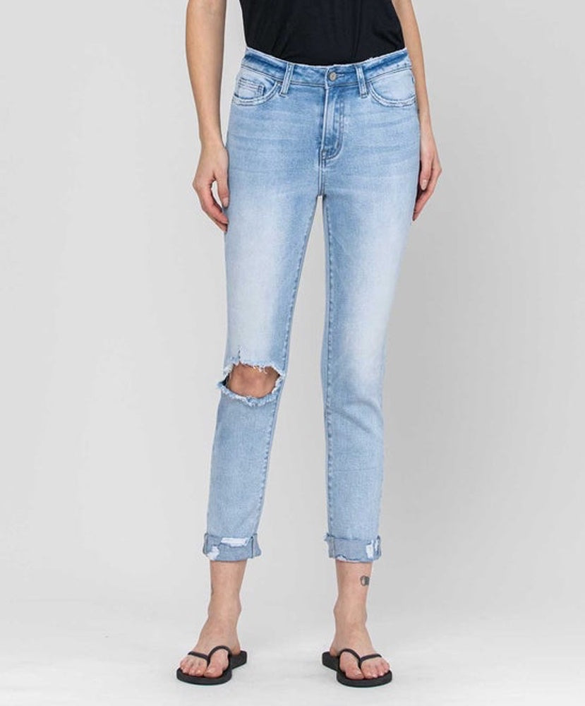 Light wash high-rise slim crop with double cuff.