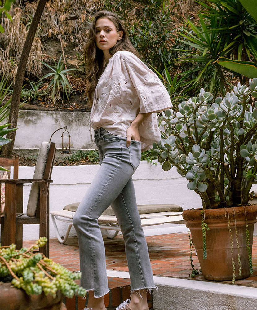 Comfort-stretch denim, high-rise waist, uneven hem, and zip fly closure.