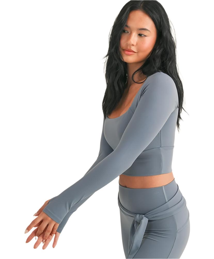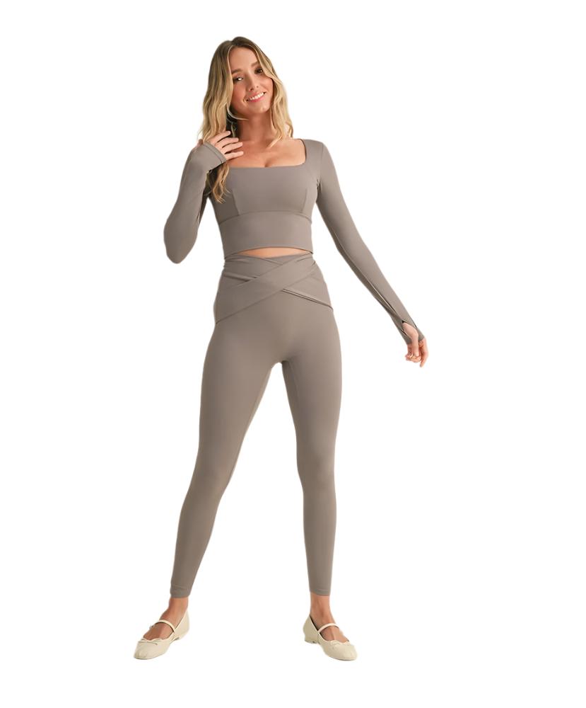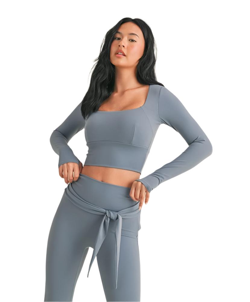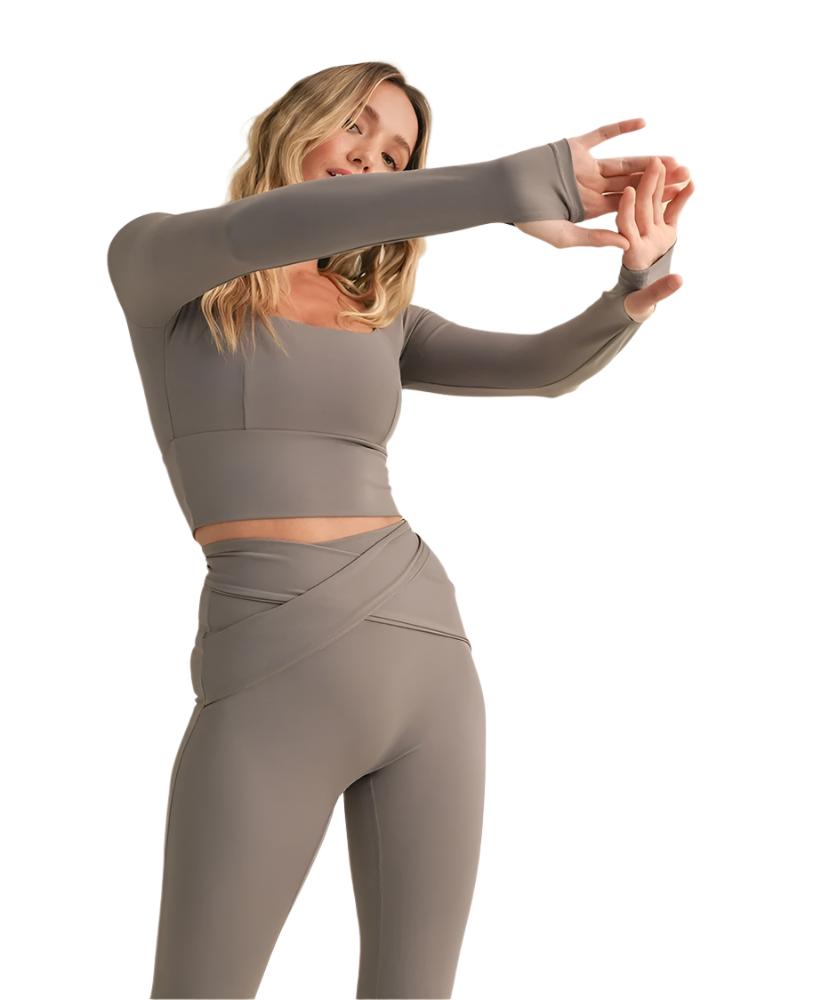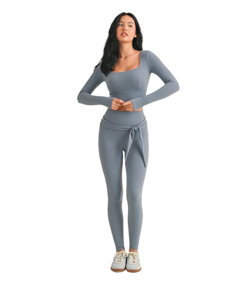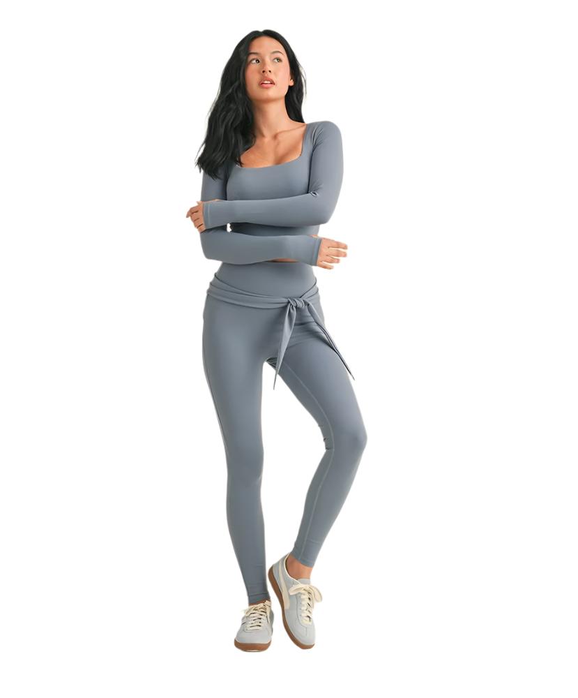 Ballet-inspired set with a long sleeve square neck top and tie waist leggings. Top has thumbholes and removable padding.