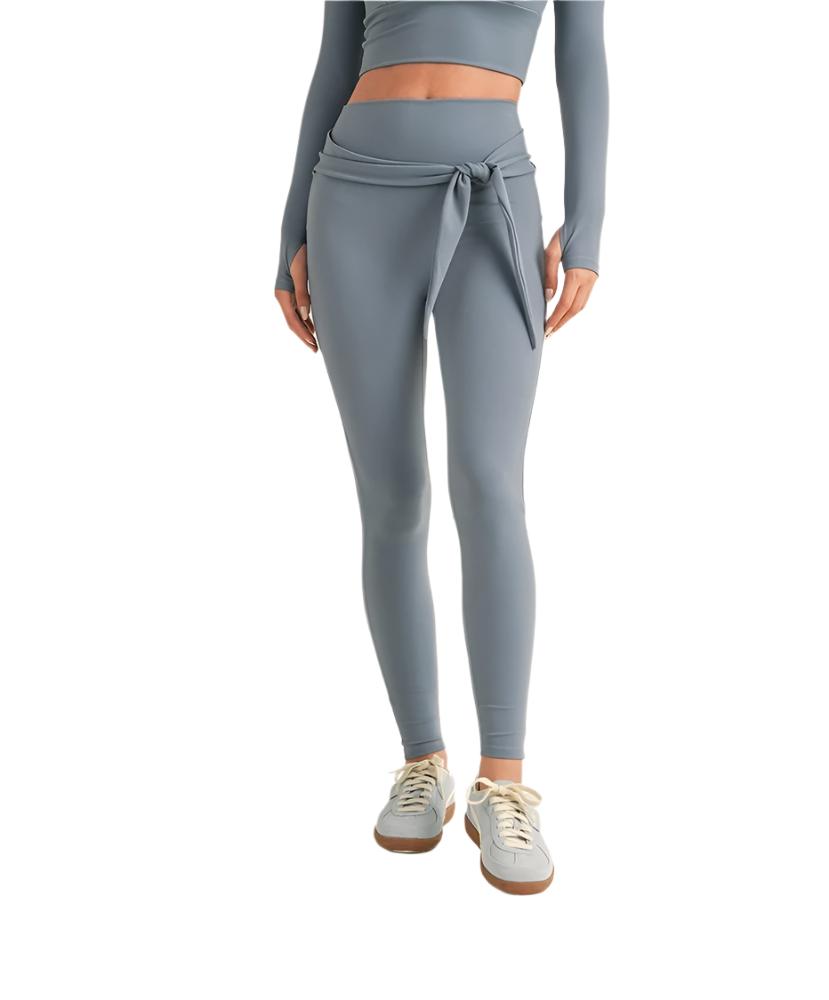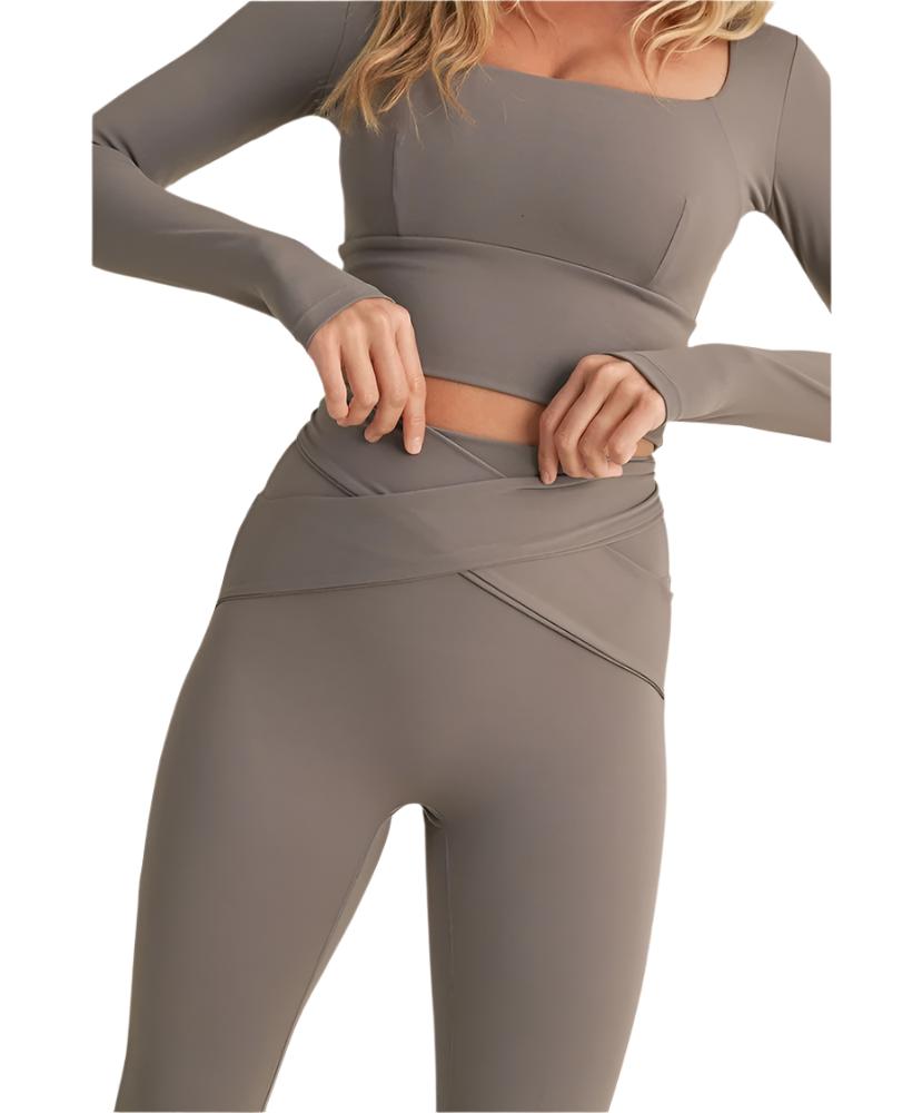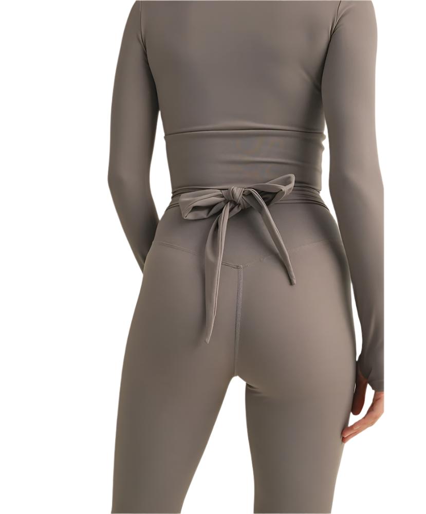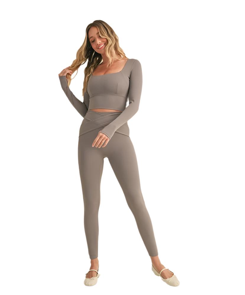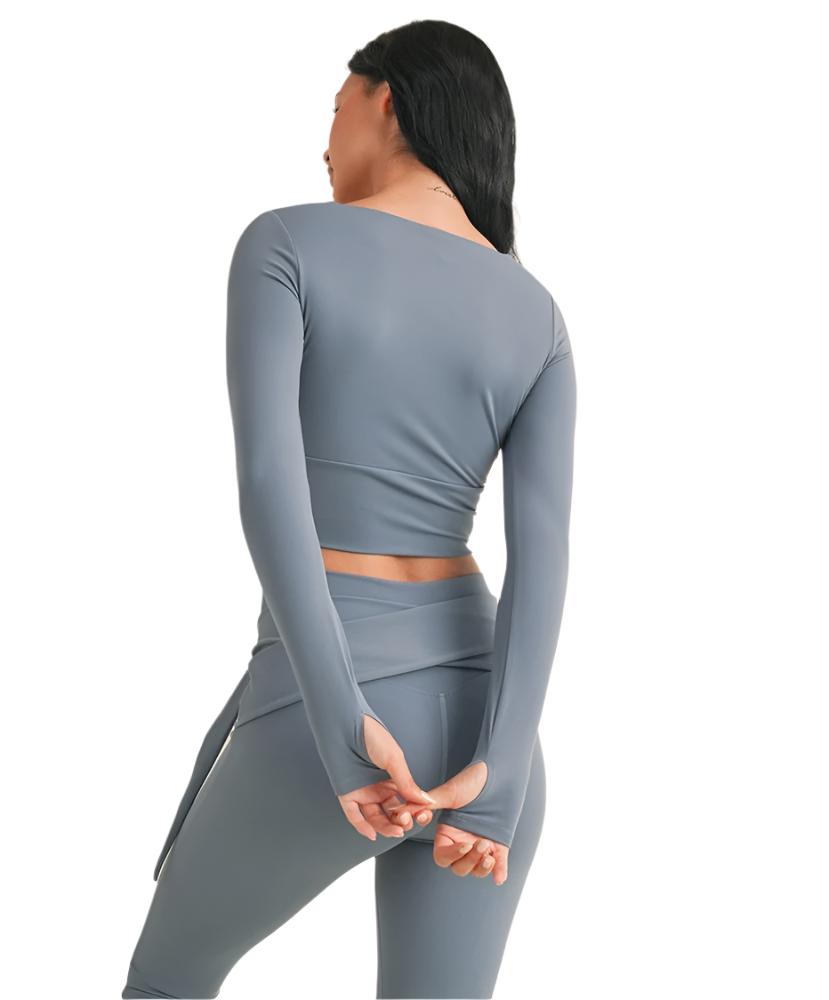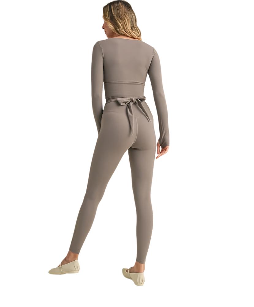 Ballet-inspired set with a long sleeve square neck top and tie waist leggings. Top has thumbholes and removable padding.